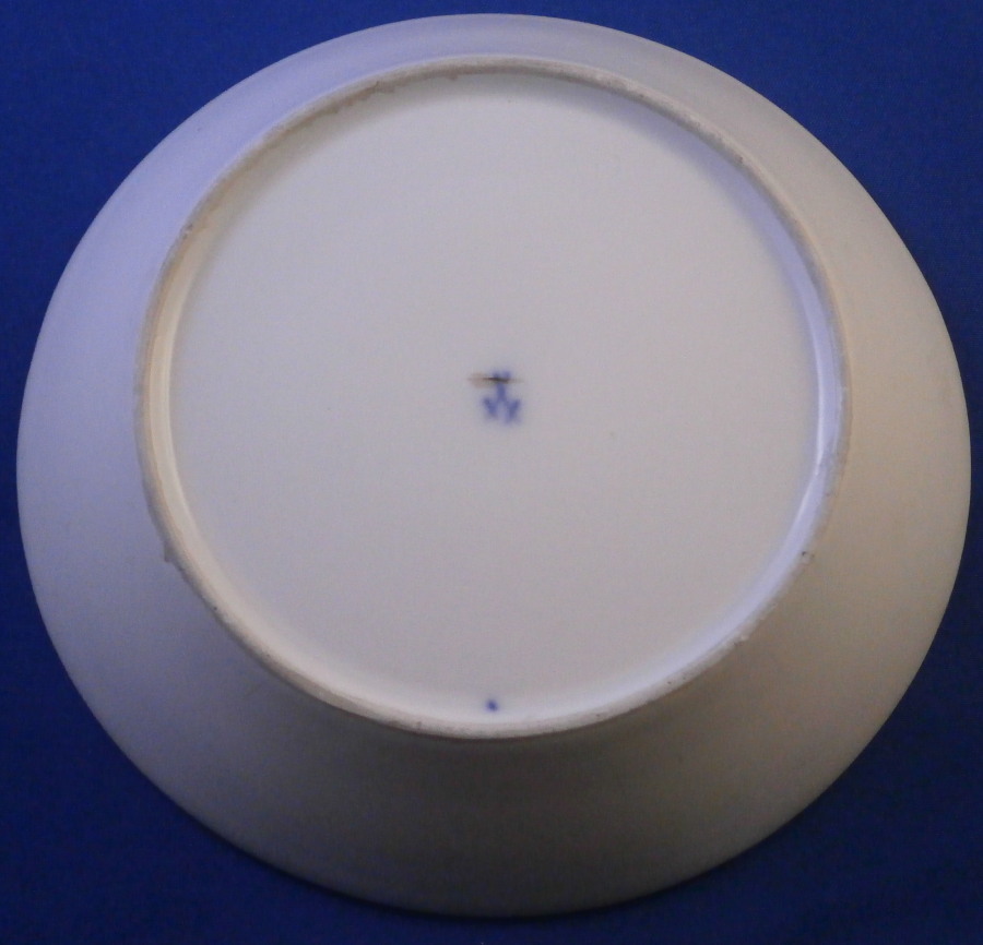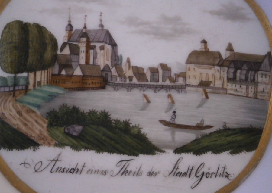 This is a saucer made by Meissen in in the early 19th century during the Schmierzeit period. It is hand painted with a scene of a part of the city of Görlitz which is the largest town of the former province of Lower Silesia in what used to be East Germany near Poland. The scene includes a dirt road with some nice trees lining it, lots of buildings in the background and some water in the front with a boat on it. It is nicely done and the subject is not one I ahve come across before. The center of the plate has a gold ring around it as does the edge of the rim.The piece is in nice condition with a minor touch of wear to the gold mainly around the well of the dish. The saucer is 1.125 inches tall and has a diameter of 5.375 inches and is marked underneath with the under glaze blue crossed swords as well as the usual impressed number and a blue dot near the foot ring. The mark has one cut across it denoting it to be a second choice piece. Please email me for more information or other pictures.