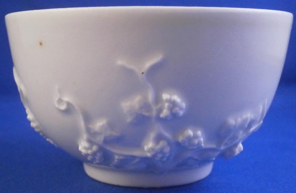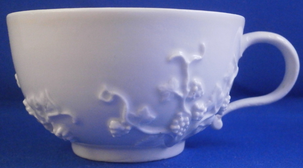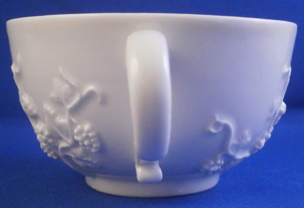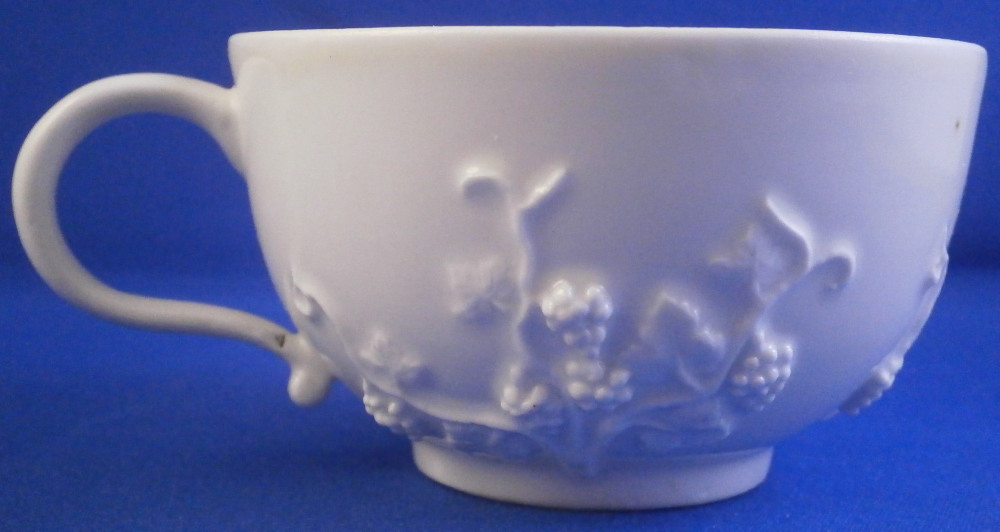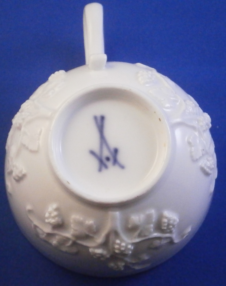This is a nice blanc de chine cup and saucer made by Meissen around the mid 18th century. The top of the saucer and inside of the cup is just simply white but the underside of the saucer and outside of the cup are nicely decorated with the grape vine or trailing vine pattern in relief. Not one you see very often at all. The white pieces were more valued than the painted ones during this time since it showes off the porcelain they were so proud of. The set is in great condition with two tiny black firing spots on the top side of the saucer and one to the otuside of the cup from when it was made plus a crack to the bottom terminal of the cup as shown. The saucer is marked with the under glaze blue crossed swords mark as shown used until 1763 while the cup has the dot mark used starting in 1763 so the set dates right to around this year. Both also have an impressed number. The cup is 1.875 inches tall with a diameter of 3.125 inches while the saucer is 5.5 inches in diameter and 1.25 inches tall. Please email me for more information or other pictures.