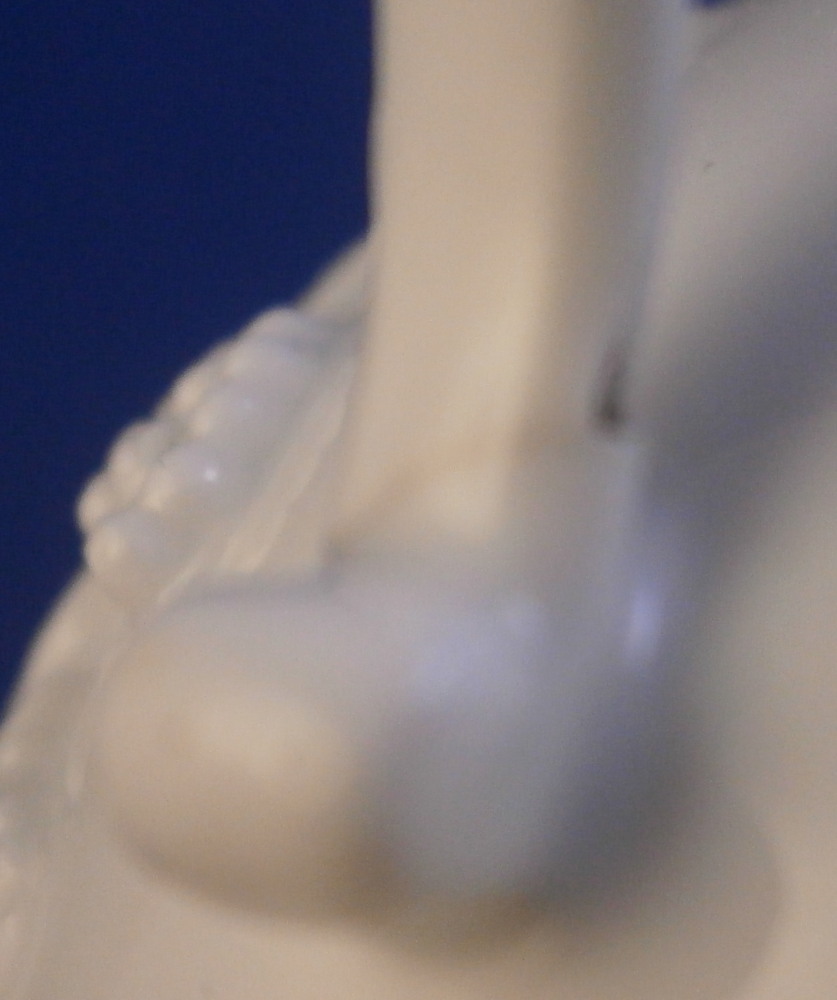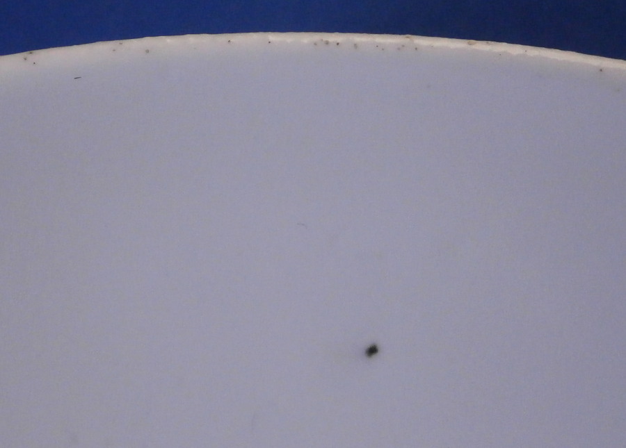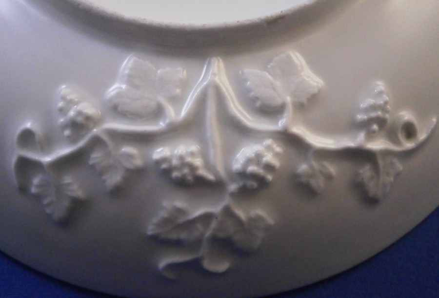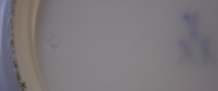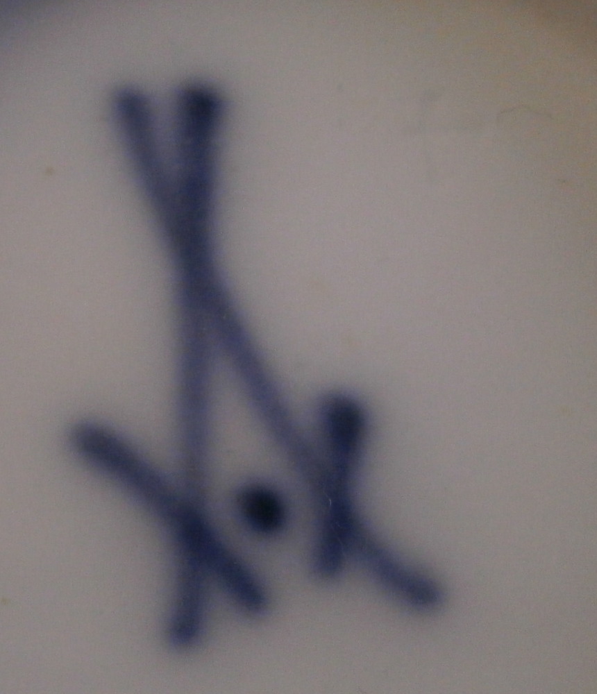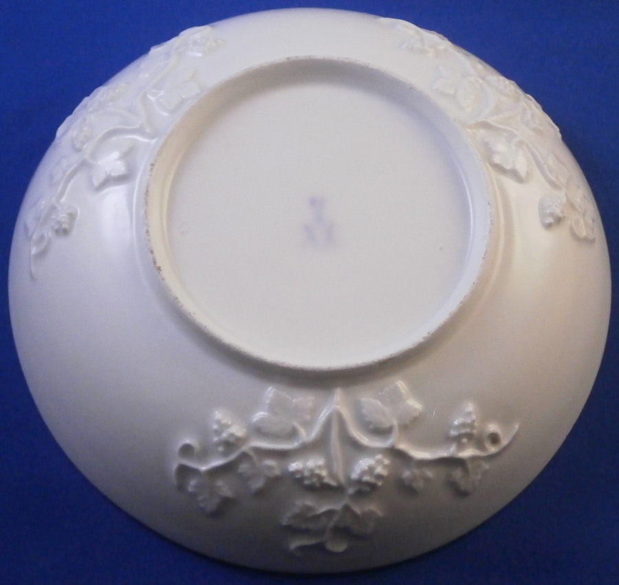 This is a nice blanc de chine cup and saucer made by Meissen around the mid 18th century. The top of the saucer and inside of the cup is just simply white but the underside of the saucer and outside of the cup are nicely decorated with the grape vine or trailing vine pattern in relief. Not one you see very often at all. The white pieces were more valued than the painted ones during this time since it showes off the porcelain they were so proud of. The set is in great condition with two tiny black firing spots on the top side of the saucer and one to the otuside of the cup from when it was made plus a crack to the bottom terminal of the cup as shown. The saucer is marked with the under glaze blue crossed swords mark as shown used until 1763 while the cup has the dot mark used starting in 1763 so the set dates right to around this year. Both also have an impressed number. The cup is 1.875 inches tall with a diameter of 3.125 inches while the saucer is 5.5 inches in diameter and 1.25 inches tall. Please email me for more information or other pictures.
