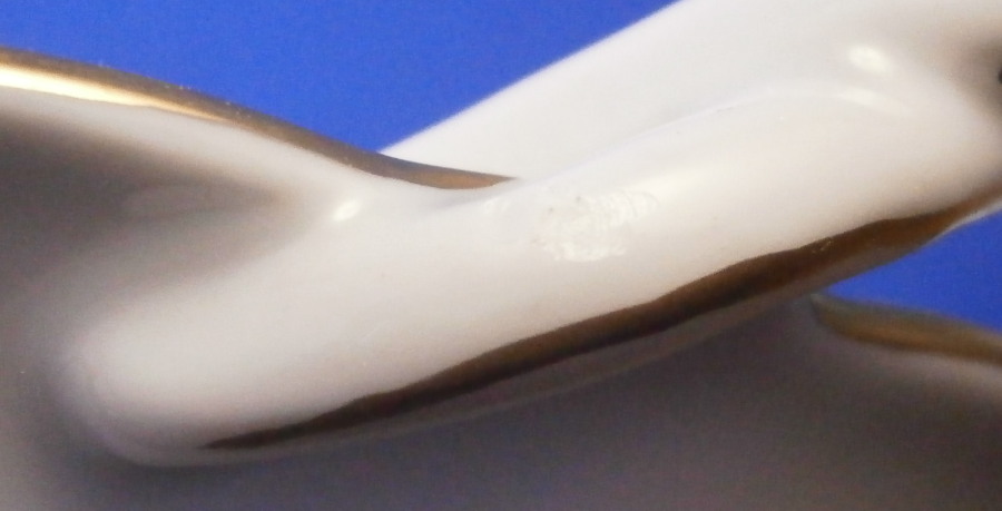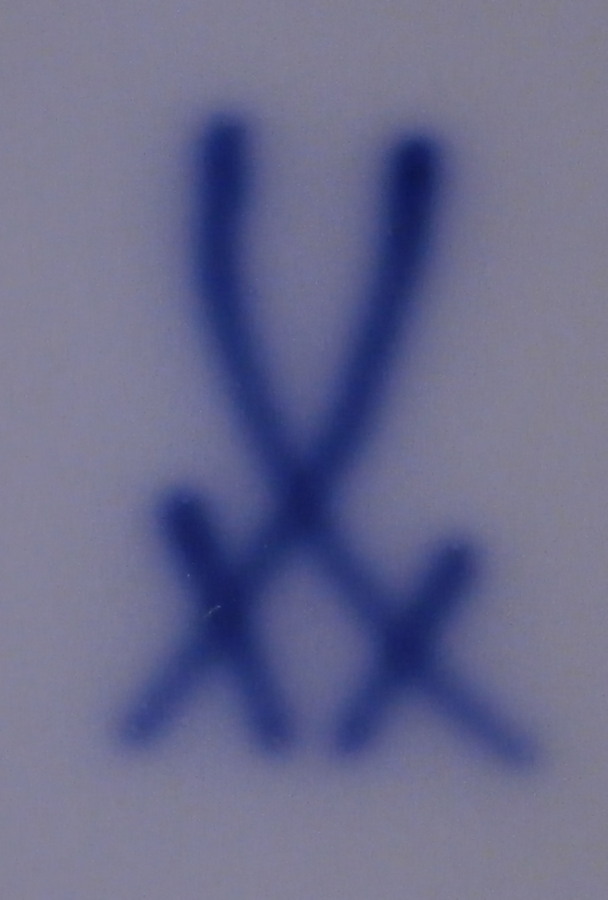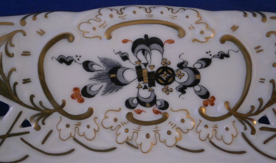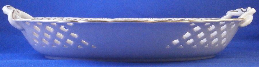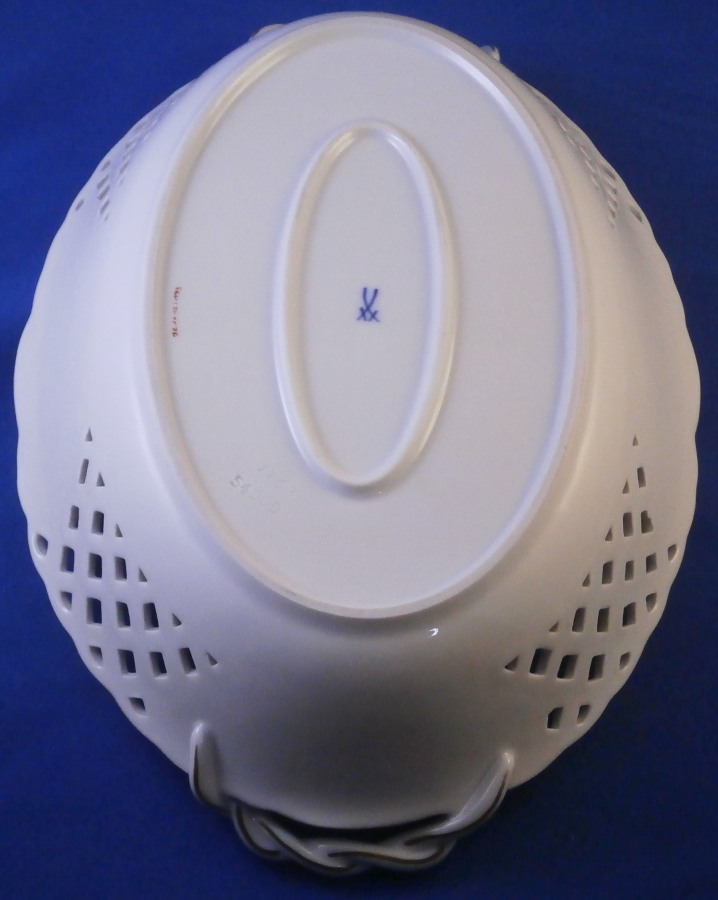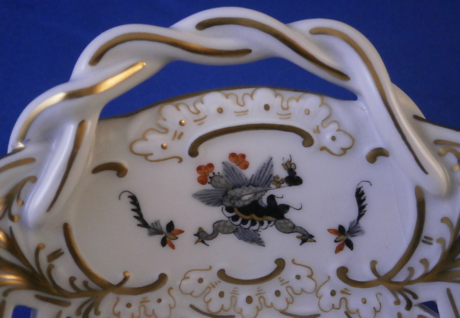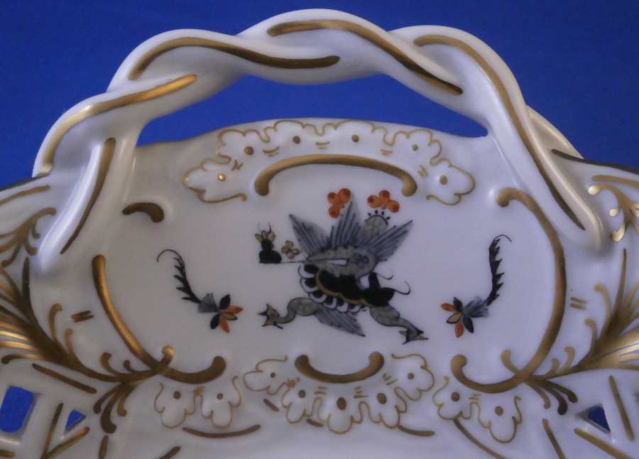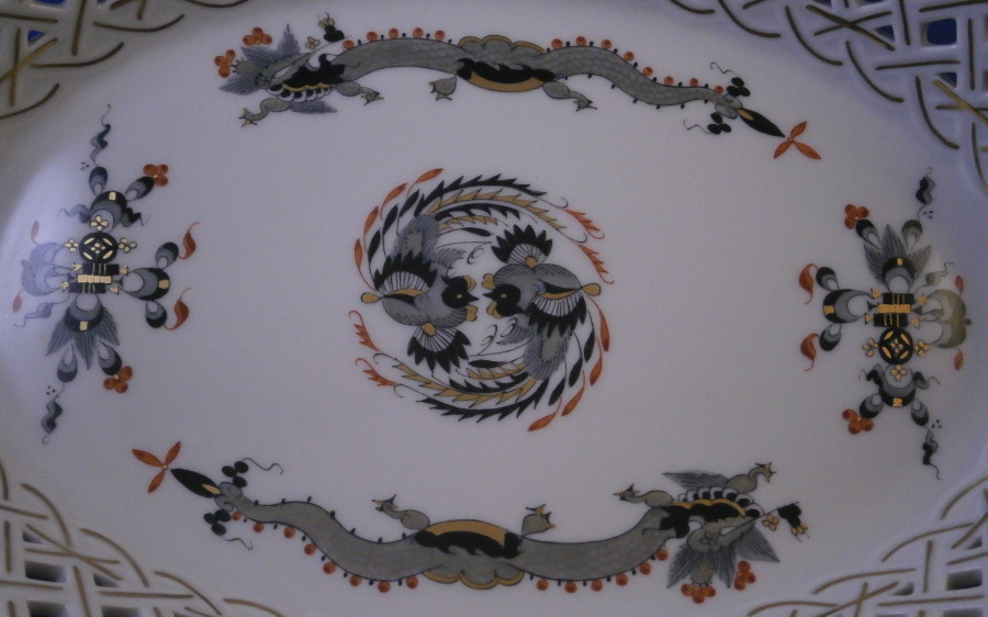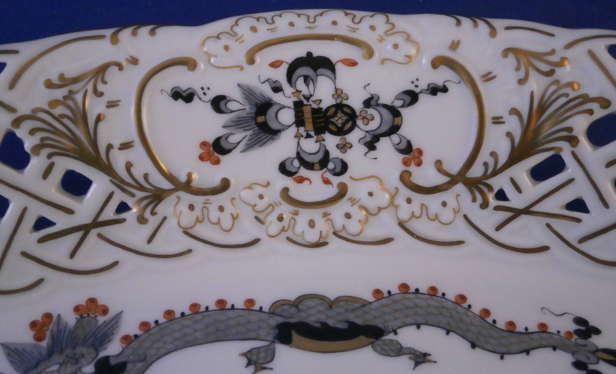 This is a reticulated basket / serving dish made by Meissen in the later 20th century. It has a nice shape to it with four reticulated panels along the rim and a handle to each side. Four panels on the rim have either a little dragon type design or just a fancy design to it with some relief and gold detail around them. The bottom inside has two stretched out dragons with two of the fancy designs in between and a double phoenix bird design in the center. They are all hand painted with in the grey rich court dragon ( Hofdrachen ) design with touches of black and red. Grey symbolizes humbleness in Chinese culture. A bit of gold trim to the reticulated areas and the edge. The piece displays perfectly but it does have a tight hairline to one side just next to the inside hand terminal which is totally stable and cannot go anywhere else visible on the right side of the second handle picture. A tiny glaze flake to the end of the handle as well. Neither is visible when on display and they are hard to spot. The dish is marked with the under glaze blue crossed swords mark (first choice) underneath as well as the usual impressed and other marks as shown. It is 2 inches tall at the handles, 10.125 inches wide and 7 inches deep. Please email me for more information or other pictures.
