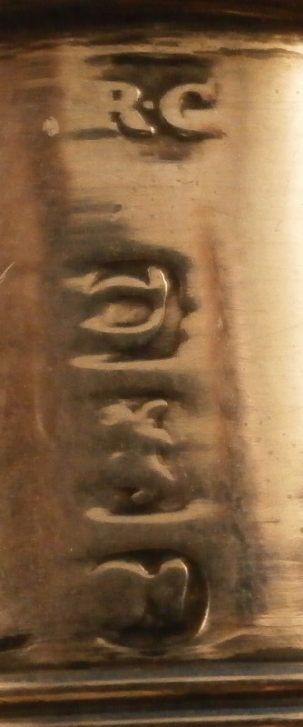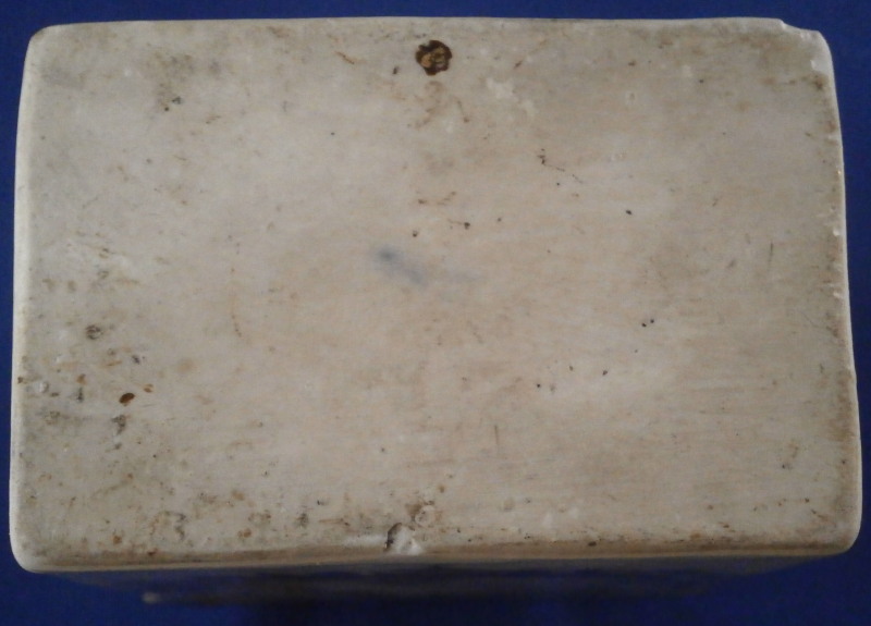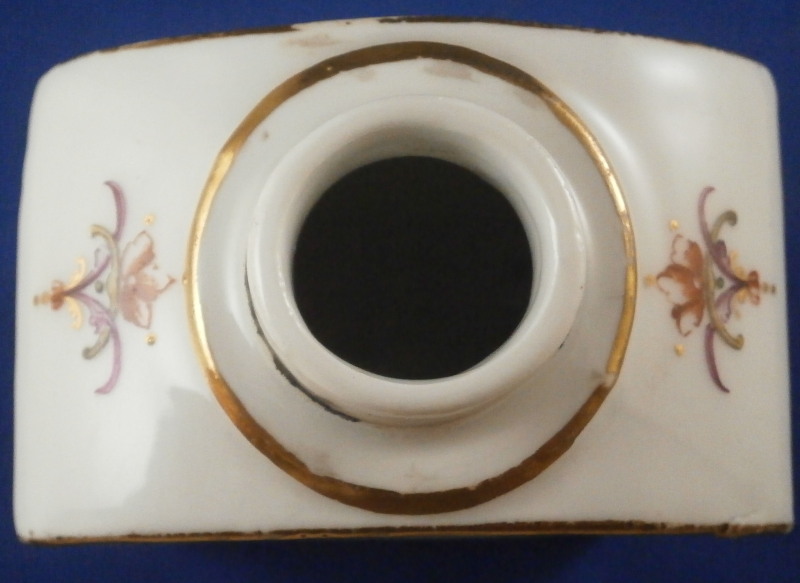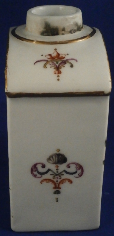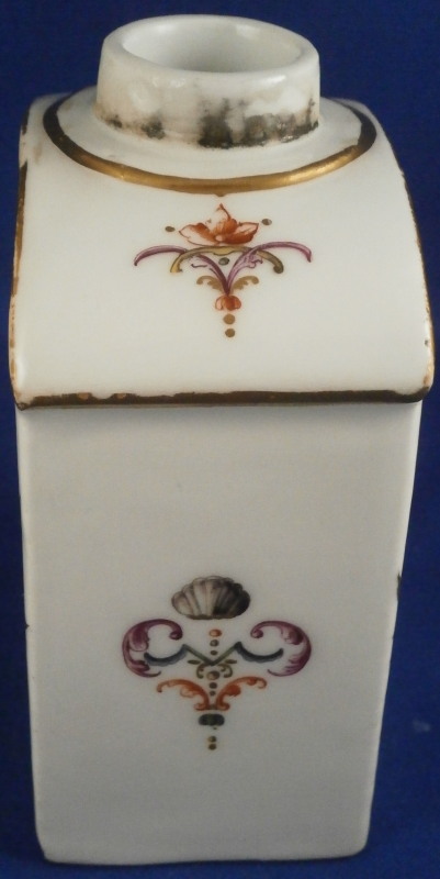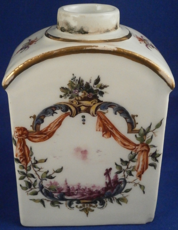 This is a fun tea jar / caddy made by Meissen in the mid 18th century. It is hand painted with a puce scene surrounded by colorful rocaille decorations including swags, leaves and flowers on both the front and the back with two fun designs to the top and either side and gold trim to the edges. A really nice design that is very cheery to look at and a bit different than the usual motives. The teacaddy is in good condition with some wear to the gold trim and a small chip to the bottom right hand corner on one of the sides as shown. The lid was lsot or broken some time ago and replaced with a stunning silver one - probably the nicest silver replacement I have ever seen. The lid is marked with the typical silver hallmarks though I am clueless in this department and have no idea where or when it was made. I assume it is British but that is just a guess. The caddy with the lid is about 5.75 inches tall, 2.875 inches wide and 1.75 inches deep. It is faintly marked with the crossed swords in blue on the unglazed underside - typical of this period of around 1750. A stunning piece! Please email me for more information or other pictures.