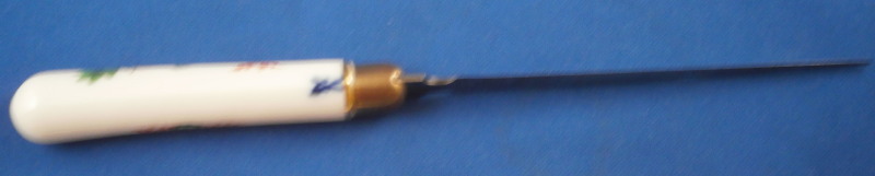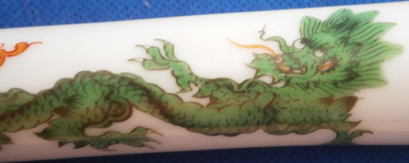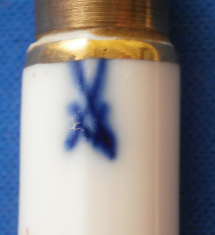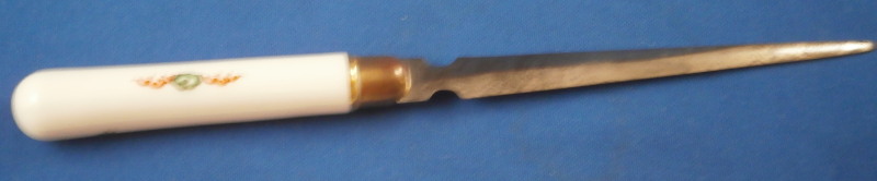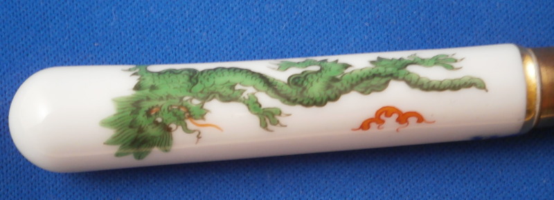This is a letter opener with a porcelain handle made by Meissen in the mid 20th century or maybe a bit earlier. The handle is hand painted with the green Ming Dragon design that includes the superb dragon on one side and a red and green design to the other side. In Chinese culture the green dragon is one of the animals of the four directions, representing the power of the East and also symbolizing health, peace, and eternity. The blade part is silver in color and the ferrule is looks more of a bronze color. The piece is in great condition with the blade being a tiny bit oxidized. Possibly silver plated? The porcelain part is marked on the end near the ferrule with the under glaze blue swords. The entire letter opener is 7.875 inches long with the handle part being about 2.875 inches long and 0.625 inches in diameter. A really nice and hard to find piece that would come in handy on your desk :) Please email me for more information or other pictures.