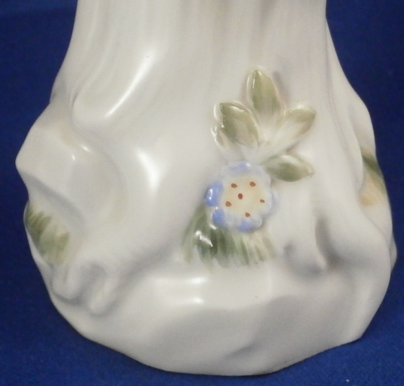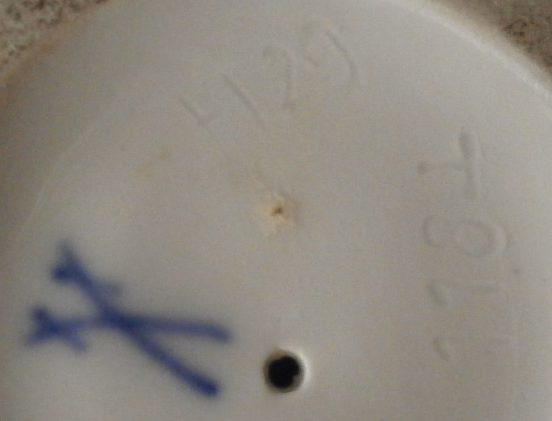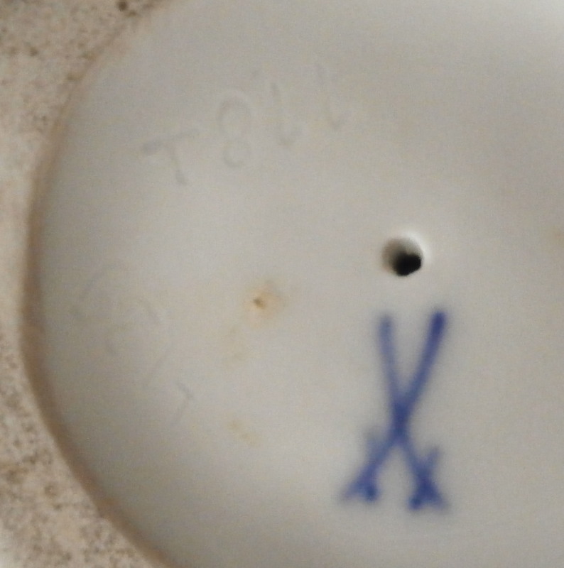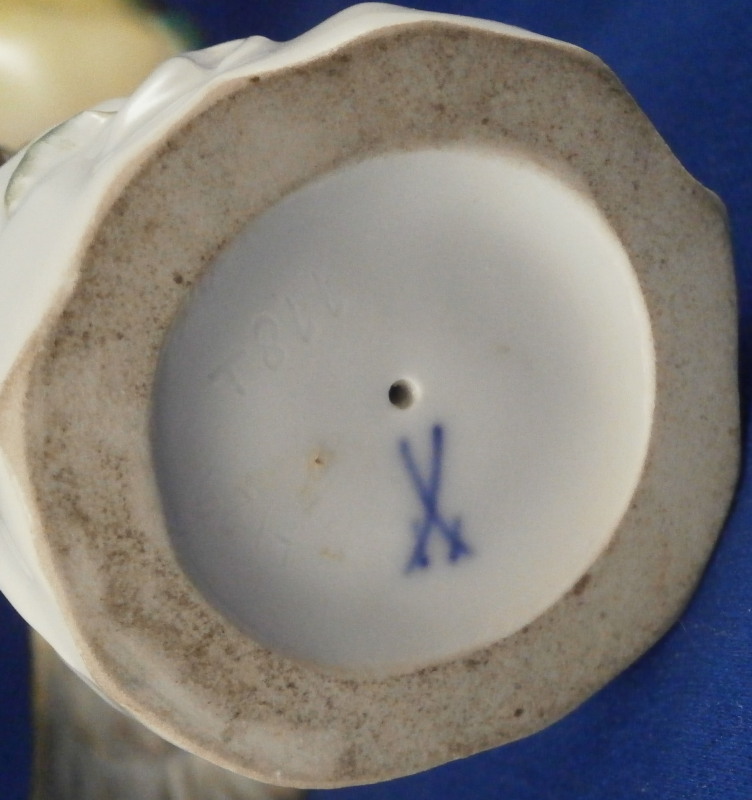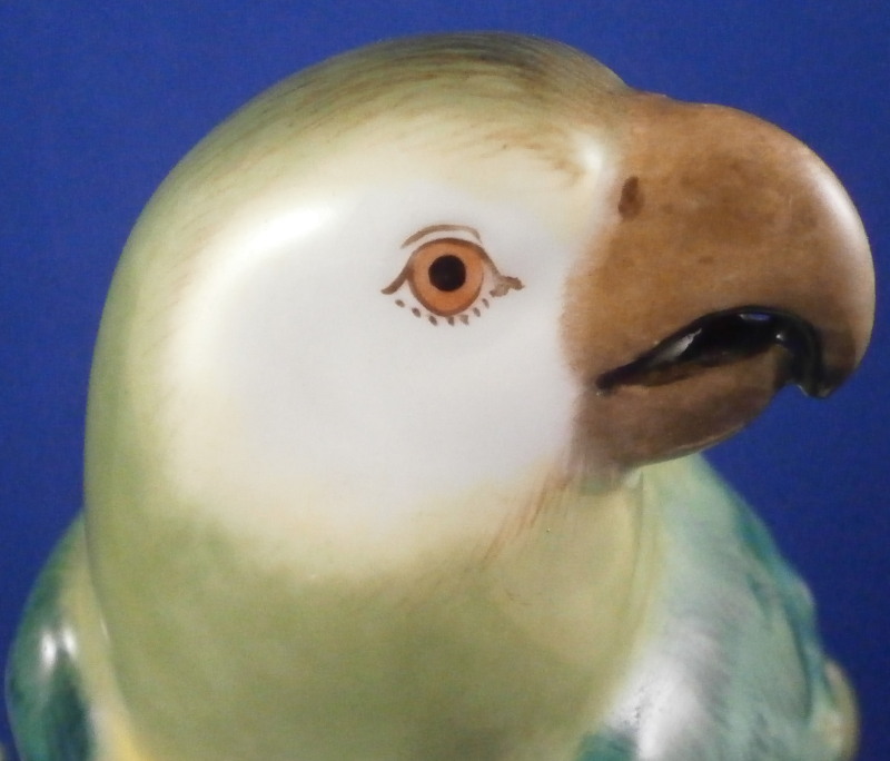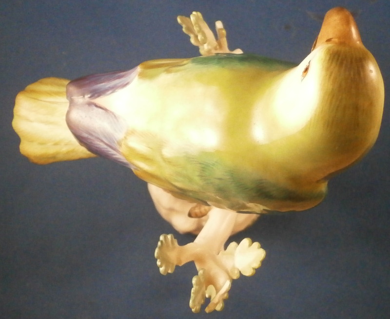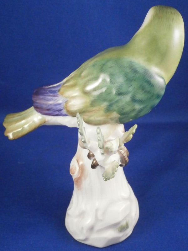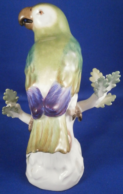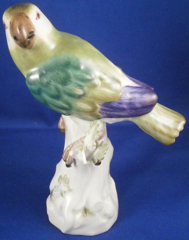 This is a nice parrot bird figurine made by Meissen in the 20th century. A more muted figure with the bird being mainly green tones with a little purple but very elegant nonetheless. The bird is sitting on a tree stump that is very well modeled with roots going over rocks and a branch coming out of either side. A flower and some greenery on the base that make this a very elegant and cheerful figurine. Quite lieflike really! The figurine is in good condition and displays superbly but two leaves are chipped off mostly and one is reglued. The piece is marked underneath with the under glaze blue crossed swords mark as the usual impressed numbers of the period as shown. The piece is 5.625 inches tall, 3.625 inches wide and 4 inches deep. Please email me for more information or other pictures.