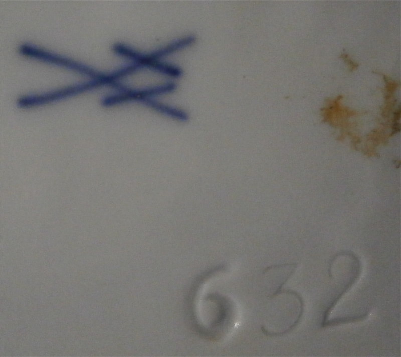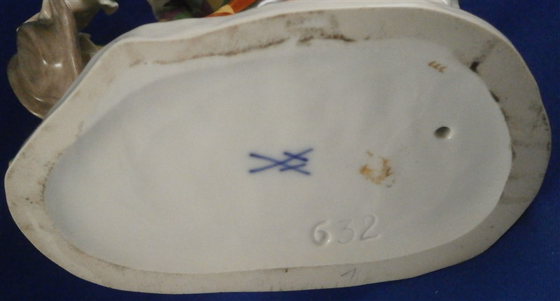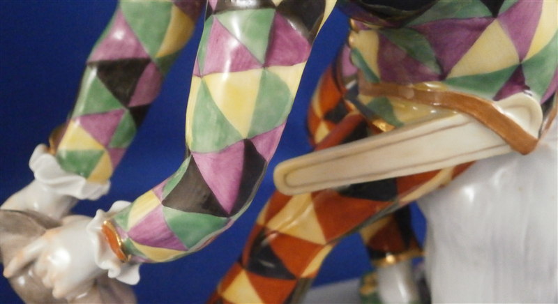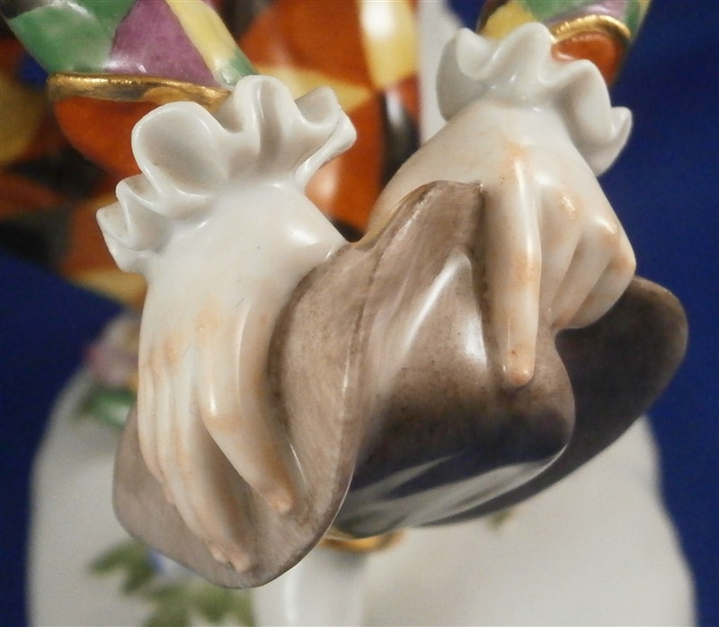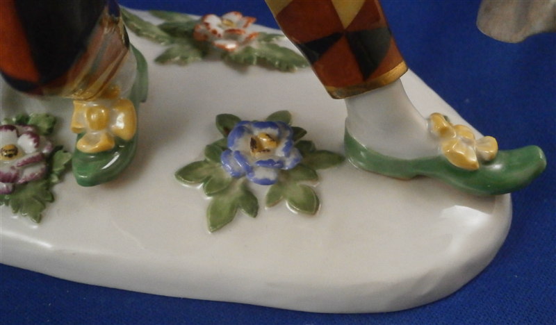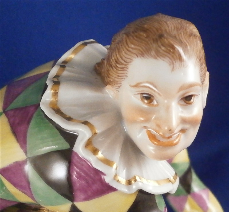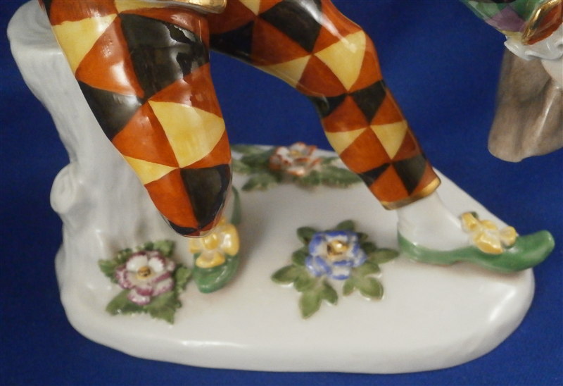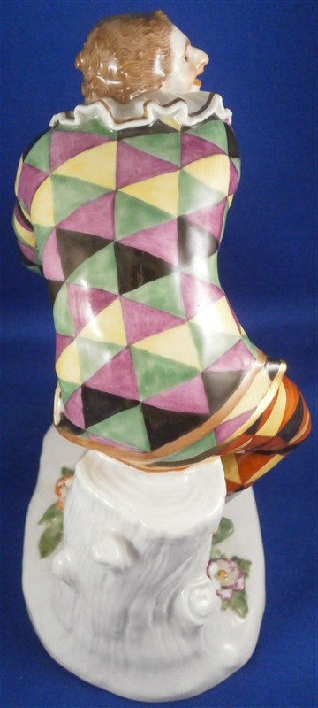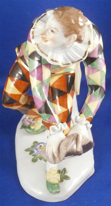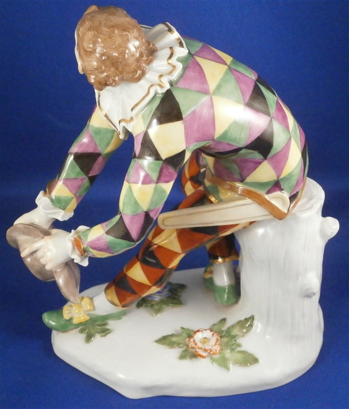 This is a superb harlequin figure made by Meissen in the mid 20th century. These commedia dell'arte figures are always a joy to look at. Just makes you happy on a lousy day :) I do believe he was first designed by Kaendler around 1740. The harlequin here is called the greeting harlequin and is hand painted with a colorful lozenge patterned design to his clothes, holding a hat in front of him with both hands while bowing to greet someone. He is standing on a nice base with a tree trunk behind him and some flowers below him. All in all an amazing piece that just speaks to you! The figurine is in perfect condition which always helps. It is 6.25 inches tall, 3.25 inches wide and 5 inches llong. The figure is marked with the underglaze blue crossed swords mark underneath the base as well as the usual impressed numbers of the period - 632 and a gilt 777 probably the painter's or gilder's number. Please email me for more information or other pictures.
