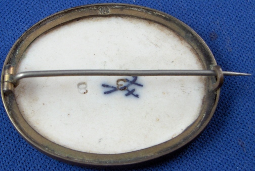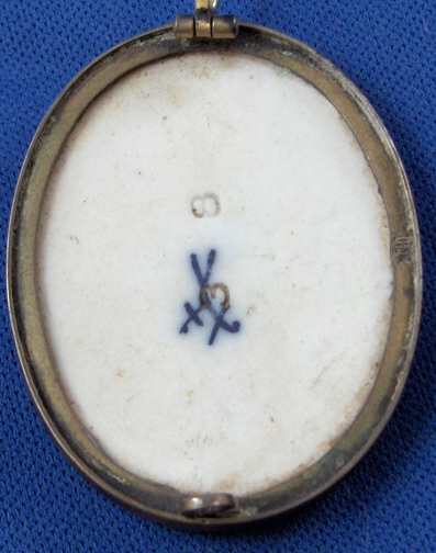 This is an oval shaped pin or brooch made by Meissen in the 19th. It is handpainted with a superb harbor / merchant scene in the center something I have never seen on a pin! Superb detail and colors. The porcelain has a silver metal frame that is marked 800 on the back. The pin on the frame in the back is a bit longer than the brooch so it might not be the original one!? Works fine though. The porcelain is in superb condition and so is the frame which is oxidized something that could easily be taken care of one wishes. The piece is marked underneath with the blue swords mark as well as an impressed number 3 and 8. The entire piece is 1.625 inches wide by just over 1.25 inches tall. Please email me for more information or other pictures.