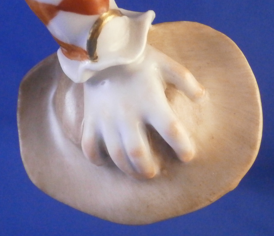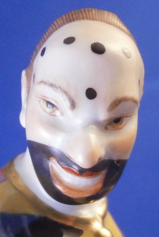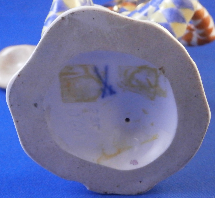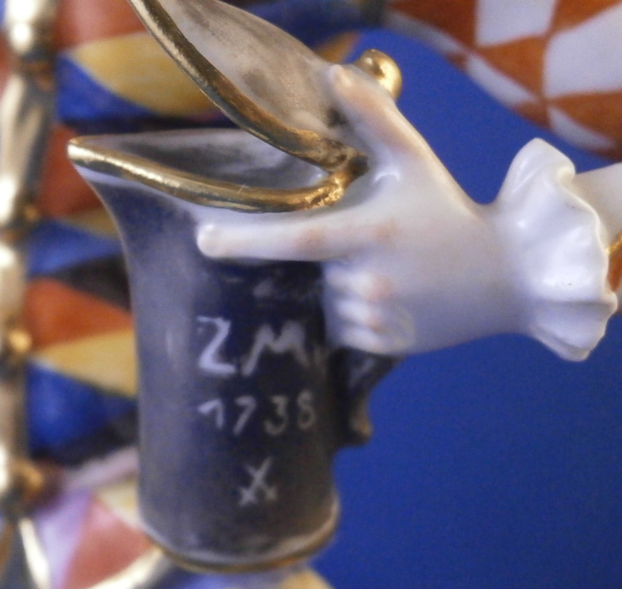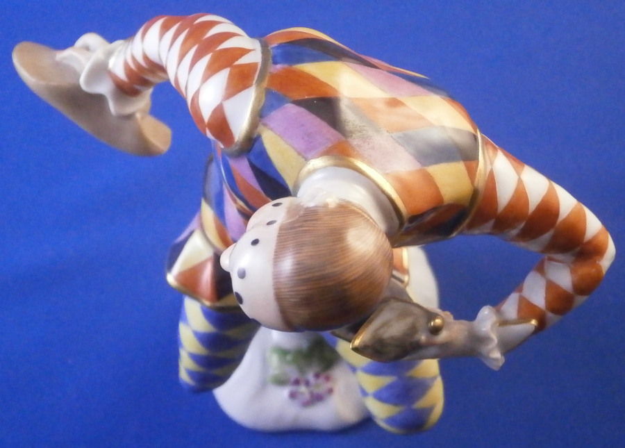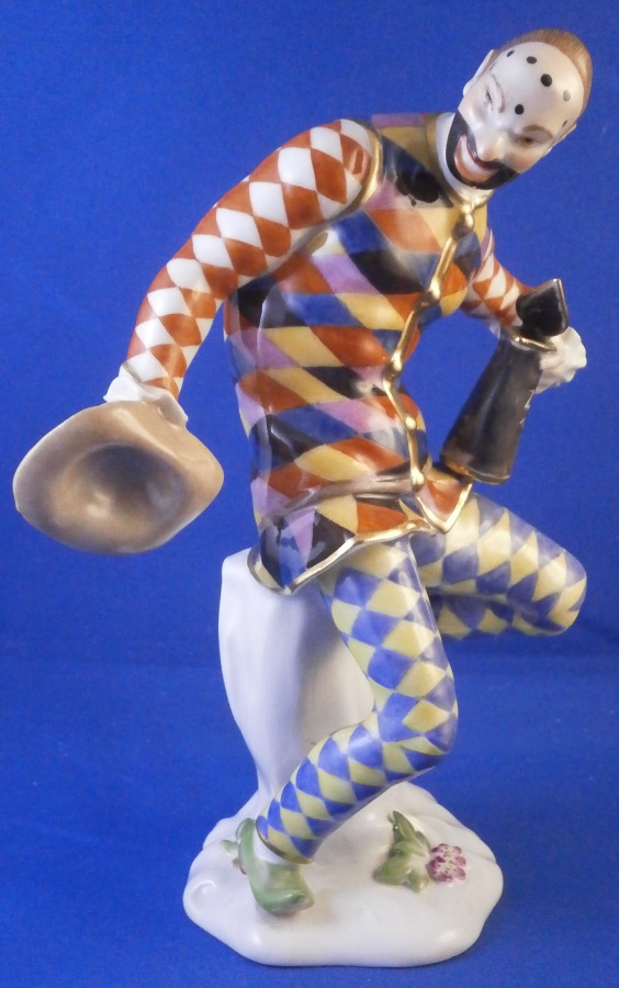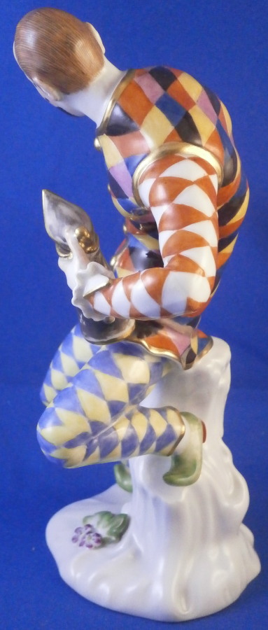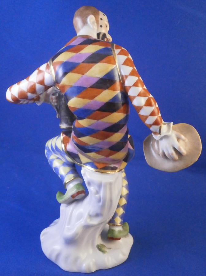 This is a superb harlequin figure made by Meissen in the mid 20th century. These commedia dell'arte figures are always a joy to look at. Just makes you happy on a lousy day :) I do believe he was first designed by Kaendler around 1735 which explains that year being written on the tankard he is holding in his left hand. He has a mask covering his face and is holding a hat in his right hand. Not sure what his official name but probably Harlekin with hat and lidded pot or something obvious like that :) He is superbly hand painted with a colorful lozenge patterned design to his clothes - with different colors to his pants, jacket and sleeves. He is standing on a nice base with a tree trunk that he is sitting on and a flower below him with a leaf to the back. All in all an amazing piece that just speaks to you! The figurine is in perfect condition which always helps. It is just over 6.25 inches tall, 4.75 inches wide and 2.75 inches deep. The figure is marked with the under glaze blue crossed swords mark underneath(first choice off course) as well as the usual impressed numbers of the periodand a puce 48 as the painter's number. Please email me for more information or other pictures.