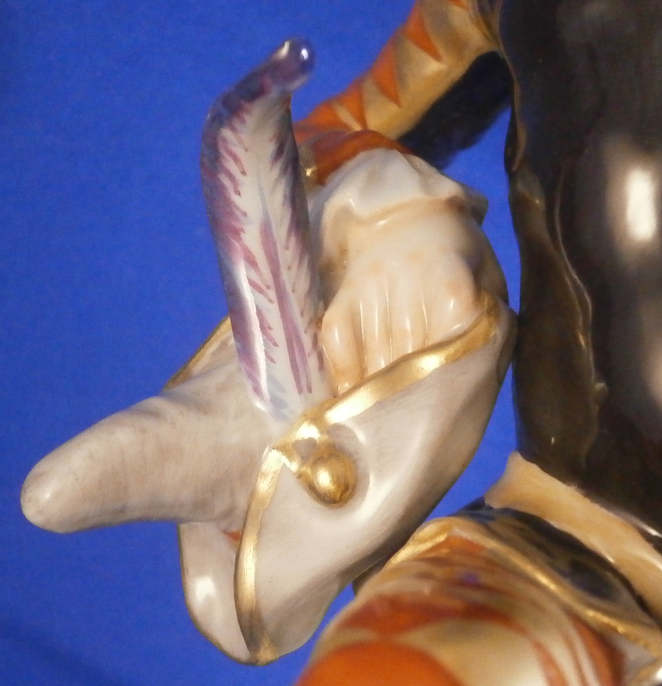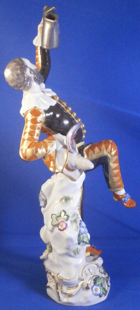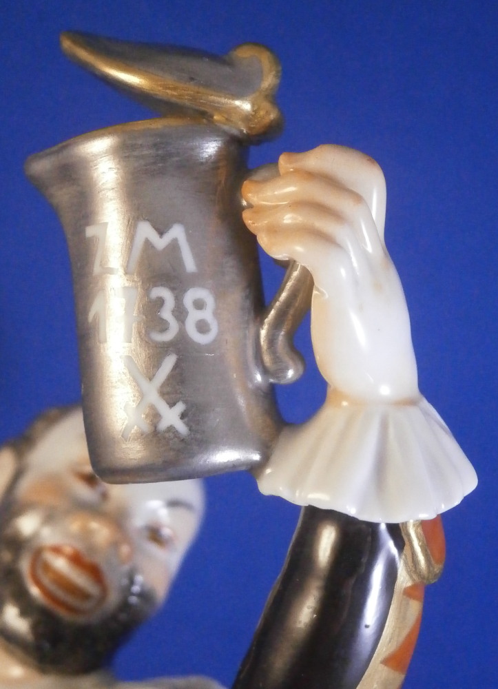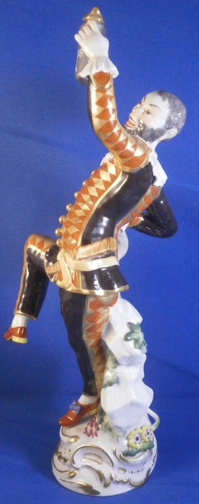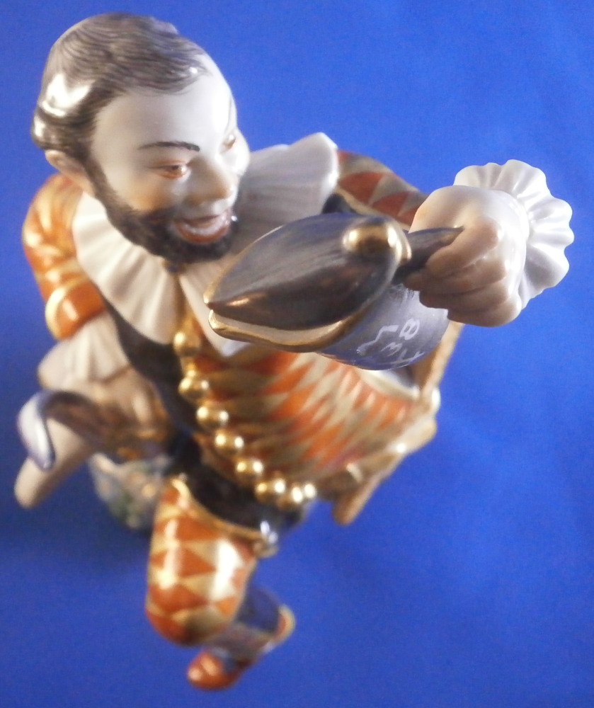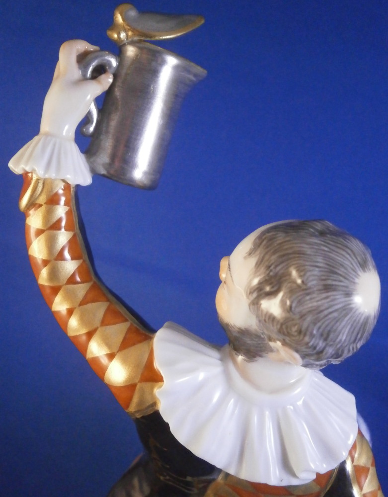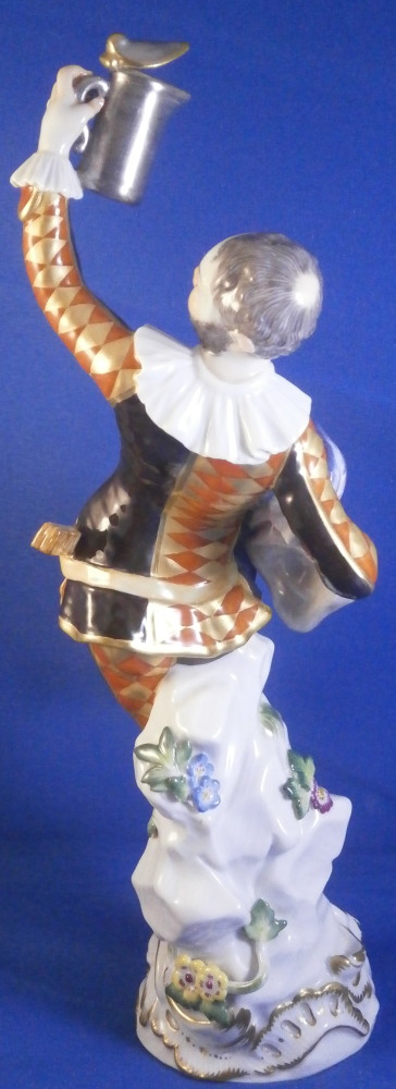 This is a really superb figurine made by Meissen during the later 20th century. It is a really fun figure of a harlequin dressed in his fancy outfit while holding a hat with a feather in it in one hand and a tankard in his upper hand. The tankard has the crossed swords on it as well as the year 1738referncing the year it was originally modeled in the 18th century. I wish I ahd an original period piece but we cannot have it all so this figure will have to suffice :) The harlequin is superbly modeled in his red, black and gold outfit, wearing a beard and standing on a base with gold scrolls to it and some flowers. As nice a figurine as it gets from this period! The figurine is in perfect condition which is not easy given the vulnerable details like the outstretched hand with the tankard, the feather on his hat and the slap stick. The figure is marked underneath with the under glaze blue crossed swords mark (first choice) as well as the usual impressed and other marks as shown. The figurine is about 9.625 nches tall, 3 inches wide and 3.75 inches deep. Please email me for more information or other pictures.