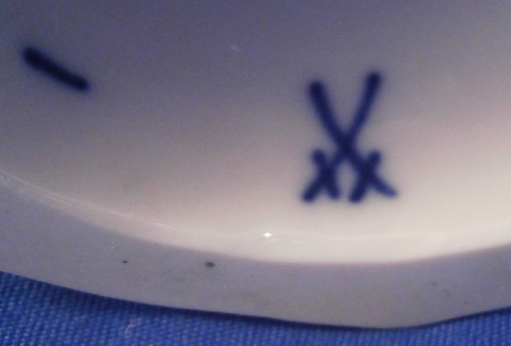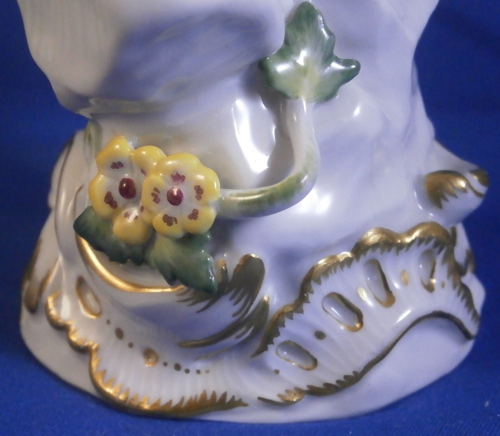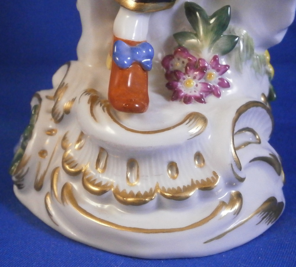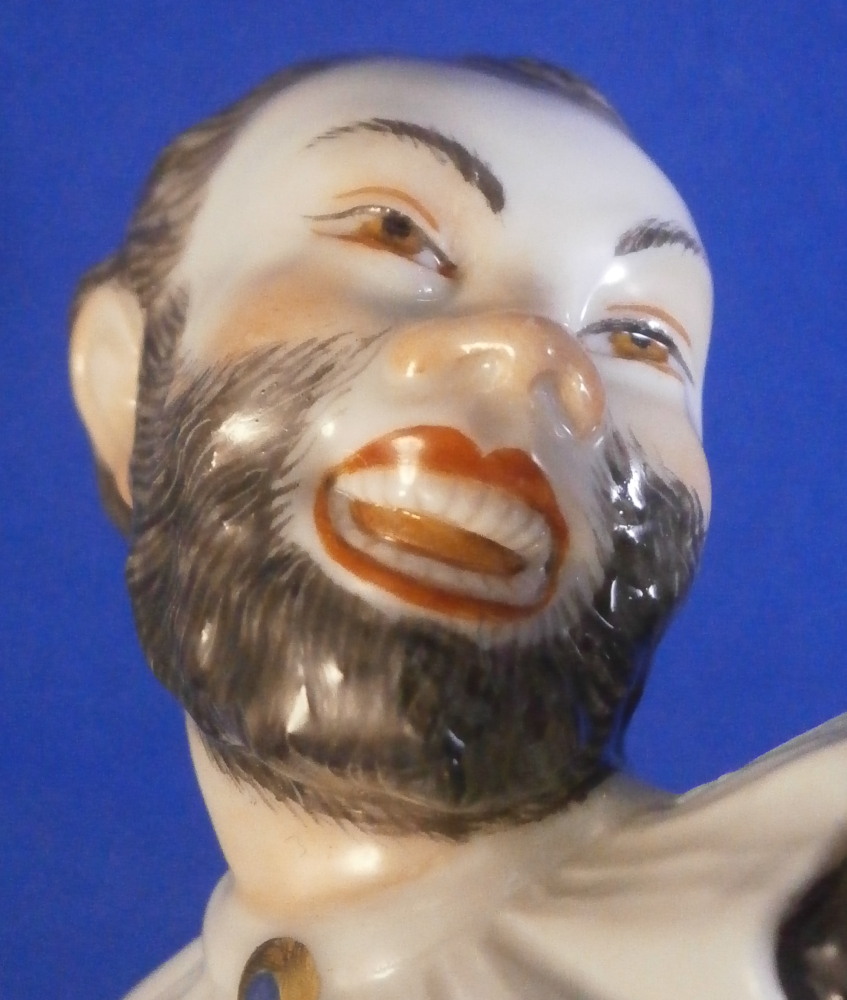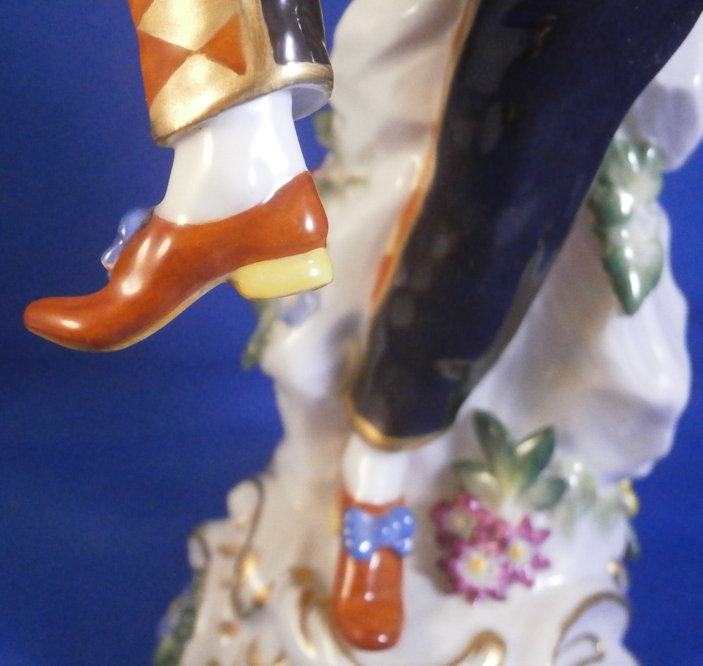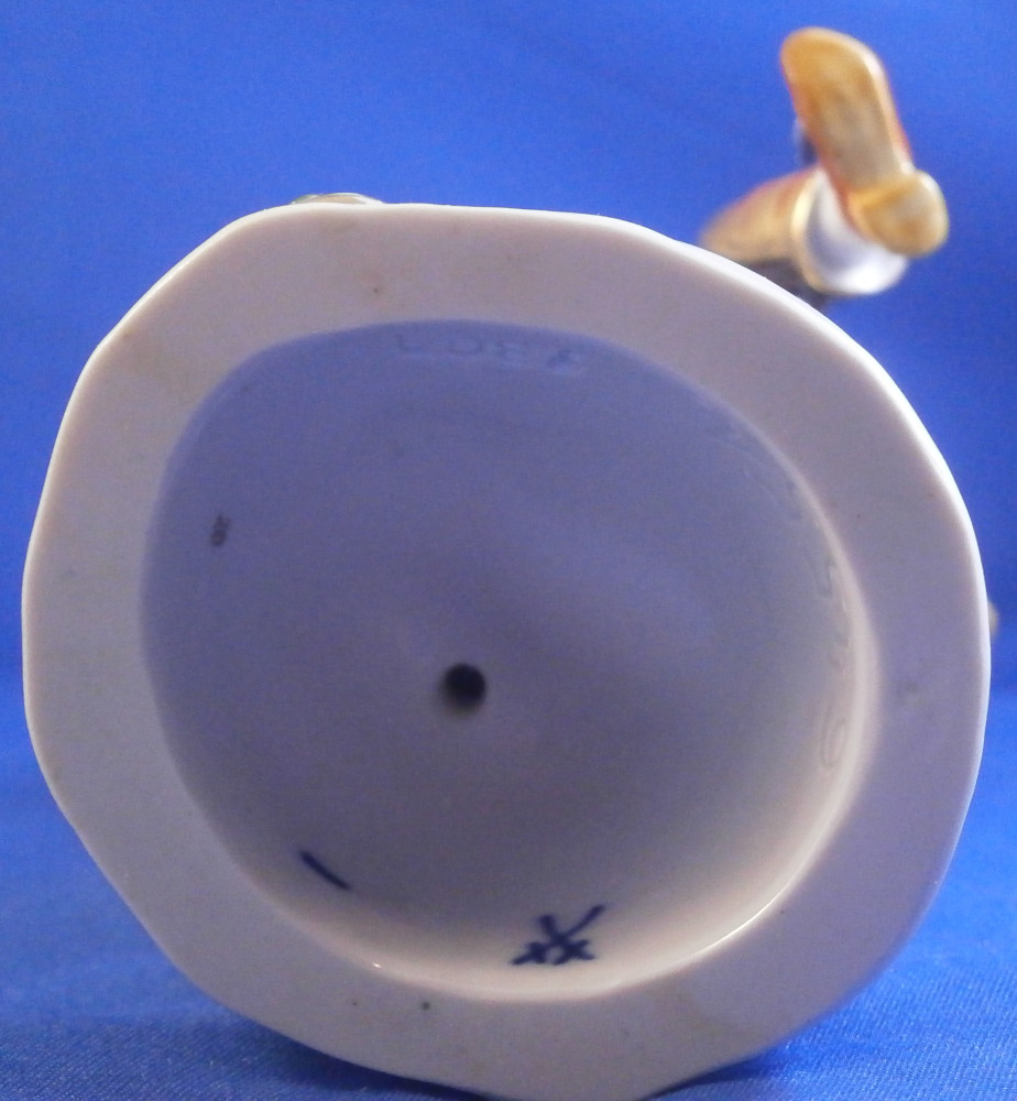 This is a really superb figurine made by Meissen during the later 20th century. It is a really fun figure of a harlequin dressed in his fancy outfit while holding a hat with a feather in it in one hand and a tankard in his upper hand. The tankard has the crossed swords on it as well as the year 1738referncing the year it was originally modeled in the 18th century. I wish I ahd an original period piece but we cannot have it all so this figure will have to suffice :) The harlequin is superbly modeled in his red, black and gold outfit, wearing a beard and standing on a base with gold scrolls to it and some flowers. As nice a figurine as it gets from this period! The figurine is in perfect condition which is not easy given the vulnerable details like the outstretched hand with the tankard, the feather on his hat and the slap stick. The figure is marked underneath with the under glaze blue crossed swords mark (first choice) as well as the usual impressed and other marks as shown. The figurine is about 9.625 nches tall, 3 inches wide and 3.75 inches deep. Please email me for more information or other pictures.