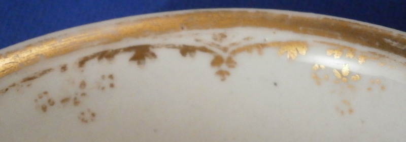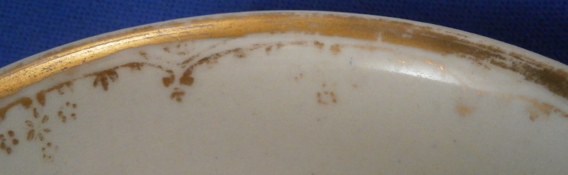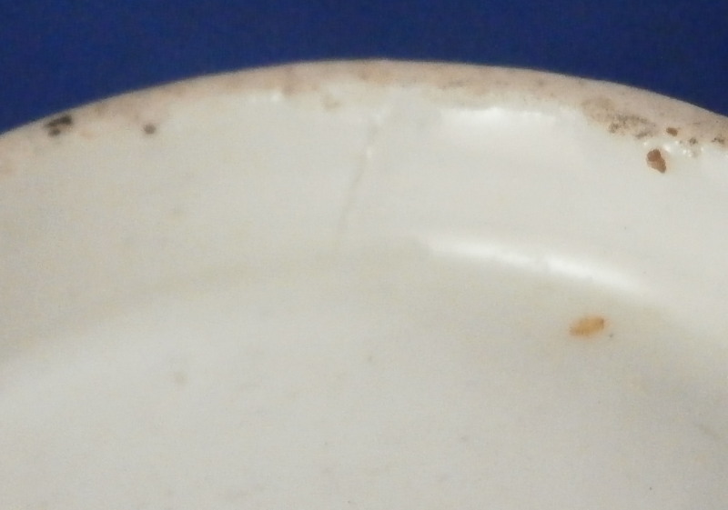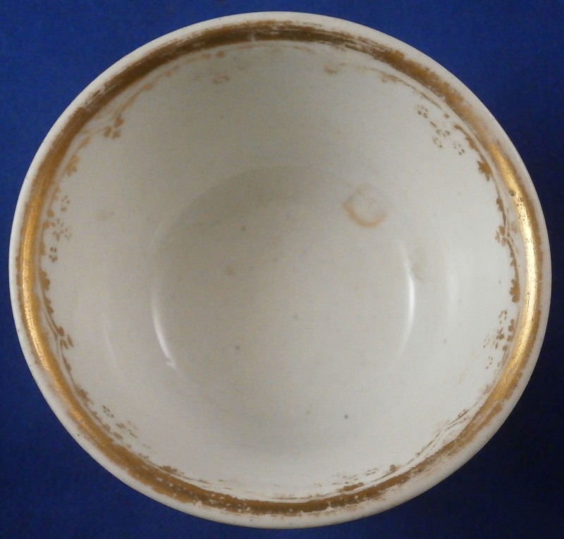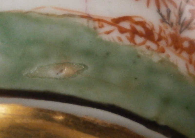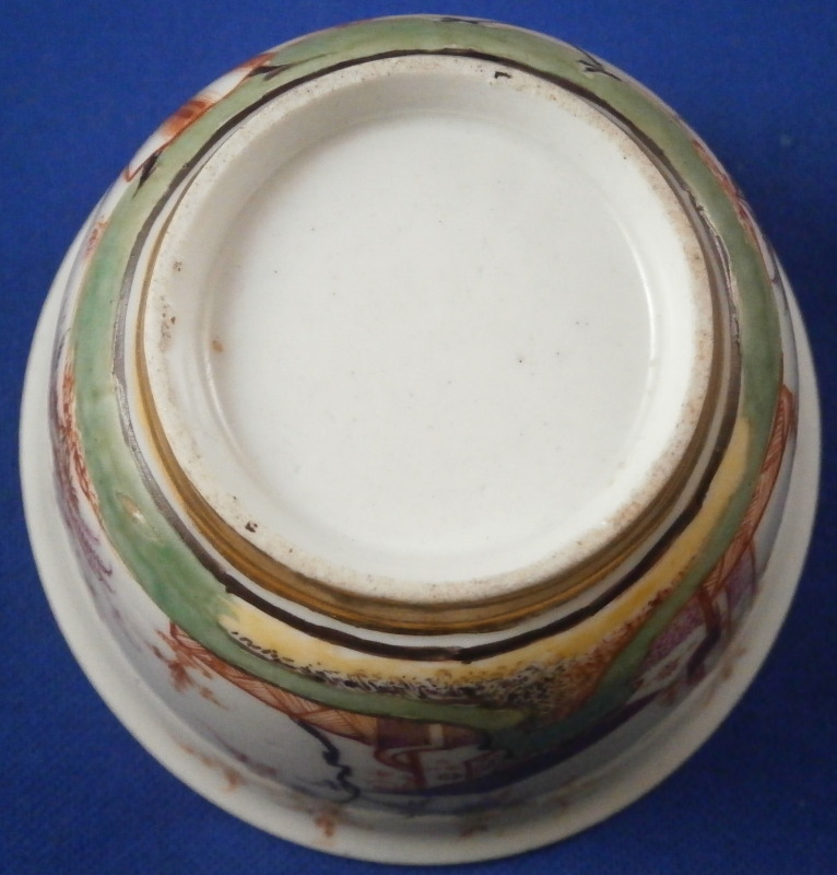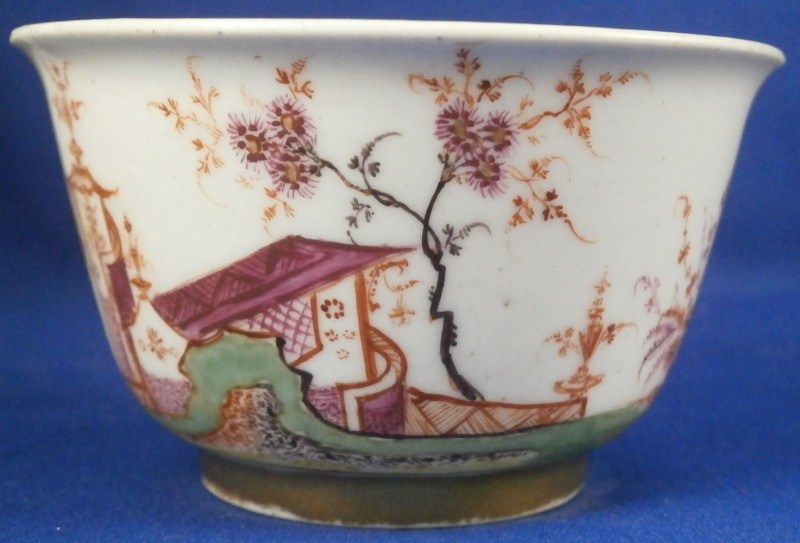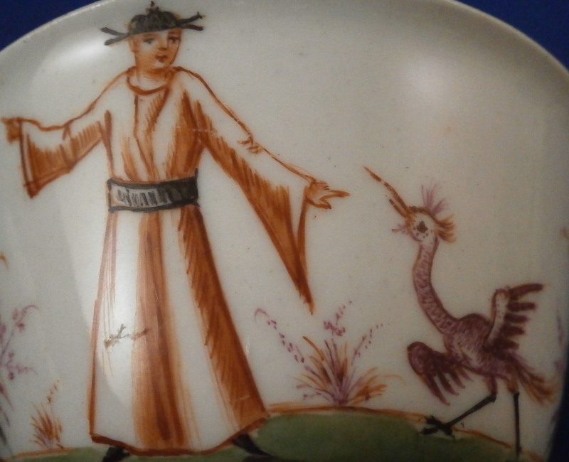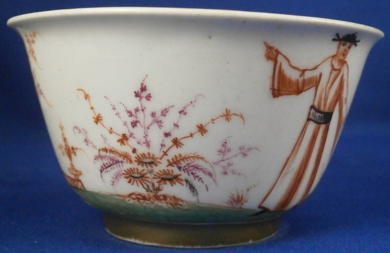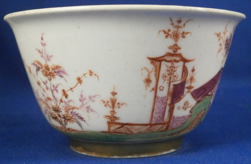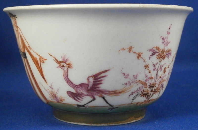 This is a very early teabowl cup made by Meissen in about 1720 and most likelyy decorated by Danhöffer ( J.P. Dannhoffer ) at Bayreuth. Timing is difficult in terms of the painting. Some places say it is at the same time as when the porcelain was made and others a bit later around 1740. It is hand painted with a chinoiserie scene all around including an Oriental gentleman figure next to a purple bird with some shrubs and buldings filling in the rest of the piece. These early Meissen Hausmalerei pieces are becoming hard to find and really are fun to look at :) This is just a superb piece and almost as early as it comes for Meissen. It will still be Boettger porcelain which is so thin and nice. The cup is in good condition with wear to the gilding - not bad on the outside but the inside is worn. The outside also has a firing flaw as shown which resulted in a very small star hairline that stained on the inside and tehre is either a glaze chip or another firing flaw to the bottom inside next to the stained spot. It's damage but not too bad and it being so early more than makes up for that I think. The cup is unmarked but obviously Meissen. It does have a Dreher's mark / to it. The cup is 1.625 inches tall and 3.125 inches in diameter. Please email me for more information or other pictures.