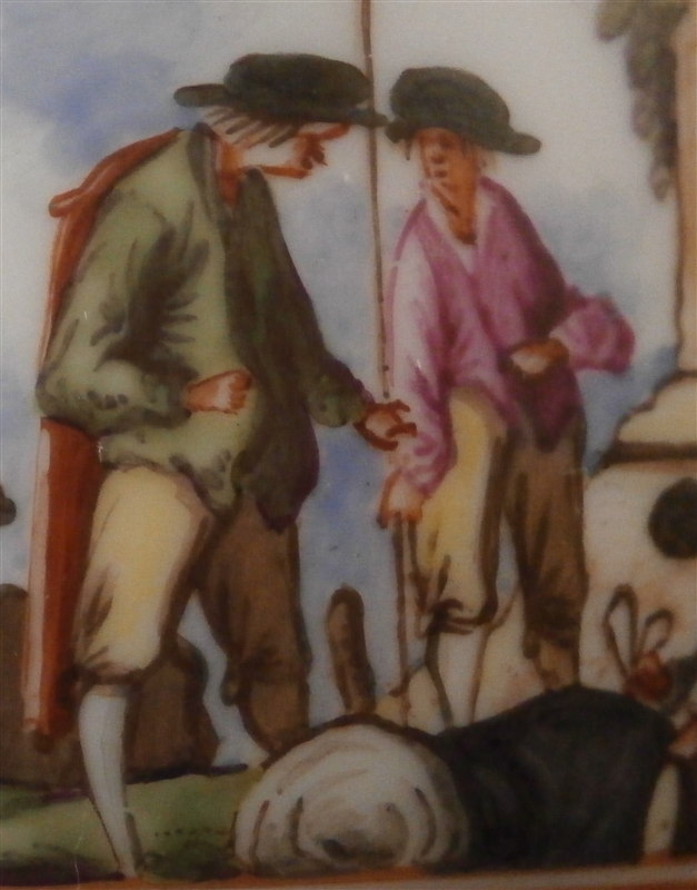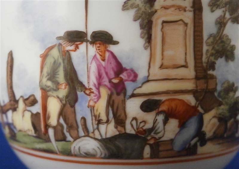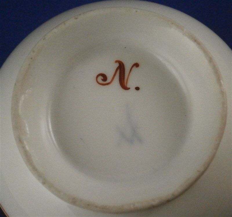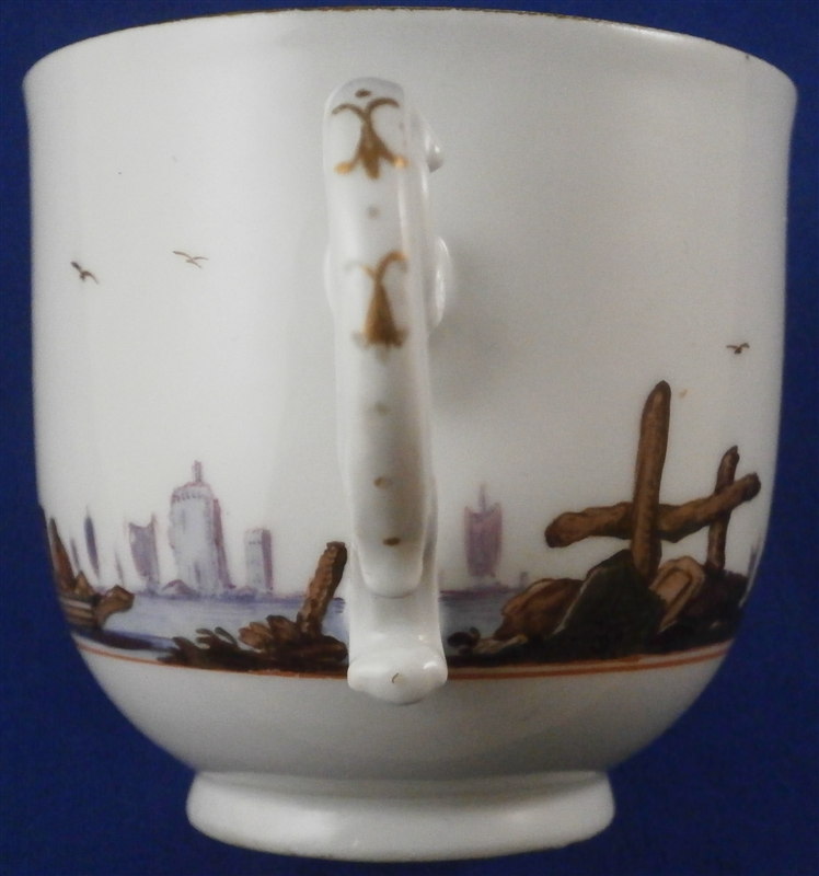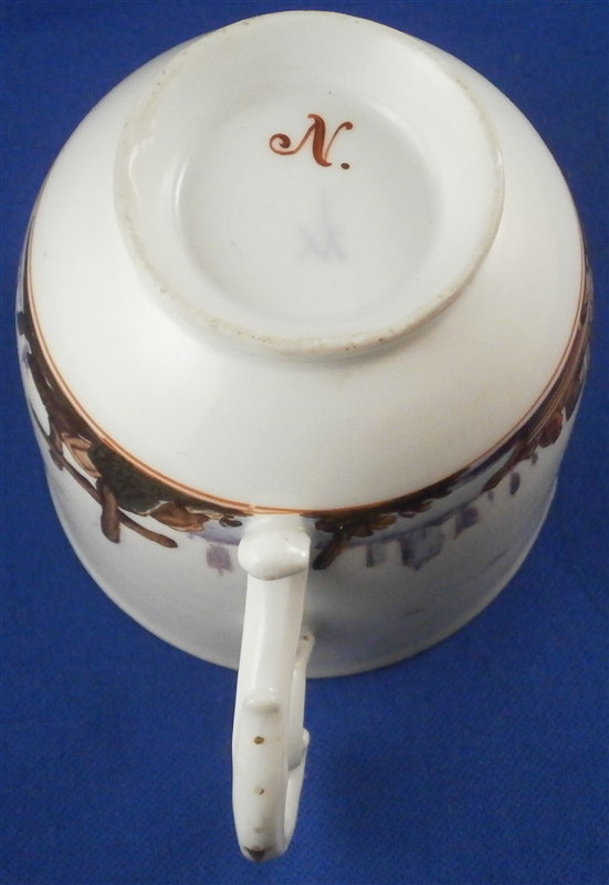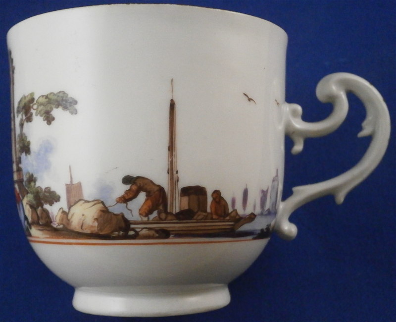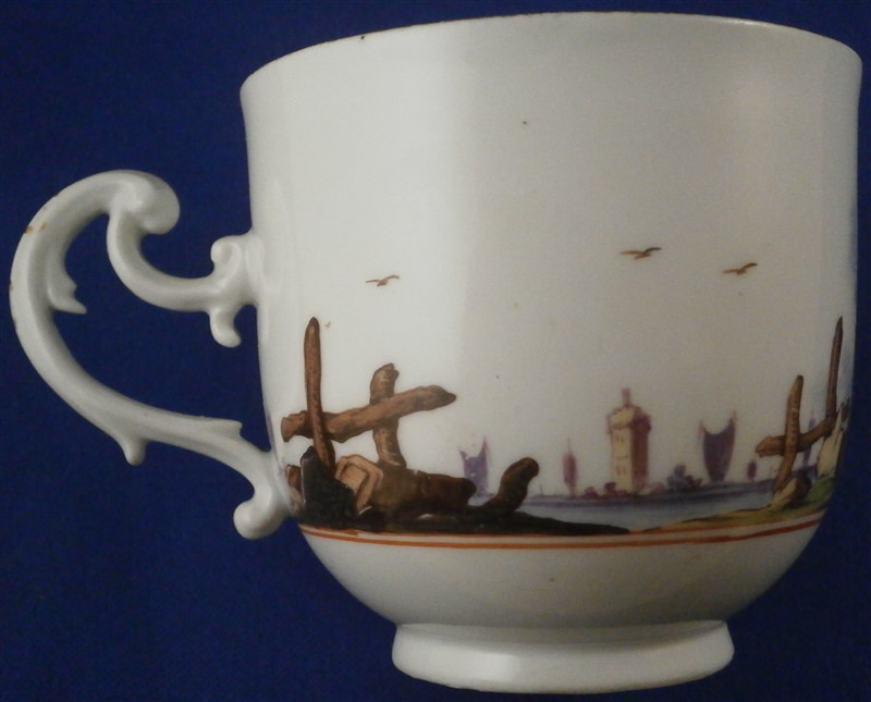 This is superb cup made by Meissen in about 1735. It is hand painted with a really nice Harbor / Merchant type scene all around with a double red trim line underneath, a gold trim to the edge and a really nice handle shape. I think the piece was painted by Johann George Heintze though I am not 100% on that. The quality and size of the scene is just superb! Sadly no saucer :( The cup is in perfect condition. It is marked underneath with the crossed swords mark as well as a script letter N. in iron red as shown. No impressed number yet so definitely an early piece. Please email me for more information or other pictures.