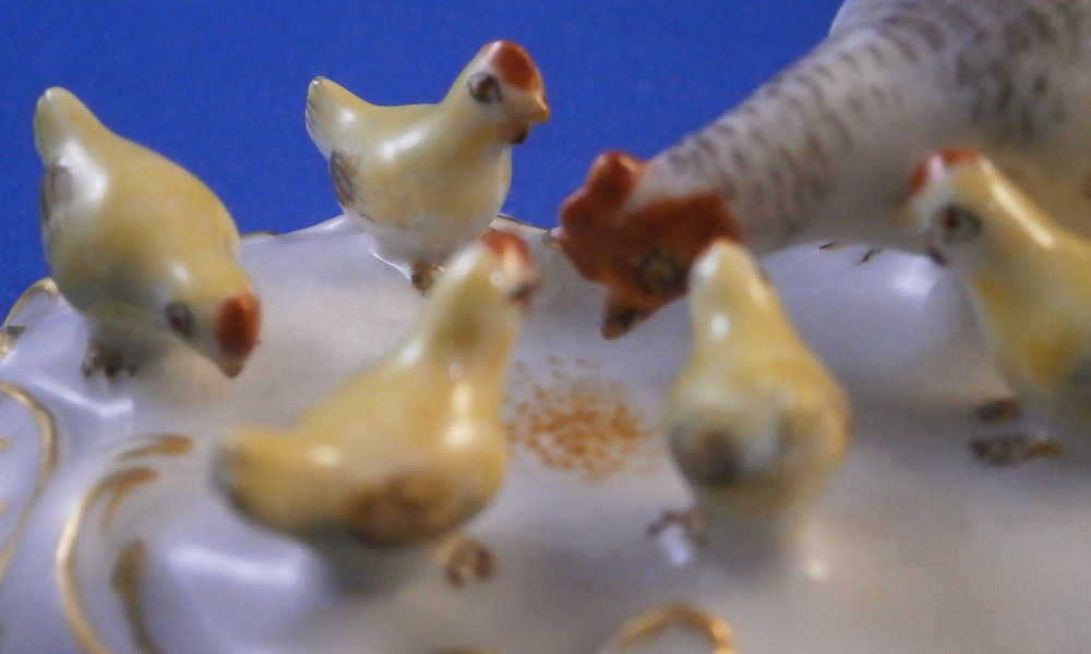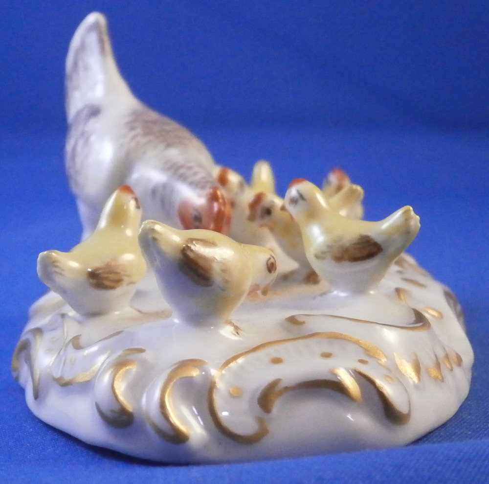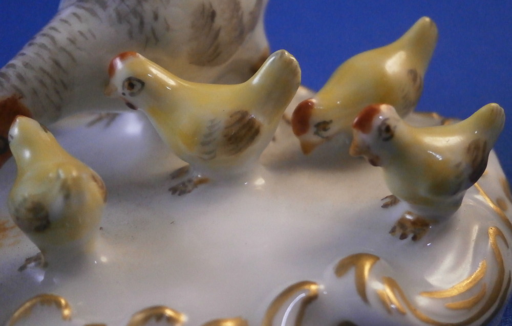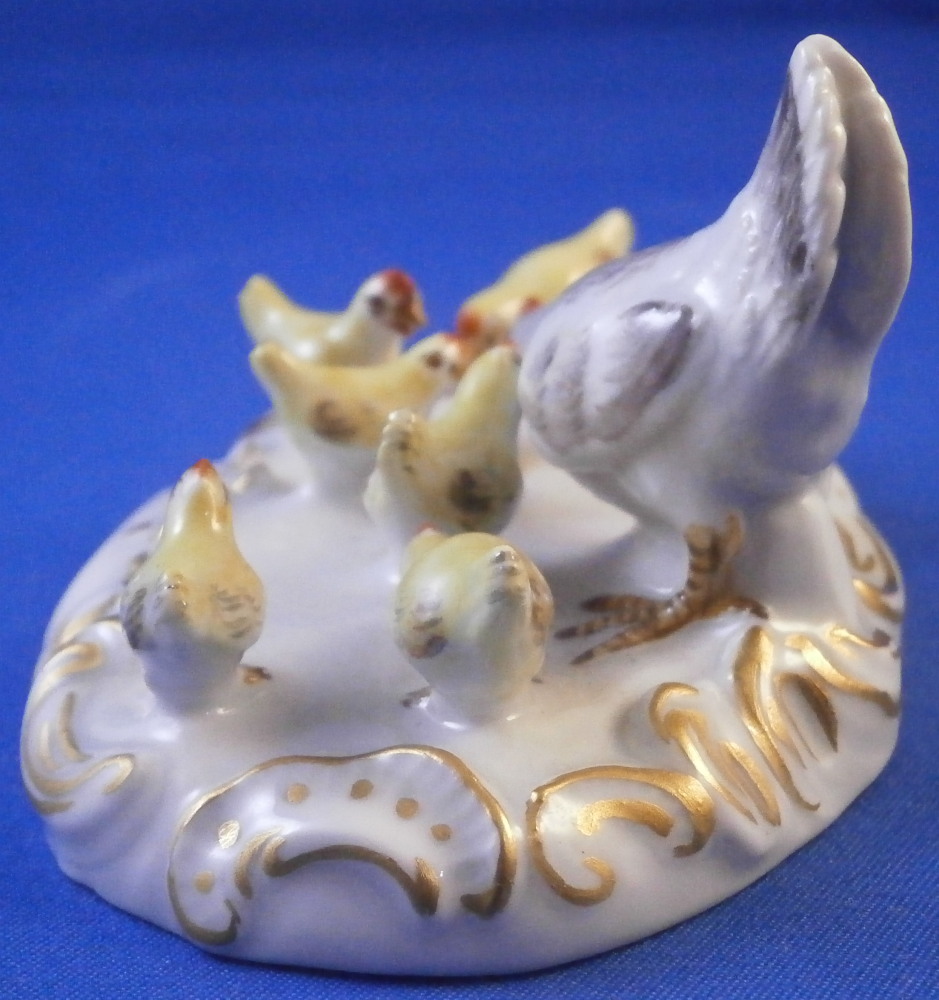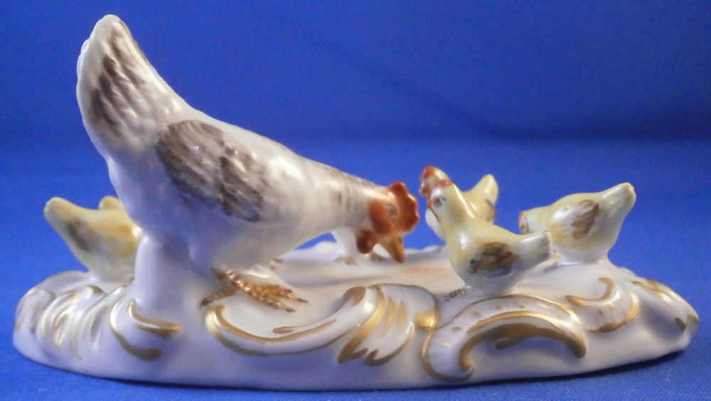 This is a superb figurine of a hen with her chicks made by Meissen in the 20th century. A super cute figurine of just the chicken doing what they are doing without another figure distracting from it. The mother hen is pecking at some food on the ground while the chicks are all over the place doing different things like annoying mom :) Really nice base with raised scrolls all around the base highlighted with gilding. A stunning and fun piece! Superbly modeled and hand painted to perfection! The figurine is in perfect condition! The underside is marked with the under glaze blue crossed swords mark (first choice) as well as the usual impressed marks and a painter's number 4 as shown. The figurine is 1.75 inches tall, 3.75 inches wide and 2.25 inches deep. Please email me for more information or other pictures.