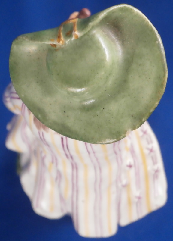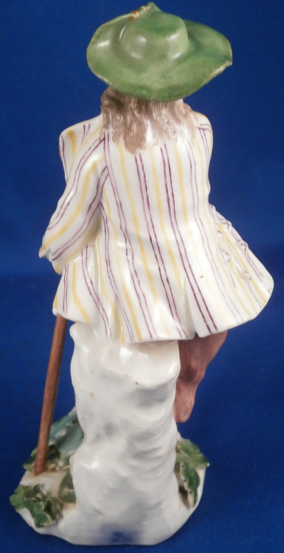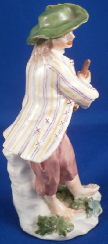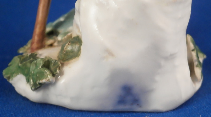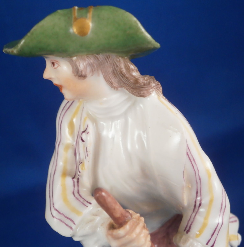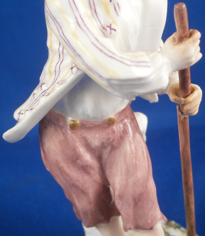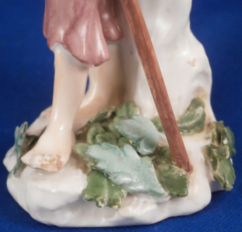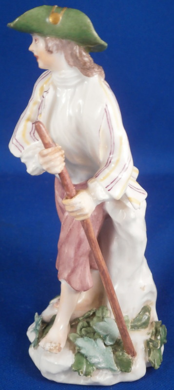 This is a nice figurine made by Meissen in about 1750. Likely one of the series of peasant folks they liked to model. The figure is of a gentleman hiking. He is holding a long stick, wearing a nice green hat and is dressed and a nicely decorated shirt and brown short pants that look a little worn. There are leaves on the base by his feet. The figurine displays very well but as is almost always the case with these really early figurines there is some damage. The hat has a small chip and also an older small restored chip, a little damage to the leaves, the foot that stick out in front of the base had some minor work done to the toes mostly on the underside and the stick has been broken and restored and broken again right under the lower hand. A bit of damages to both hands that has been repaired and is hard to spot since the fingers are towards the back side or pointing down. All in al is displays perfectly and is a really nice piece! He is 4.5 inches tall, 2 inches wide and 1.875 inches deep. The piece is marked with the under glaze blue crossed swords mark to the back of the base as shown. Underside is typical for the early pieces. Please email me for more information or other pictures.