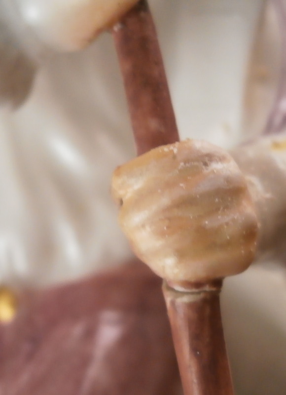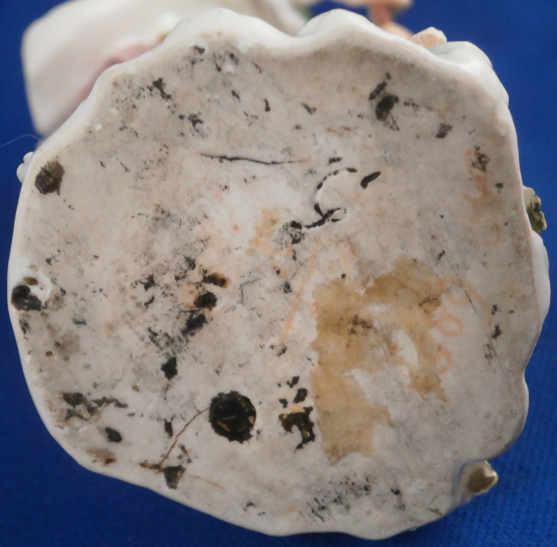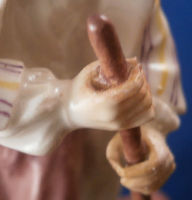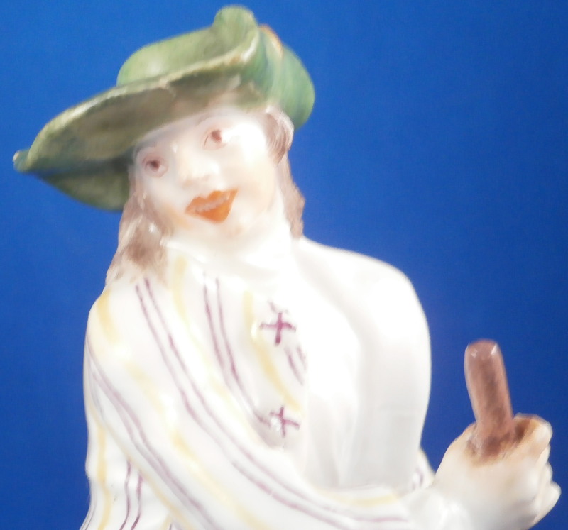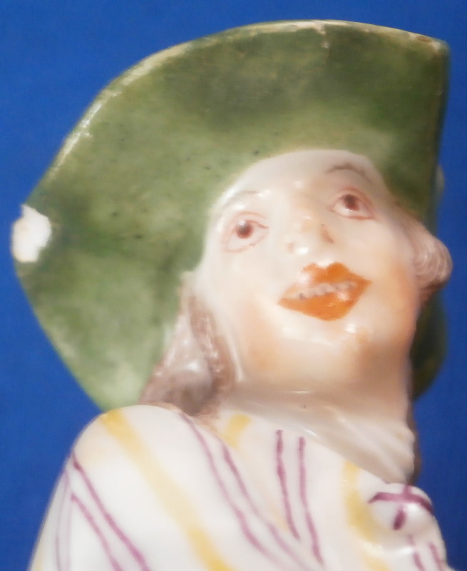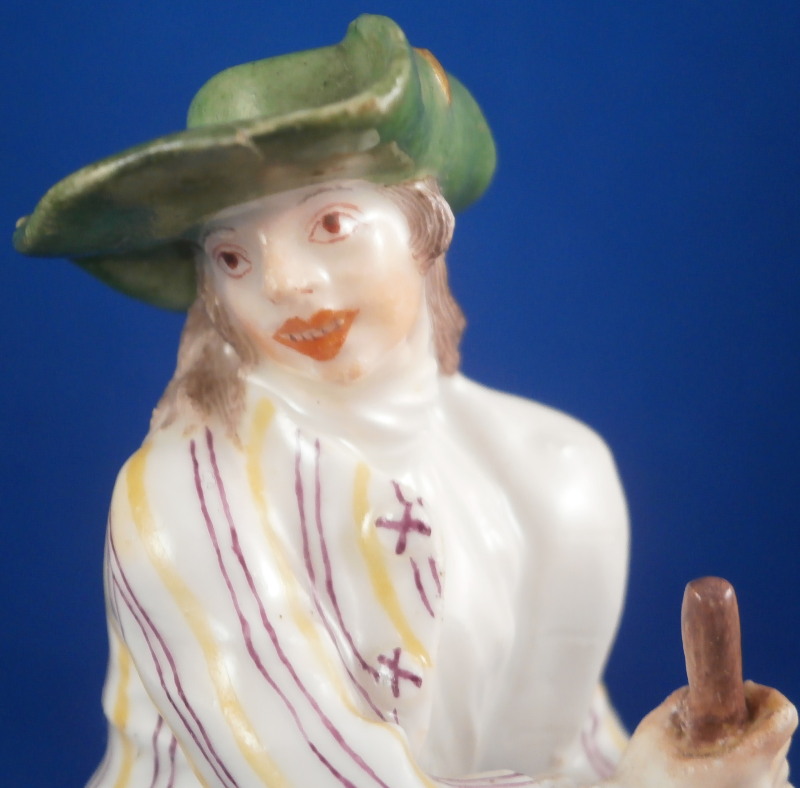 This is a nice figurine made by Meissen in about 1750. Likely one of the series of peasant folks they liked to model. The figure is of a gentleman hiking. He is holding a long stick, wearing a nice green hat and is dressed and a nicely decorated shirt and brown short pants that look a little worn. There are leaves on the base by his feet. The figurine displays very well but as is almost always the case with these really early figurines there is some damage. The hat has a small chip and also an older small restored chip, a little damage to the leaves, the foot that stick out in front of the base had some minor work done to the toes mostly on the underside and the stick has been broken and restored and broken again right under the lower hand. A bit of damages to both hands that has been repaired and is hard to spot since the fingers are towards the back side or pointing down. All in al is displays perfectly and is a really nice piece! He is 4.5 inches tall, 2 inches wide and 1.875 inches deep. The piece is marked with the under glaze blue crossed swords mark to the back of the base as shown. Underside is typical for the early pieces. Please email me for more information or other pictures.