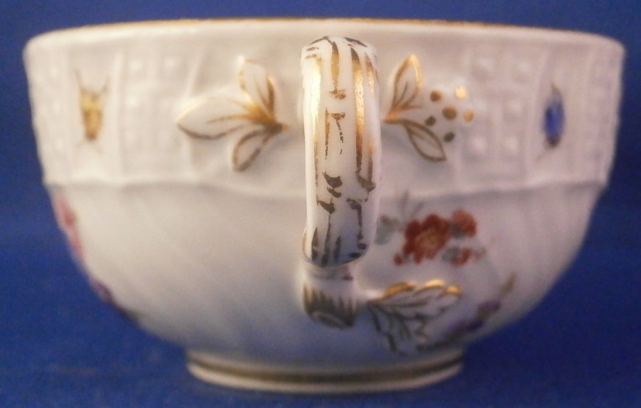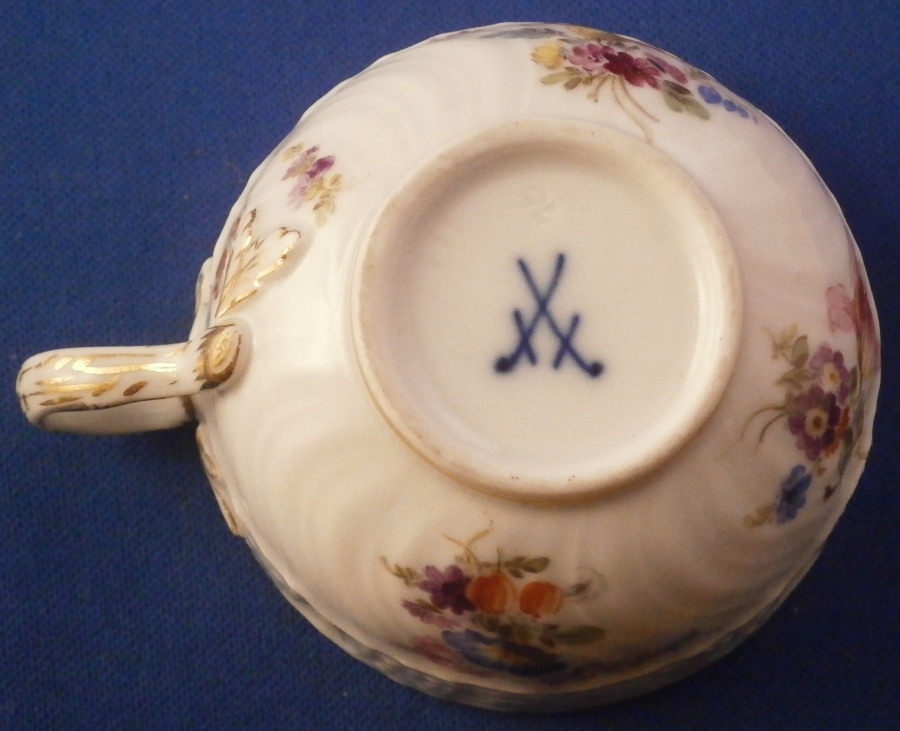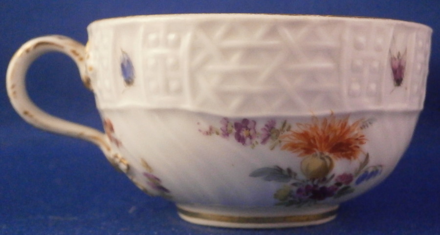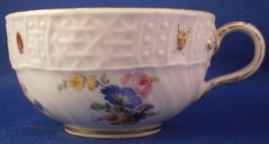 This is a demitasse sized cup and saucer made by Meissen in in the alte 19th century. It is the same design as the Hofservice made for the personal use of Kaiser Wilhelm the Second. Only difference really is that it does not have his monogram mark on it. A superb cup and saucer decorated in the Alt Brandenstein Pattern with a relief design to the rim with four hand painted bugs in between, a large central floral arrangement to the saucer and three larger flower arrangements to the cup as well as some scattered smaller flowers. Gold trim to the edges and handle. The set is in perfect condition. The saucer is 0.875 inches tall and has a diameter of 4.25 inches. The cup is 1.375 inches tall and has a diameter of 2.5 inches. Both pieces are marked underneath with the under glaze blue crossed swords as well as the usual impressed numbers common to Meissen pieces of this period as well as a painter's number 35 on the saucer. Please email me for more information or other pictures.