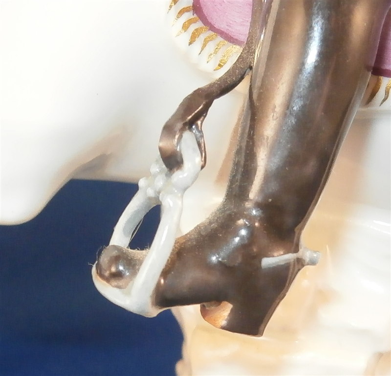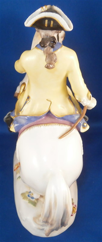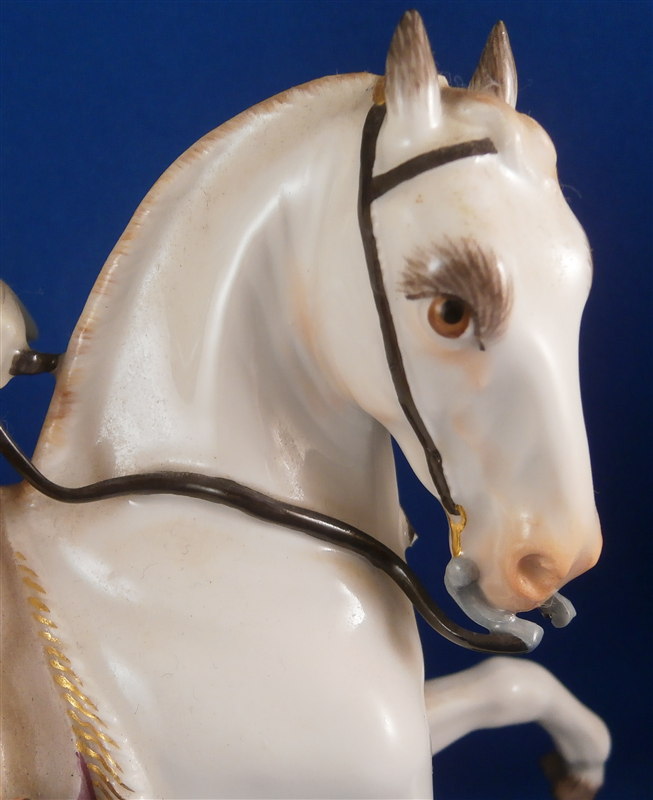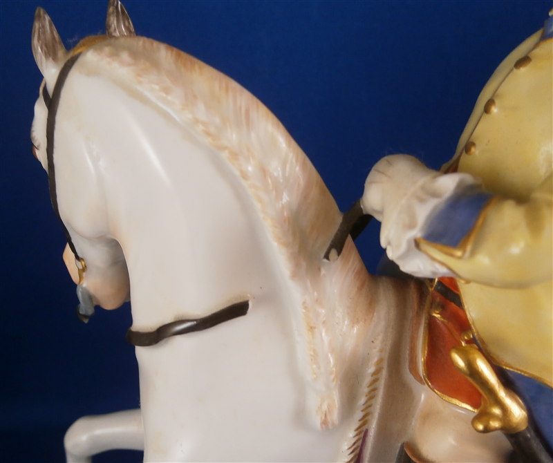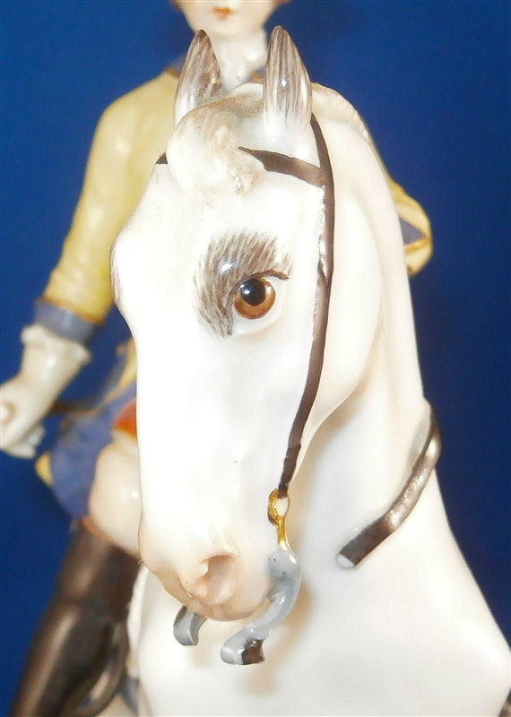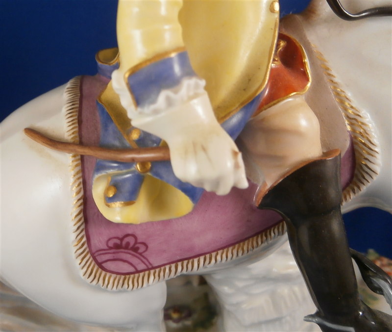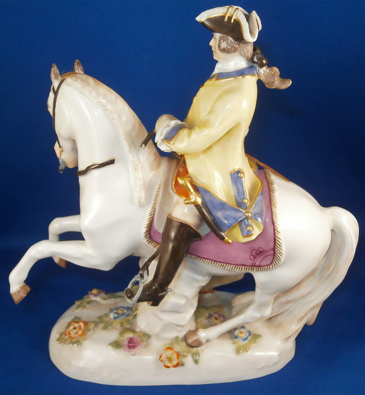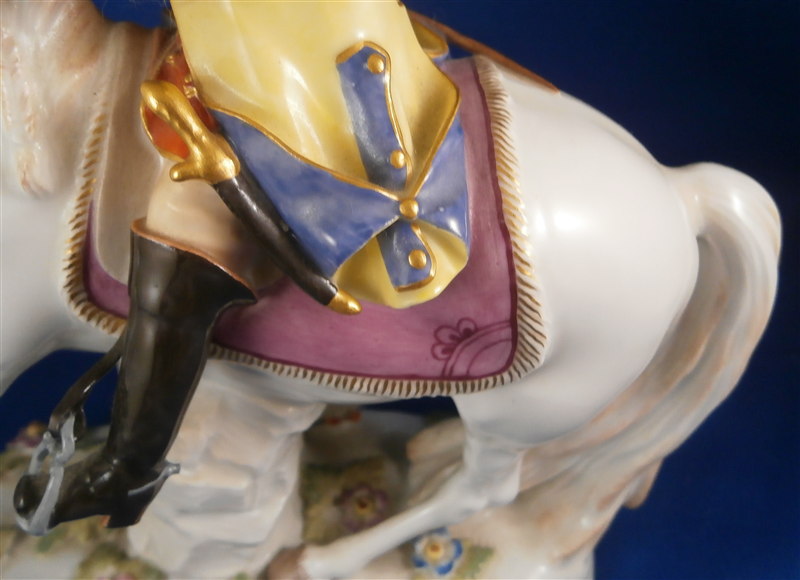This is a great figurine of a horseman riding his stallion made by Meissen in the 20th century. The figure is hand painted superbly and modelled perfectly just as we expect from the top maker. The figurine is in great condition with damage to the spurs, the top of his whip and part of the reigns as well as a few leaves. SInce the damage is minor and the reign damage is to the back the piece displays perfectly! The figure is marked underneath with the underglazed blue crossed swords mark as well as the usual impressed marks including the model number 2635 and a painter's number. The piece is 7.25 inches tall, 3.25 inches wide and 7 inches long. Please email me for more information or other pictures.