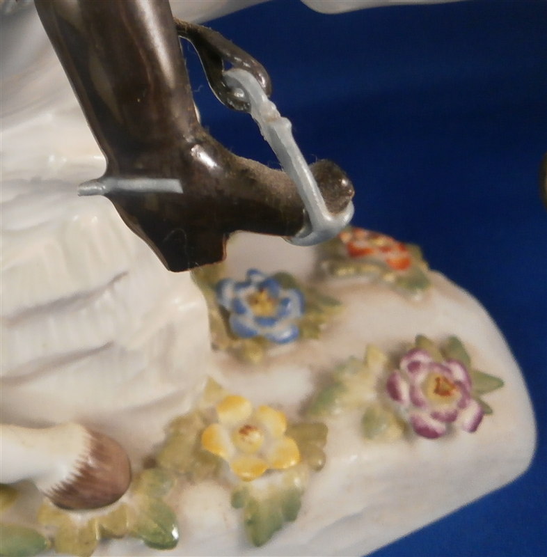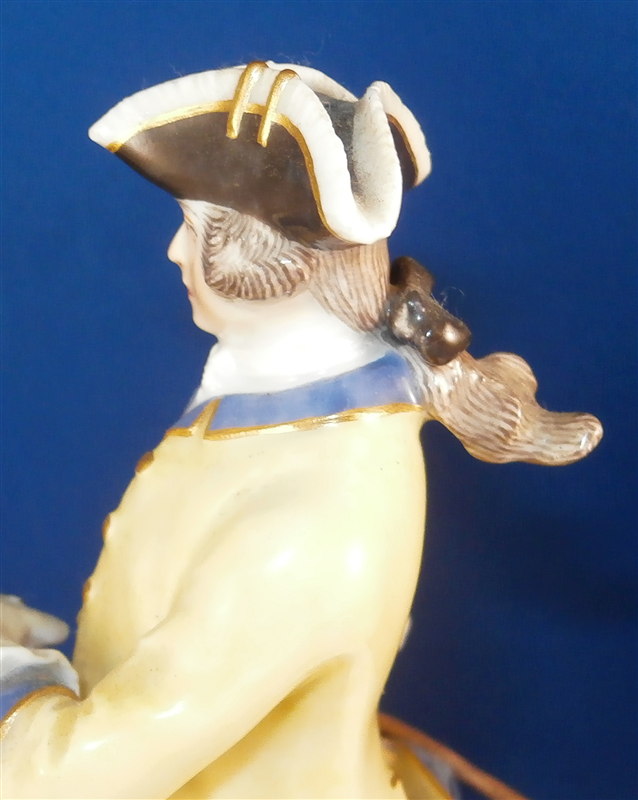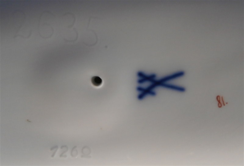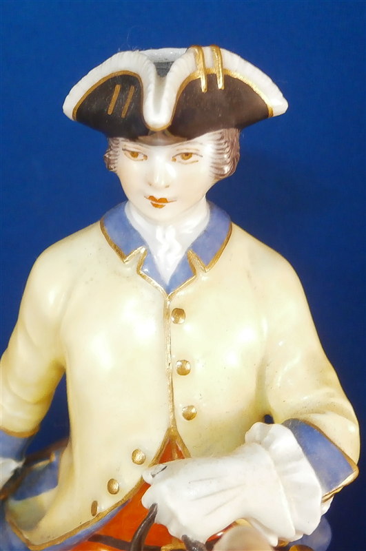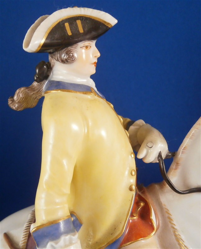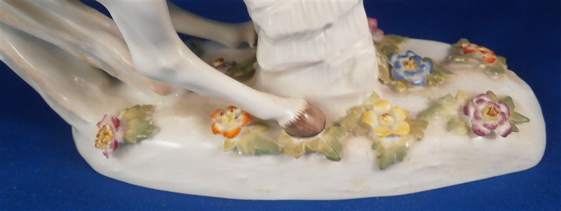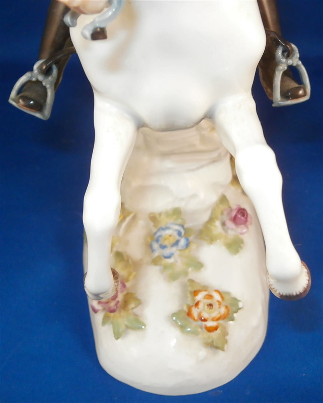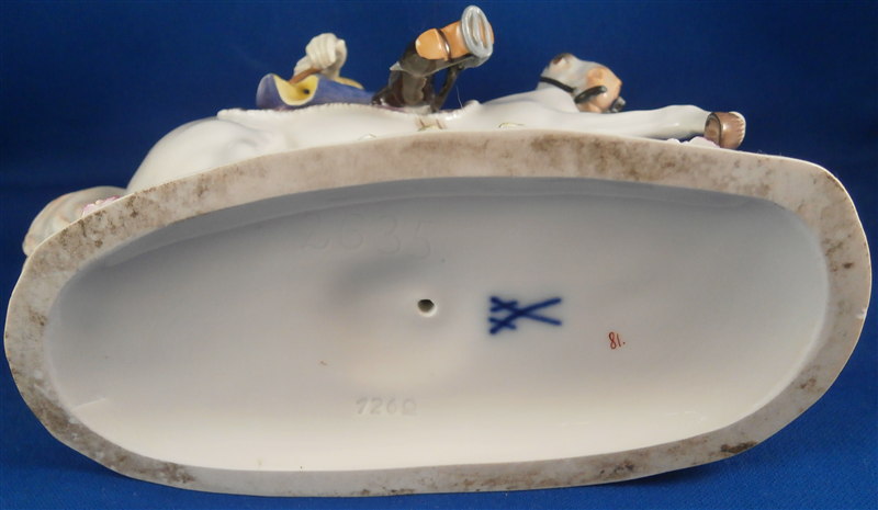This is a great figurine of a horseman riding his stallion made by Meissen in the 20th century. The figure is hand painted superbly and modelled perfectly just as we expect from the top maker. The figurine is in great condition with damage to the spurs, the top of his whip and part of the reigns as well as a few leaves. SInce the damage is minor and the reign damage is to the back the piece displays perfectly! The figure is marked underneath with the underglazed blue crossed swords mark as well as the usual impressed marks including the model number 2635 and a painter's number. The piece is 7.25 inches tall, 3.25 inches wide and 7 inches long. Please email me for more information or other pictures.