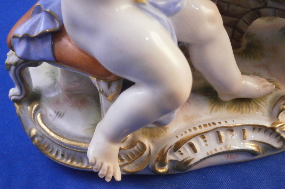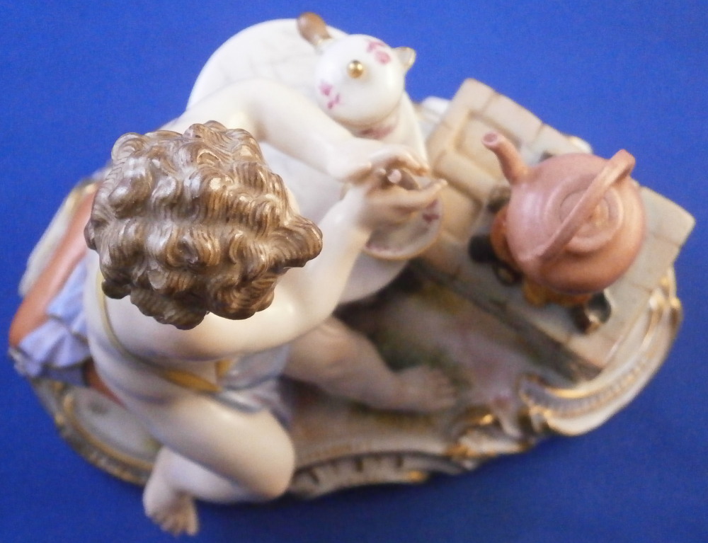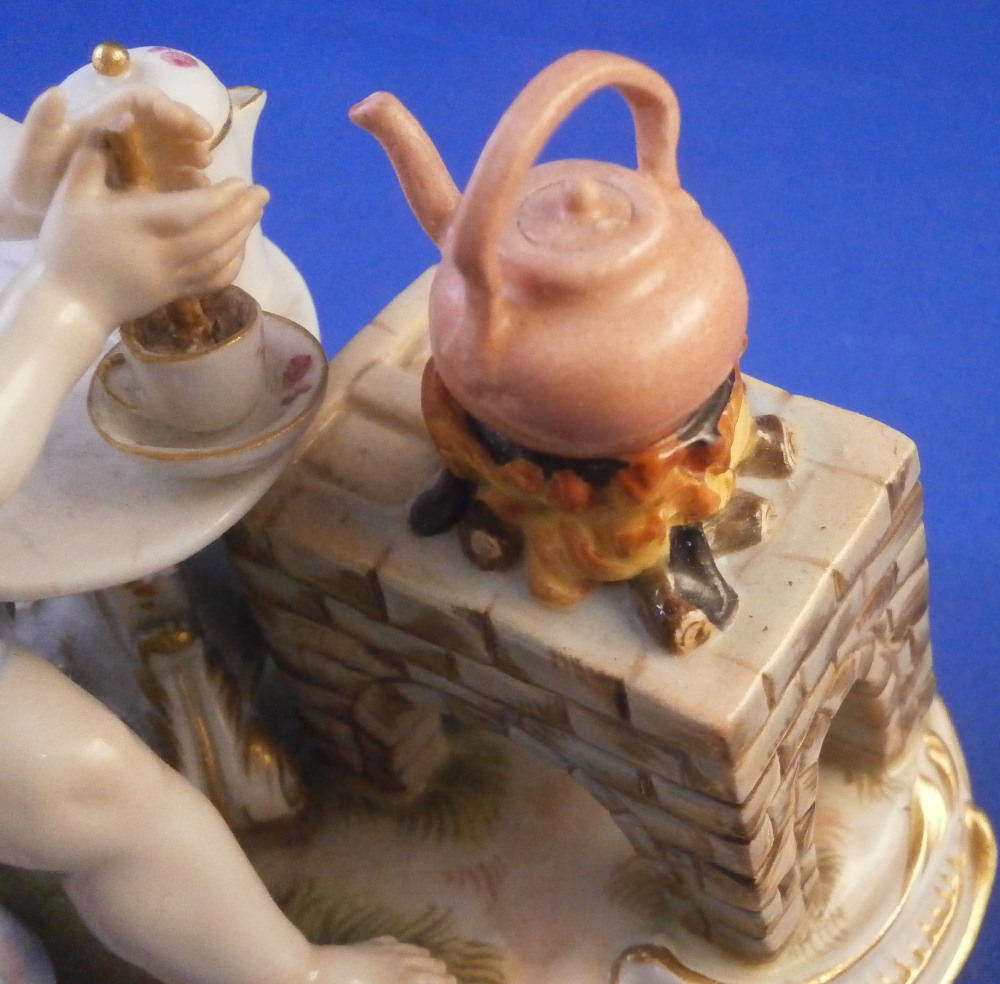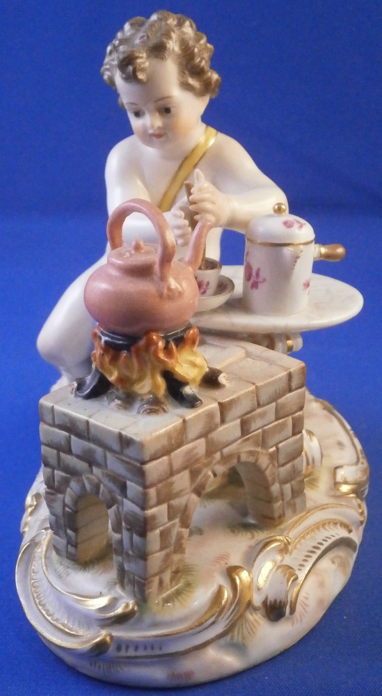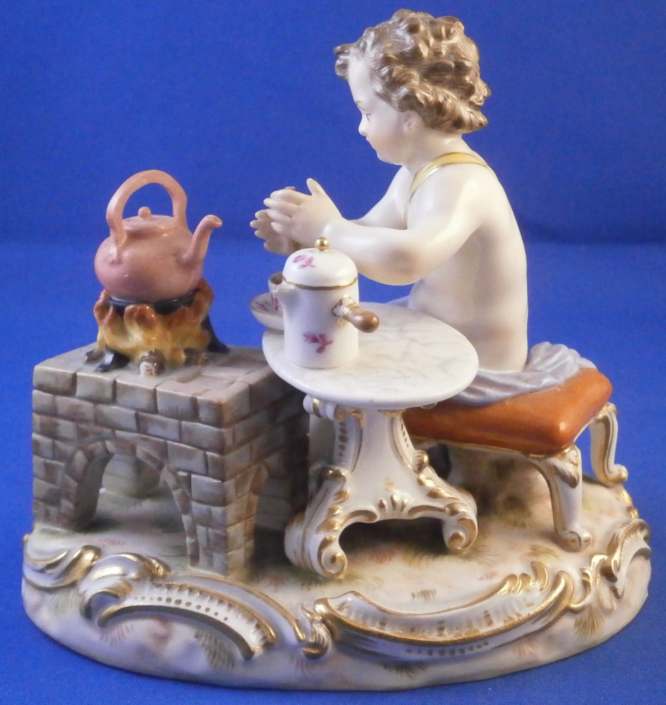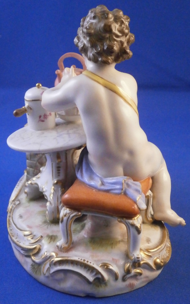 This is a really nice figurine emblematic of the element of fire made by Meissen in the late 19th century. Not a rare figurine by any means but it's a nice figurine in great condition. The piece is of a putto / young man making hot chocolate. The kettle is heating over the fire on the stove while he has the stick in his hands to mix the drink in his cup. The hot chocolate pot is stitting on the table and he is sitting on a stool on a typical base with raised scrolls all around highlighted with gilding. I also have the other figures from this series on the site - air, water and earth.The figure is very well modeled and hand painted very nicely. it's a gorgeous piece! It looks stunning on its own or even nicer in the set. The figurine is 4 inches tall, 4.5 inches wide and 2.75 inches deep. It is marked with the crossed swords mark underneath the base (first choice) as well as the usual impressed / incised marks and a painter's mark as shown. The piece is in great condition with the very tip of the mixing stick missing (not obvious at all) and a small chip to the bottom edge of the base in a location that does not show when on display since it is in the back of the side. Please email me for more information or other pictures.