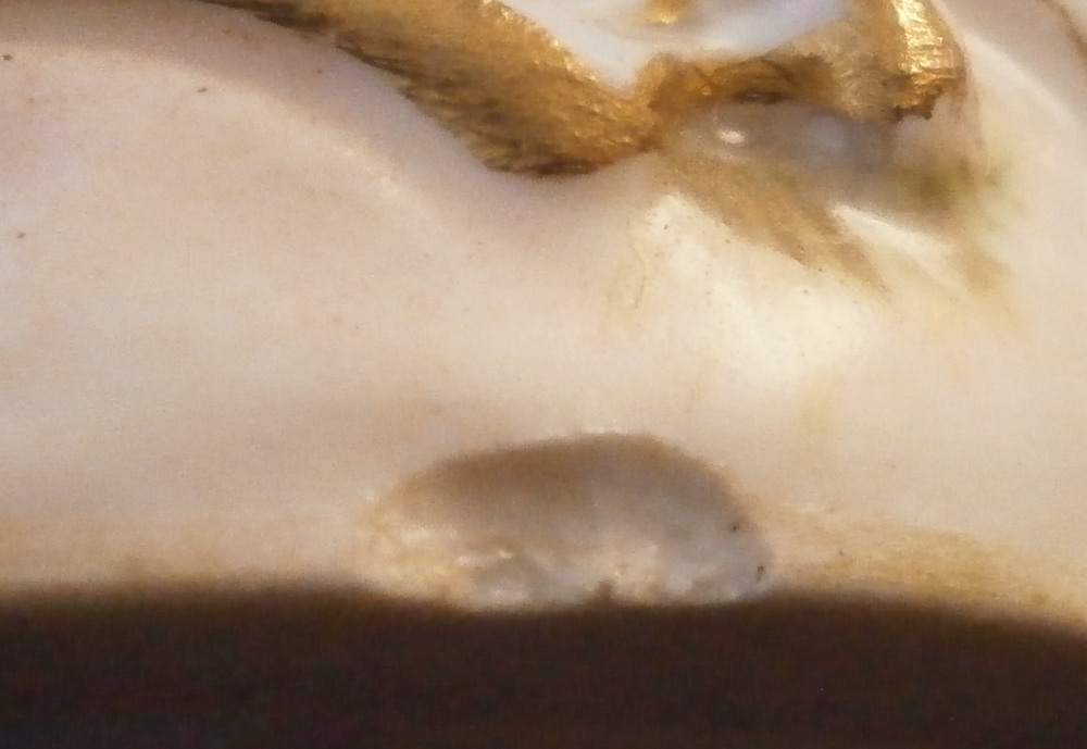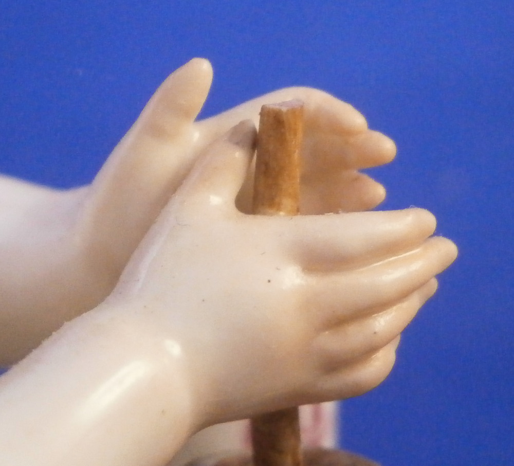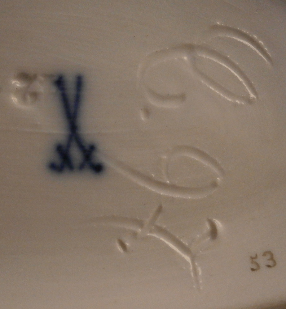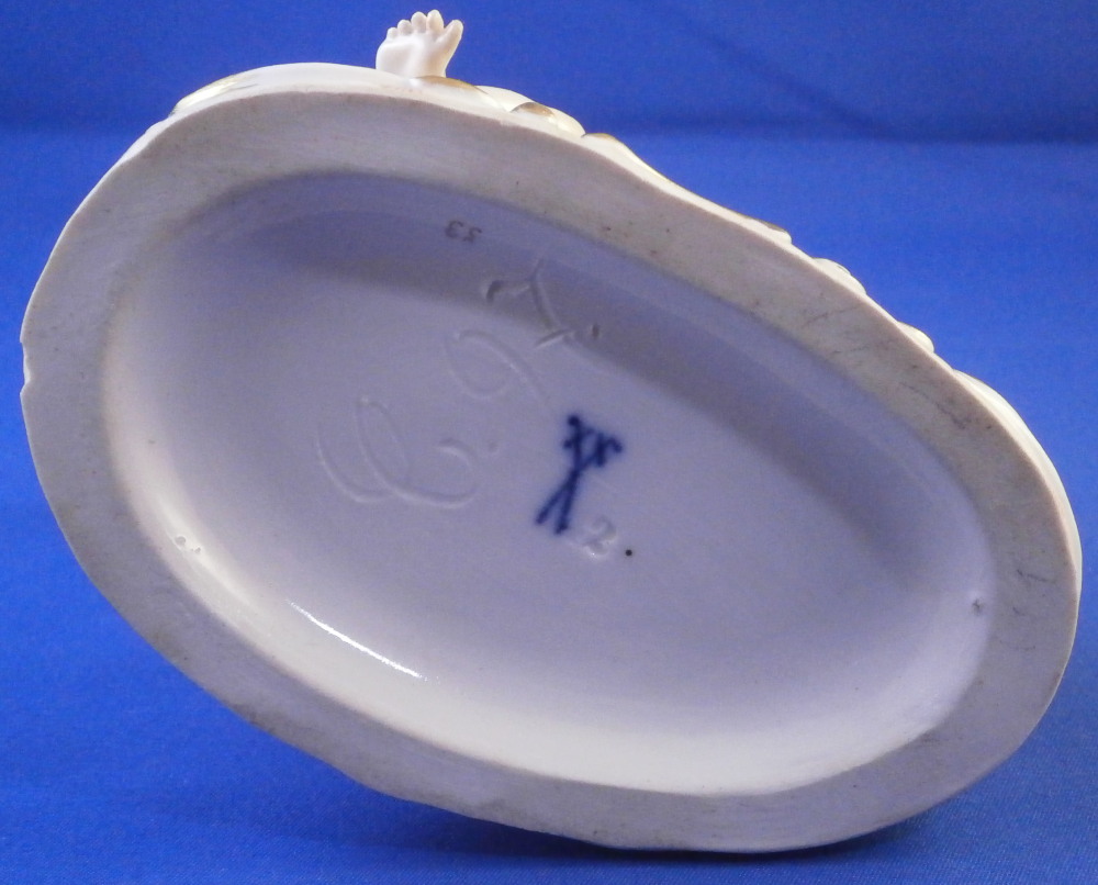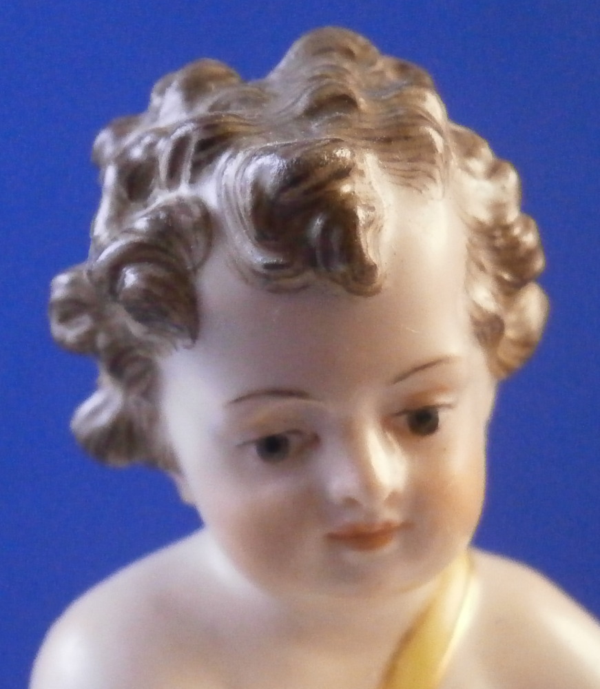 This is a really nice figurine emblematic of the element of fire made by Meissen in the late 19th century. Not a rare figurine by any means but it's a nice figurine in great condition. The piece is of a putto / young man making hot chocolate. The kettle is heating over the fire on the stove while he has the stick in his hands to mix the drink in his cup. The hot chocolate pot is stitting on the table and he is sitting on a stool on a typical base with raised scrolls all around highlighted with gilding. I also have the other figures from this series on the site - air, water and earth.The figure is very well modeled and hand painted very nicely. it's a gorgeous piece! It looks stunning on its own or even nicer in the set. The figurine is 4 inches tall, 4.5 inches wide and 2.75 inches deep. It is marked with the crossed swords mark underneath the base (first choice) as well as the usual impressed / incised marks and a painter's mark as shown. The piece is in great condition with the very tip of the mixing stick missing (not obvious at all) and a small chip to the bottom edge of the base in a location that does not show when on display since it is in the back of the side. Please email me for more information or other pictures.