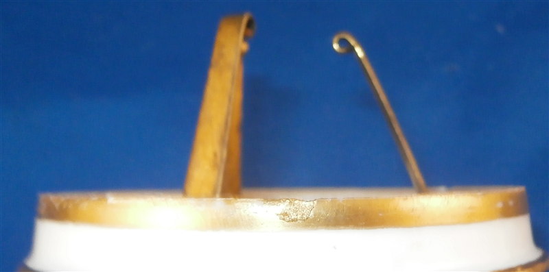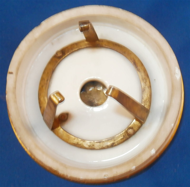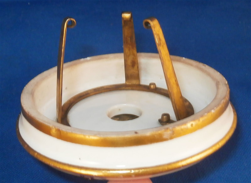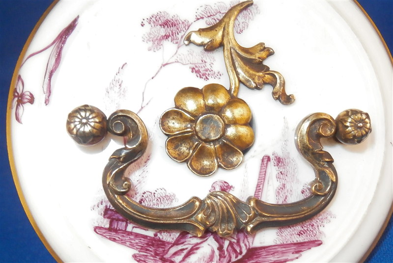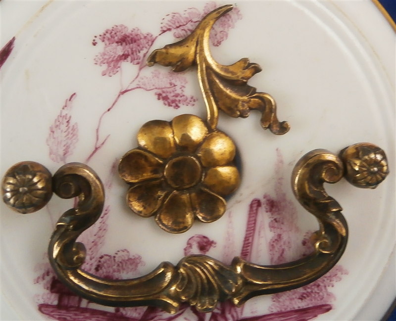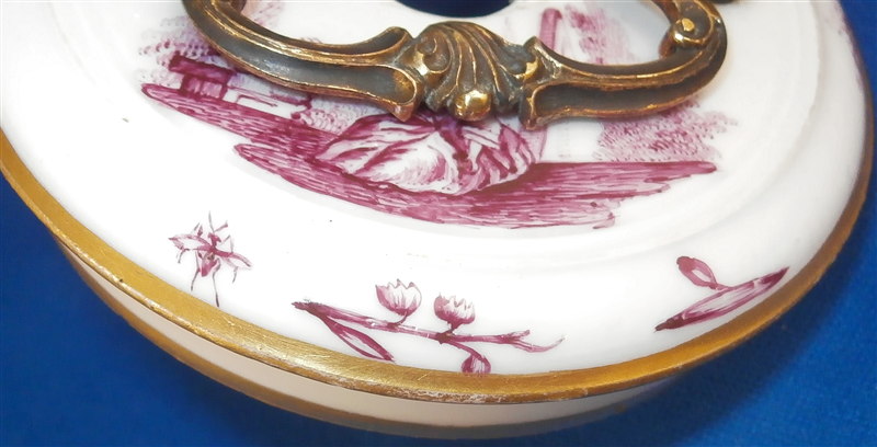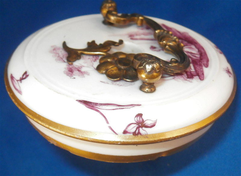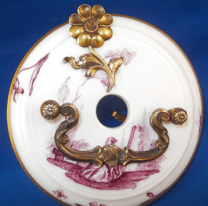 This is a superb lid to a hot chocolate pot made by Meissen in the mid 18th century. It is handpainted with a puce scene as well as lots of little bugs and flowers and a nice gold trim but the best part and likely the most useful part are the bronze mounts including the handle and the superb flower that covers the hole for the stirrer. The underside has three prongs that would make sure the lid stays in place when you pour the drink. The painting is of superb quality and the mounts have some amazing detail! The piece is 0.625 inches high and has a diameter of 3.25 inches. The inner diameter of the rim that would fit onto the pot is 2.625 inches. The lid is in superb condition with some nibbles around the edge some of which are gilded over and might be original. Nothing bad and one of the prongs has been bent so often that it will probably break the next time it is bend. Otherwise it is in top shape! Unmarked but definitely by Meissen from this period. Please email me for more information or other pictures.