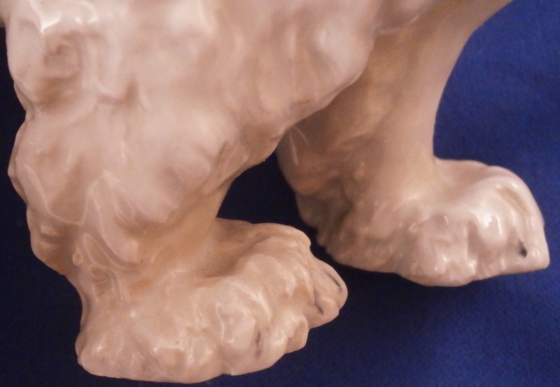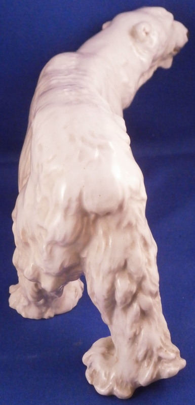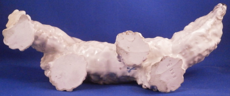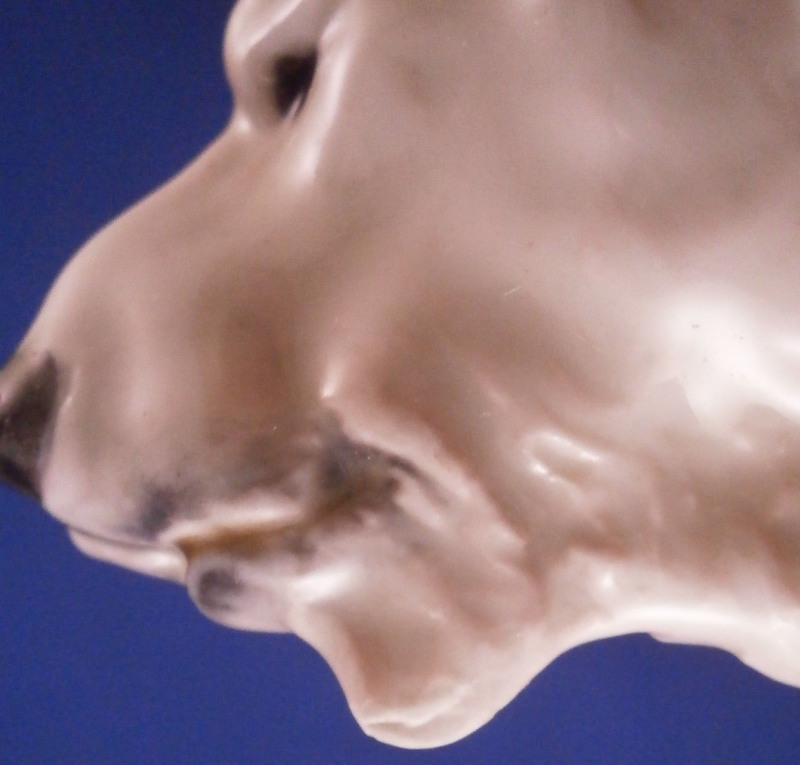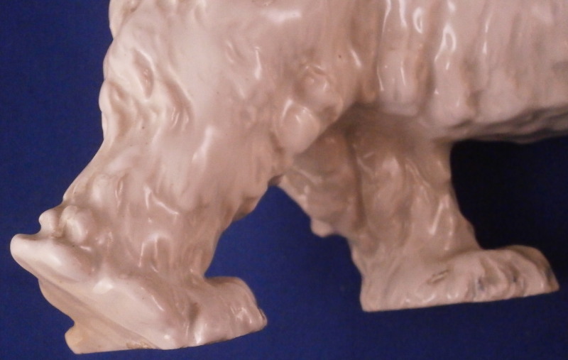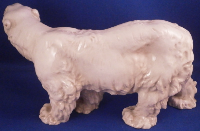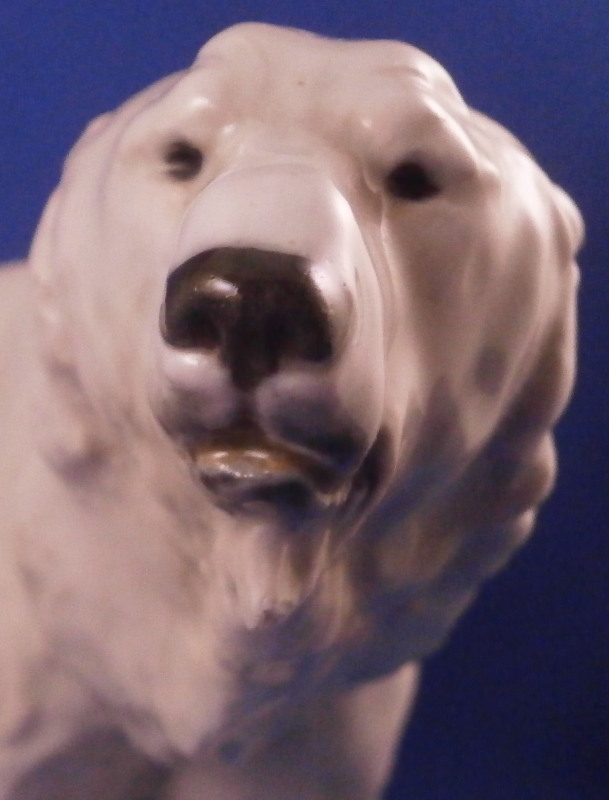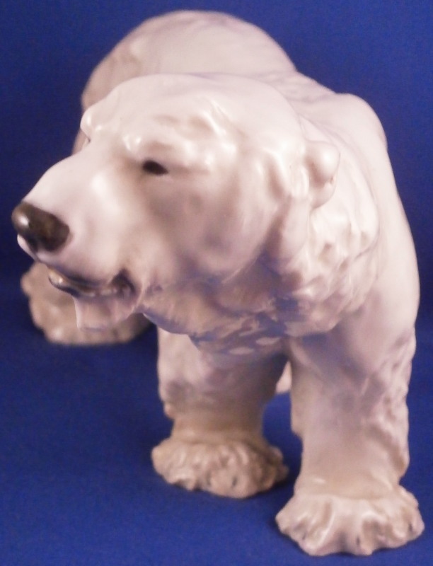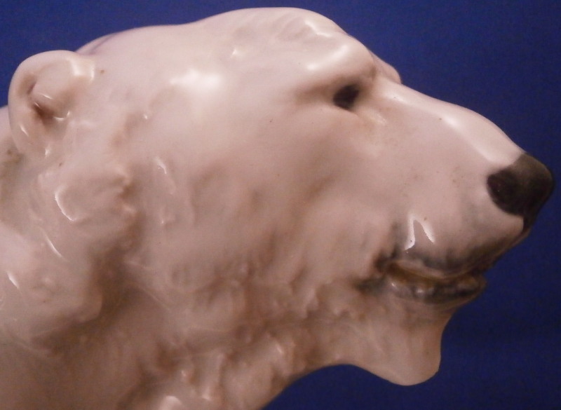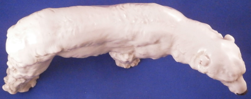 This is a great figurine of a polar bear made by Meissen in the early 20th century. It was first modeled by Otto Jarl who did some amazing animal figures in about 1910 and this figure here is from this early period. The piece is modeled superbly and very liflike and hand painted in slight shades of off white to look very natural not just plain white. The figurine is in great condition with a small chip to the backside of that little piece of fur hanging under his chin. Some firing suport residue from when he was made but he displays perfectly and looks terrific on display! He is marked underneath with the under glaze blue crossed swords mark from the original early 20th century as well as a painter's mark 10 in black and an impressed T182 as shown under one of his paws. The piece is 4.125 inches tall, 3 inches wide and 8.25 inches long. Please email me for more information or other pictures.