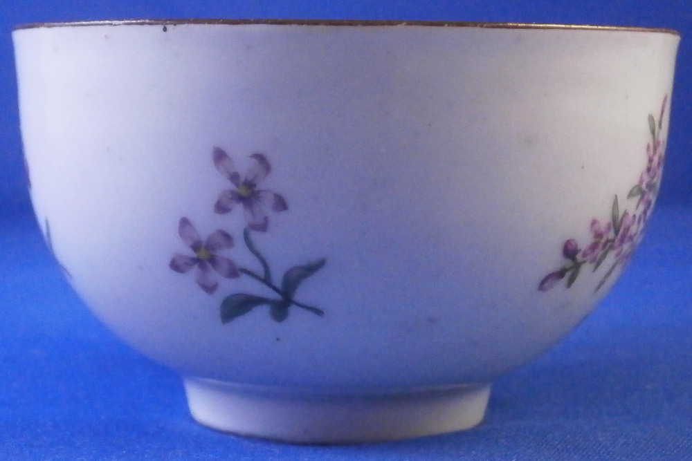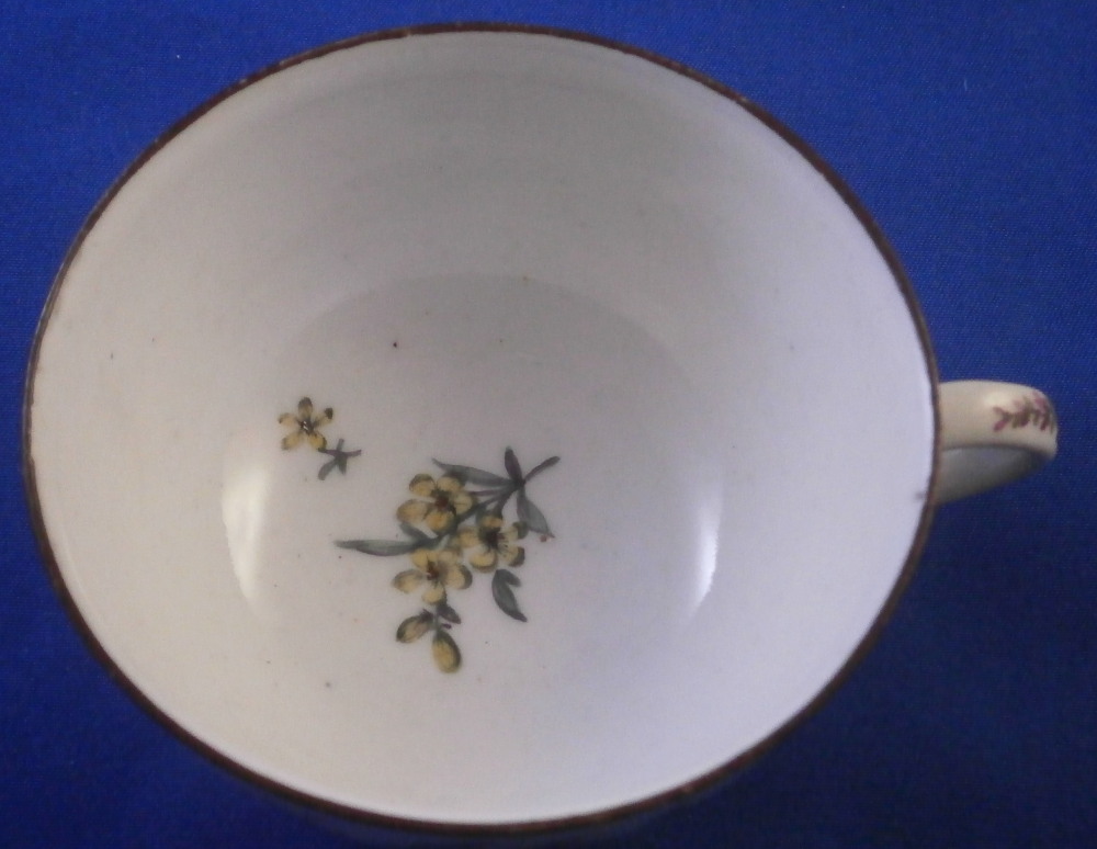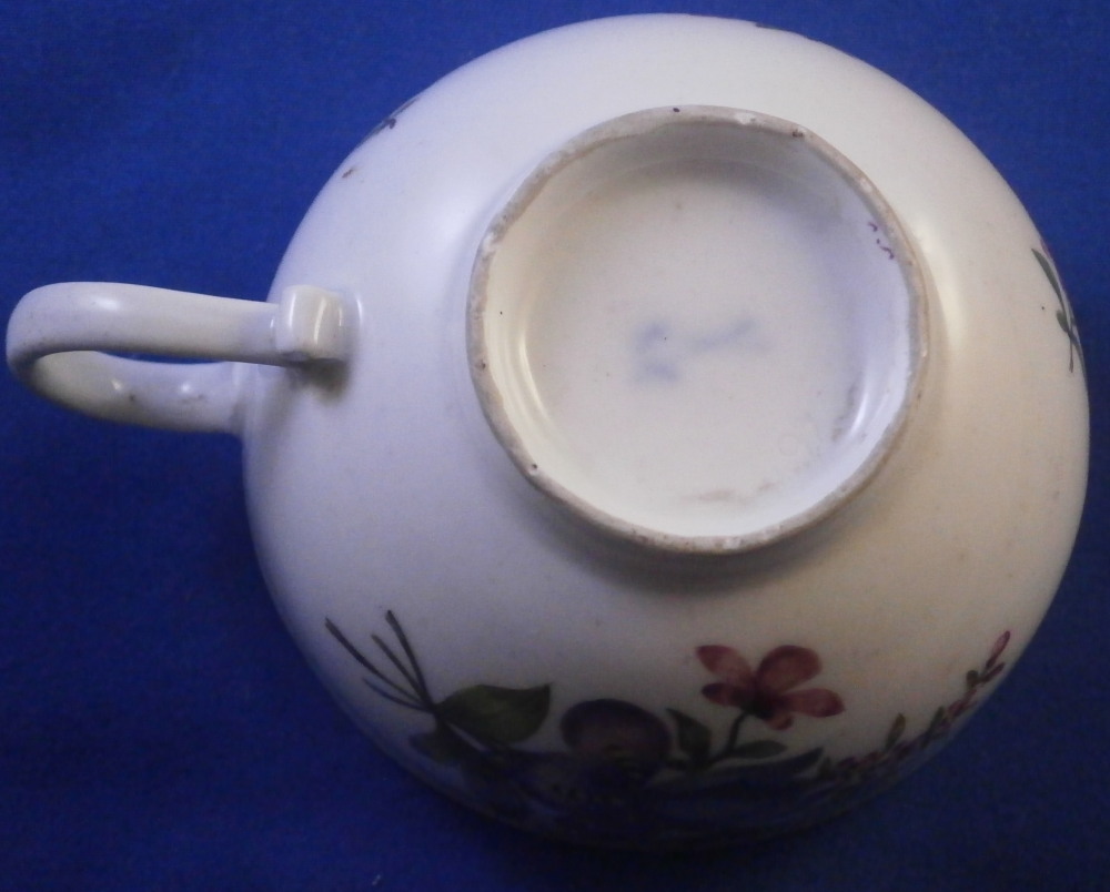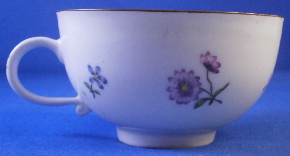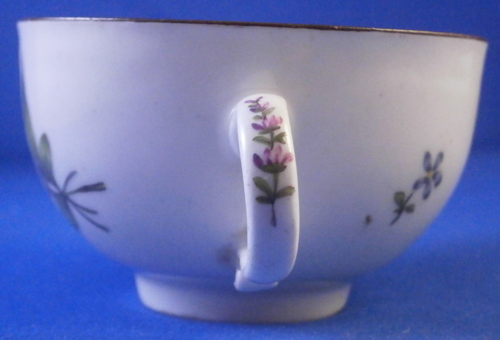 This is a nice single cup made by Meissen in about 1750. It is hand painted with a nice floral arrangement to the front in that in between style of Woodcut flowers and Deutsche Blumen and has three more single flowers to the other side. Brown trim to the top edge, a larger and a tiny flower to the inside bottom and a flower to the handle as well. A great looking set that one should easily find a saucer for. The cup is in perfect condition with a couple of very minor and typical manufacturing flaws. Displays perfectly! The piece is marked underneath with the crossed swords mark as shown as well as an impressed number and a puce painter's mark that is on the very edge and hard to decipher. The cup is 1.625 inches tall and has a diameter of 2.75 inches with the handle sticking out on one side. Please email me for more information or other pictures.
