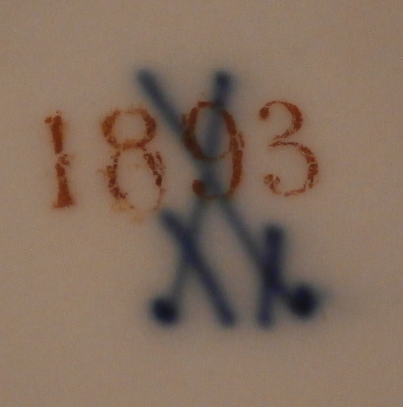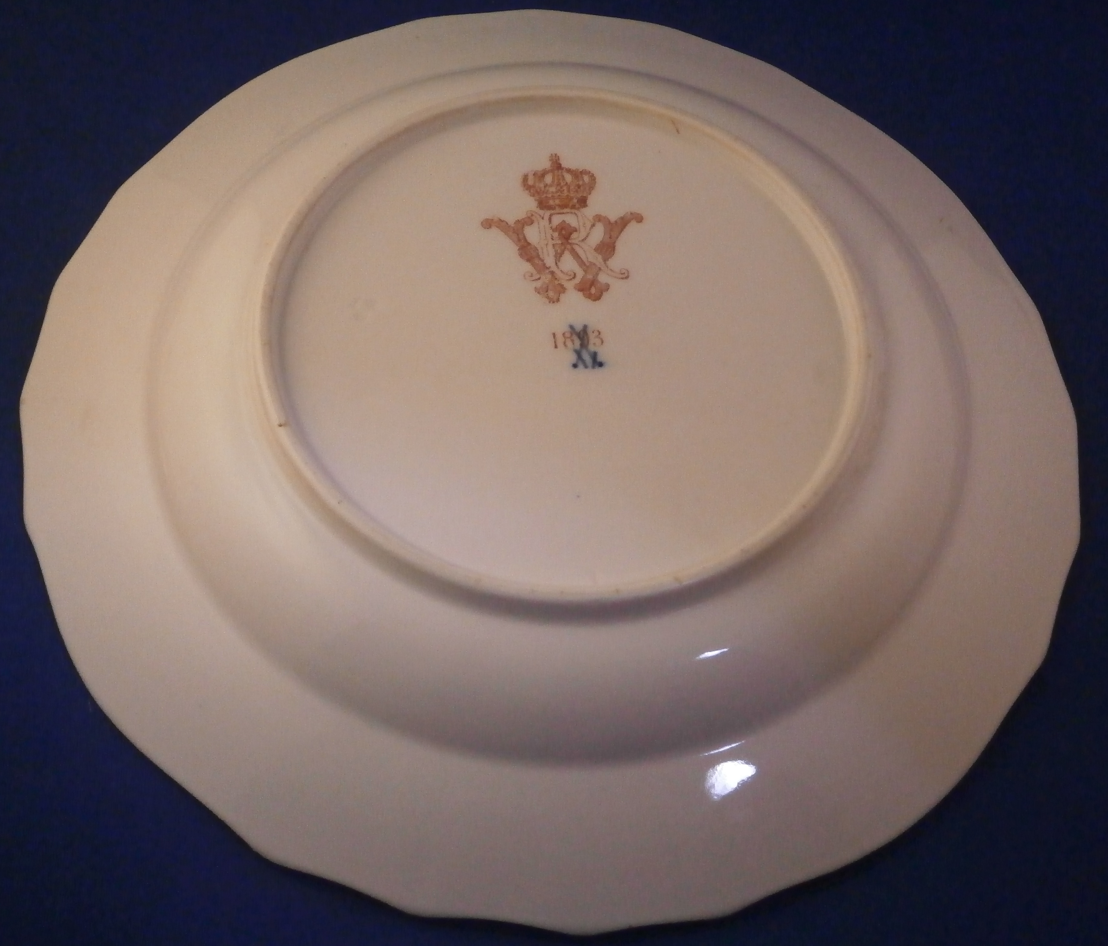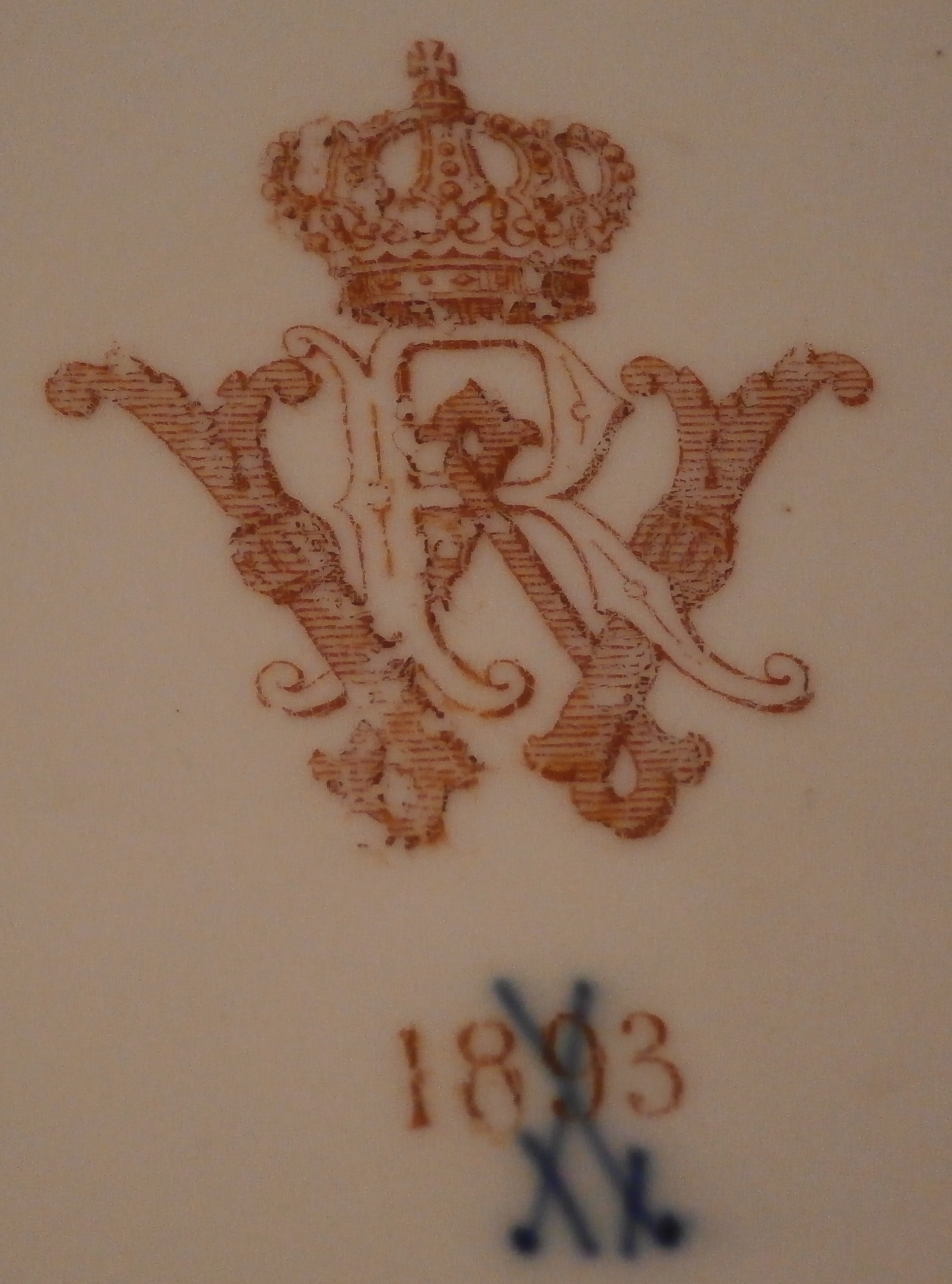 This is a plate / soup bowl made by Meissen in 1893 for the personal use of Kaiser Wilhelm the Second. Quite rare to find these nowadays! A great plate with a relief design to the rim with four bugs in between, a large central floral arrangement and lots of scattered smaller flowers and more bugs. Gold trim to the nicely shaped edge. What makes this piece special besides being a nicely done piece is the fact that it was made for the Kaiser and has his personal monogram is on the back! The plate is in perfect condition with a tiny bit of wear and a popped glaze bubble to the backside rim as shown. As good as it gets really! The plate is 1.5 inches tall and has a diameter of 9.75 inches. It is marked underneath with the underglaze blue crossed swords as well as the usual impressed numbers common to Meissen pieces of this period and off course the WR under a crown and the year 1893 under that. Please email me for more information or other pictures.