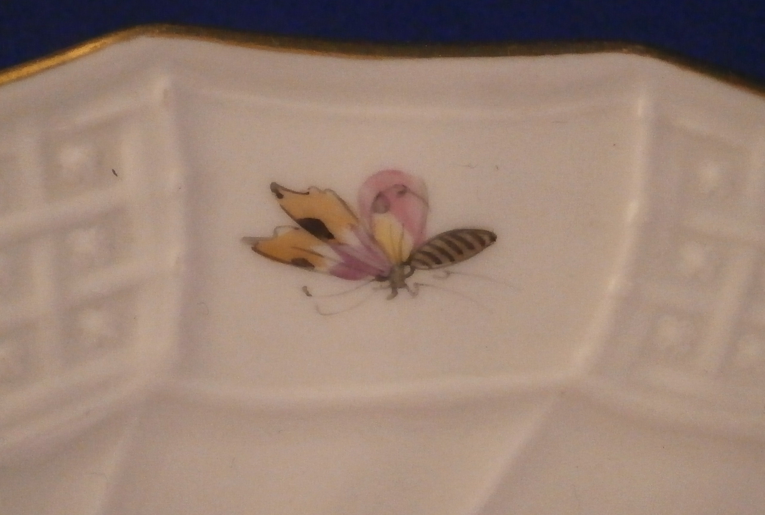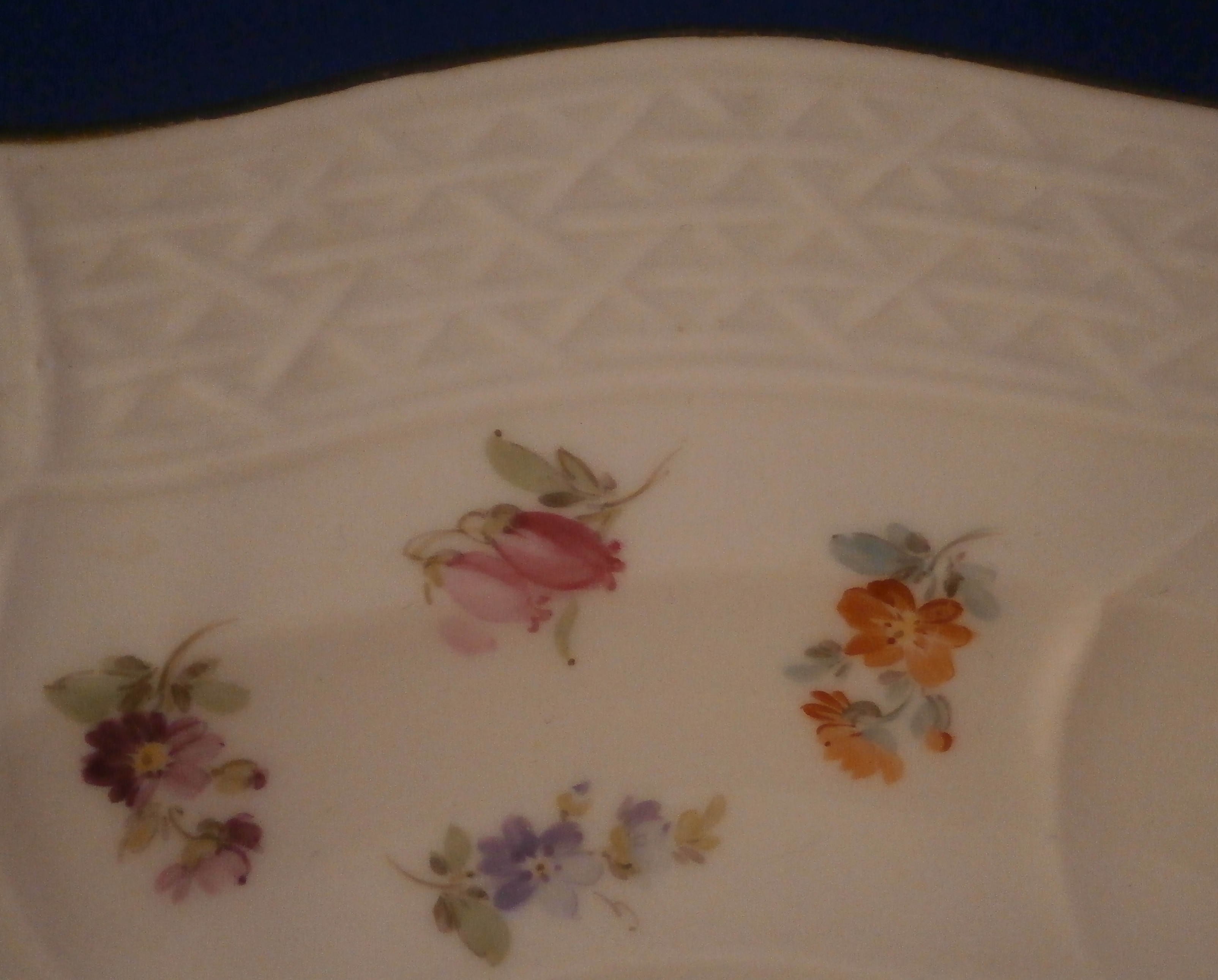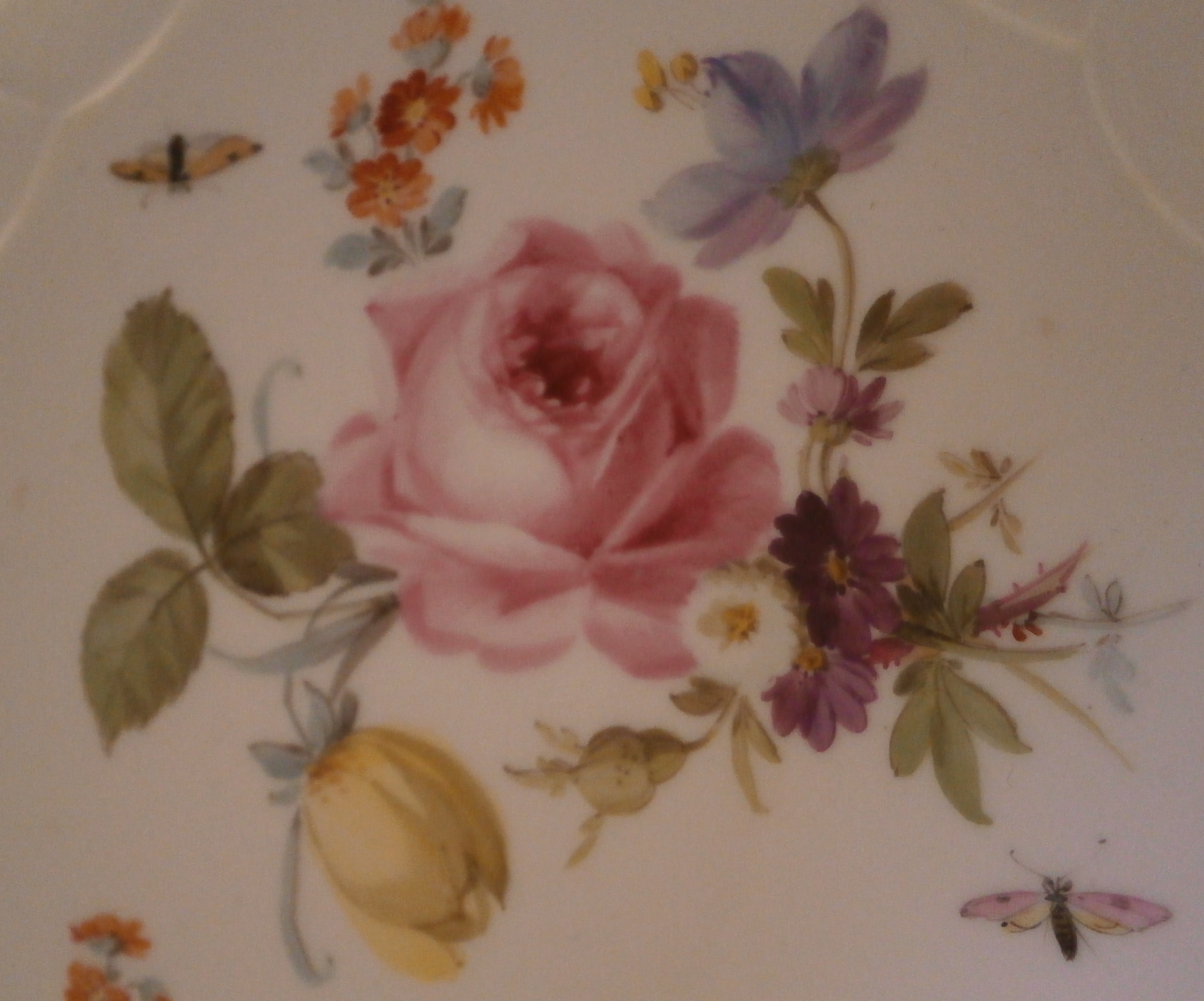 This is a plate / soup bowl made by Meissen in 1893 for the personal use of Kaiser Wilhelm the Second. Quite rare to find these nowadays! A great plate with a relief design to the rim with four bugs in between, a large central floral arrangement and lots of scattered smaller flowers and more bugs. Gold trim to the nicely shaped edge. What makes this piece special besides being a nicely done piece is the fact that it was made for the Kaiser and has his personal monogram is on the back! The plate is in perfect condition with a tiny bit of wear and a popped glaze bubble to the backside rim as shown. As good as it gets really! The plate is 1.5 inches tall and has a diameter of 9.75 inches. It is marked underneath with the underglaze blue crossed swords as well as the usual impressed numbers common to Meissen pieces of this period and off course the WR under a crown and the year 1893 under that. Please email me for more information or other pictures.