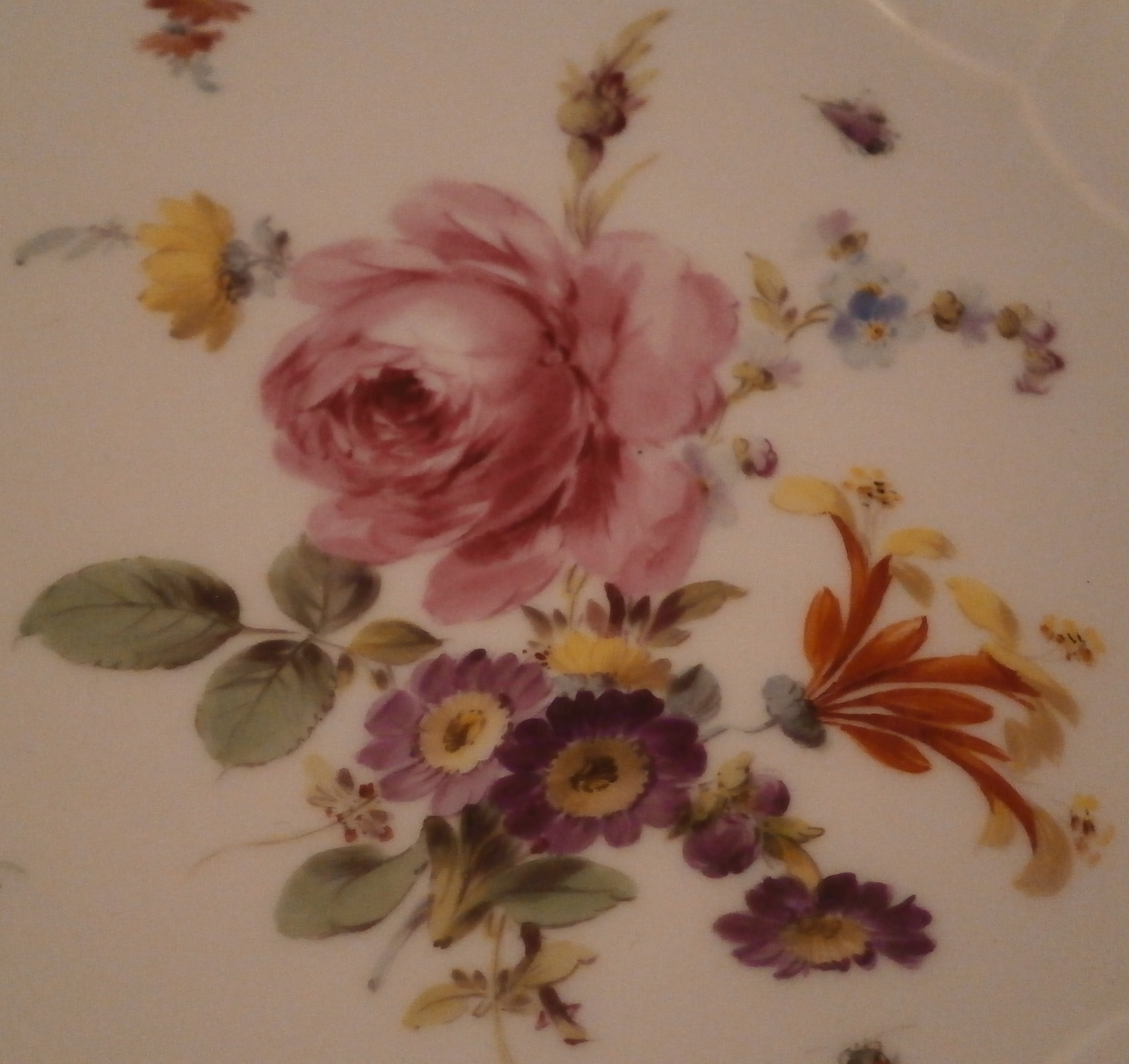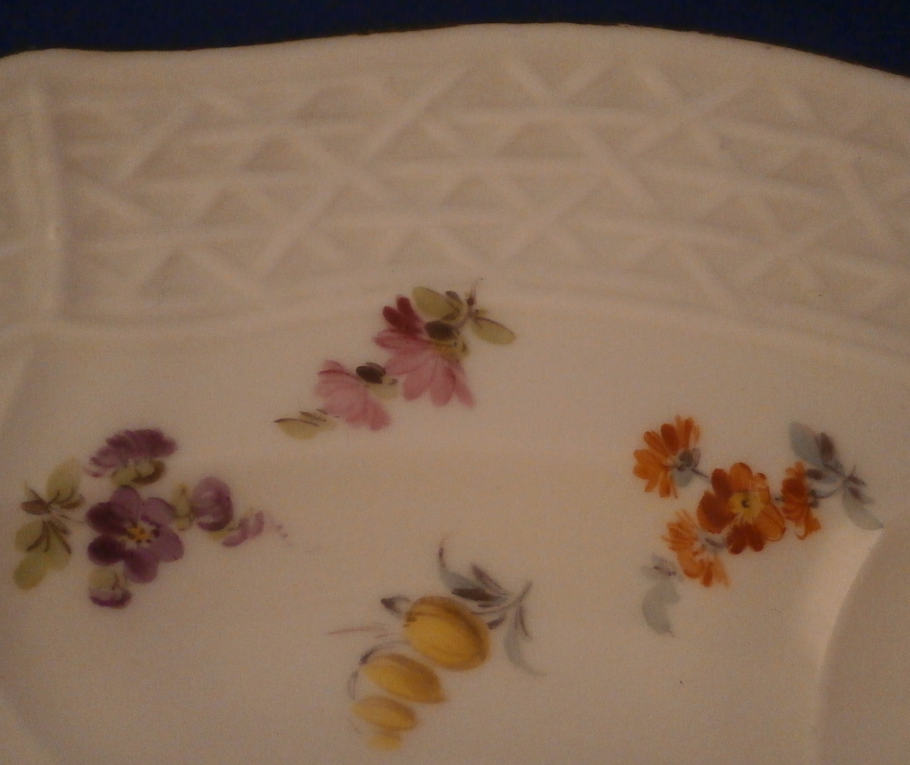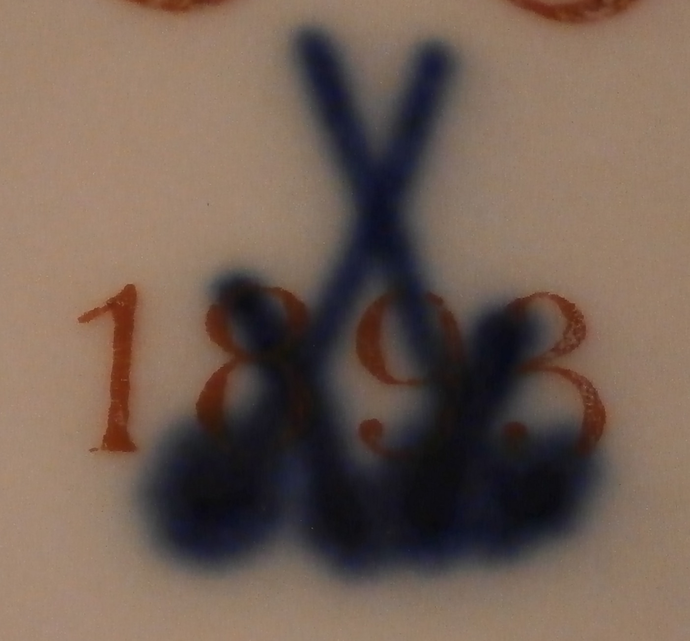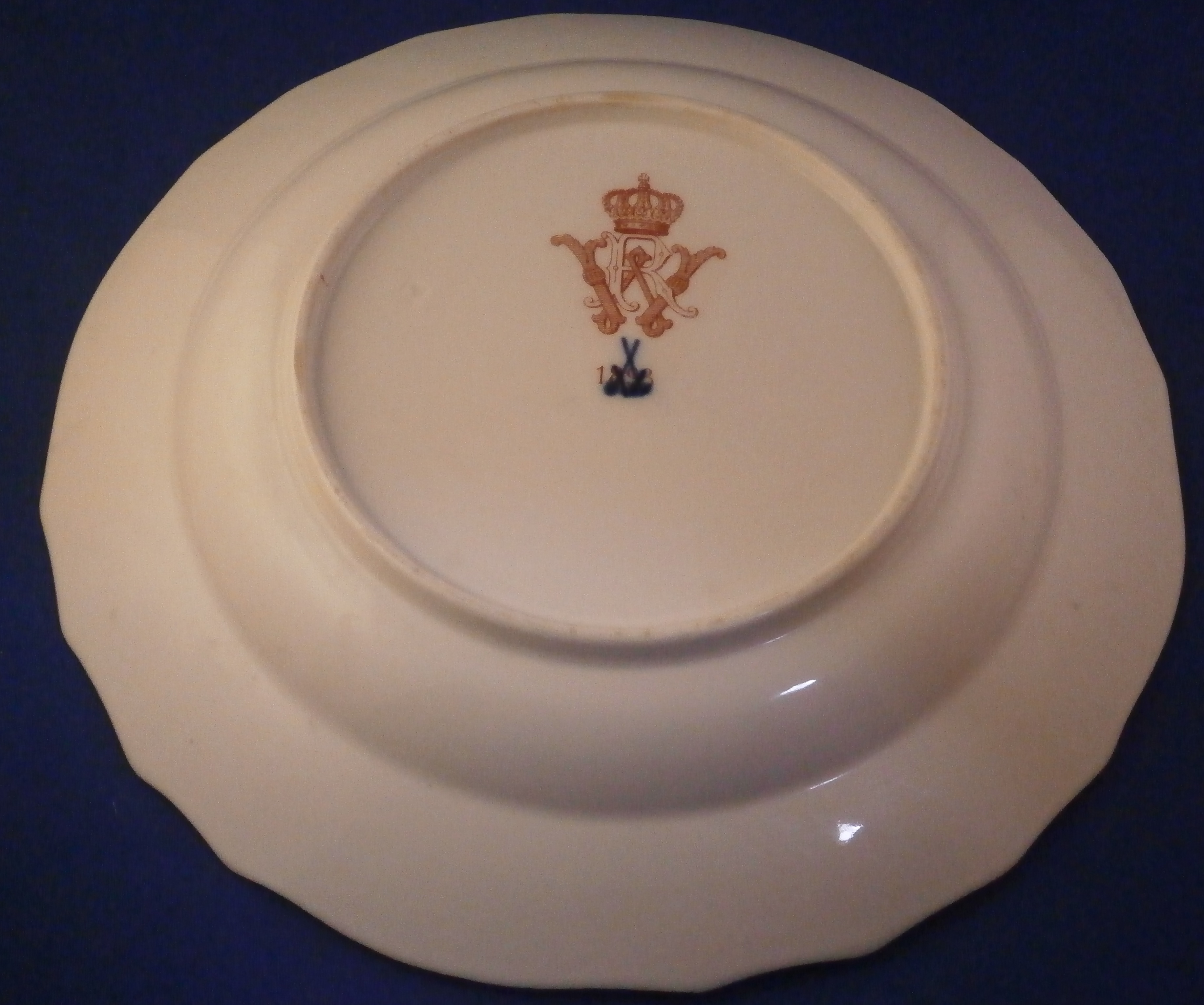 This is a plate / soup bowl made by Meissen in 1893 for the personal use of Kaiser Wilhelm the Second. Quite rare to find these nowadays! A great plate with a relief design to the rim with four bugs in between, a large central floral arrangement and lots of scattered smaller flowers and more bugs. Gold trim to the nicely shaped edge. What makes this piece special besides being a nicely done piece is the fact that it was made for the Kaiser and has his personal monogram is on the back! The plate is in perfect condition with a tiny bit of wear and a popped glaze bubble to the backside rim as shown. As good as it gets really! The plate is 1.5 inches tall and has a diameter of 9.75 inches. It is marked underneath with the underglaze blue crossed swords as well as the usual impressed numbers common to Meissen pieces of this period and off course the WR under a crown and the year 1893 under that. Please email me for more information or other pictures.