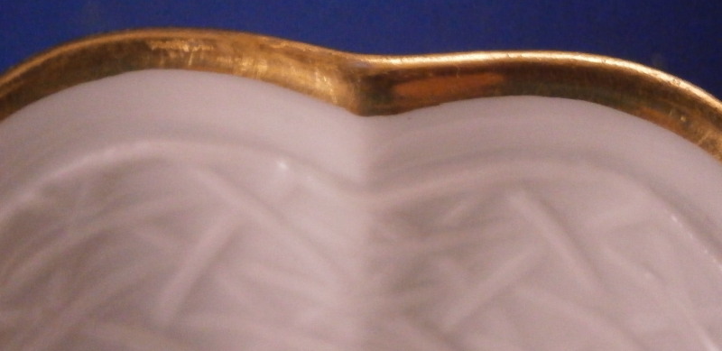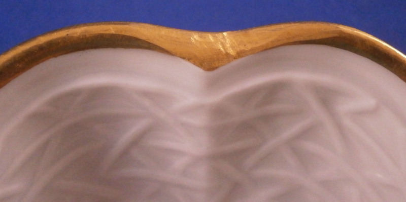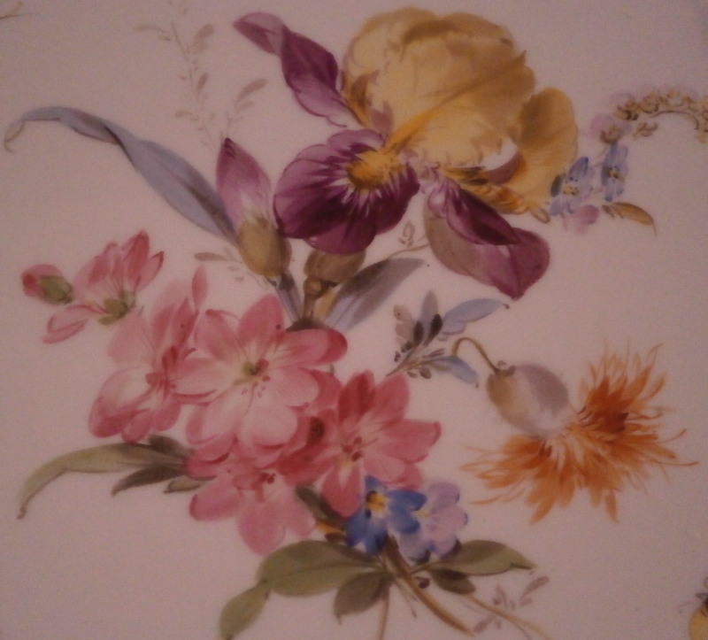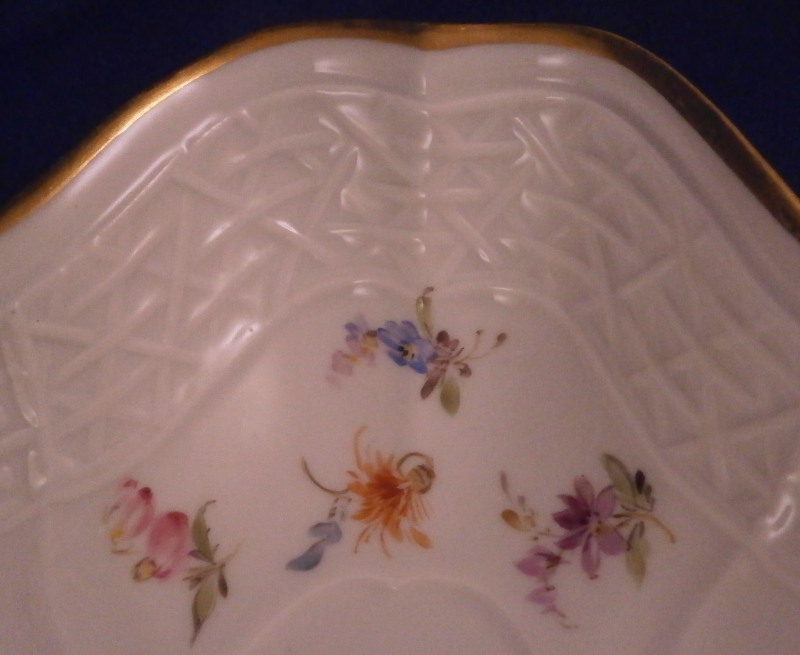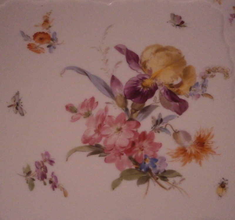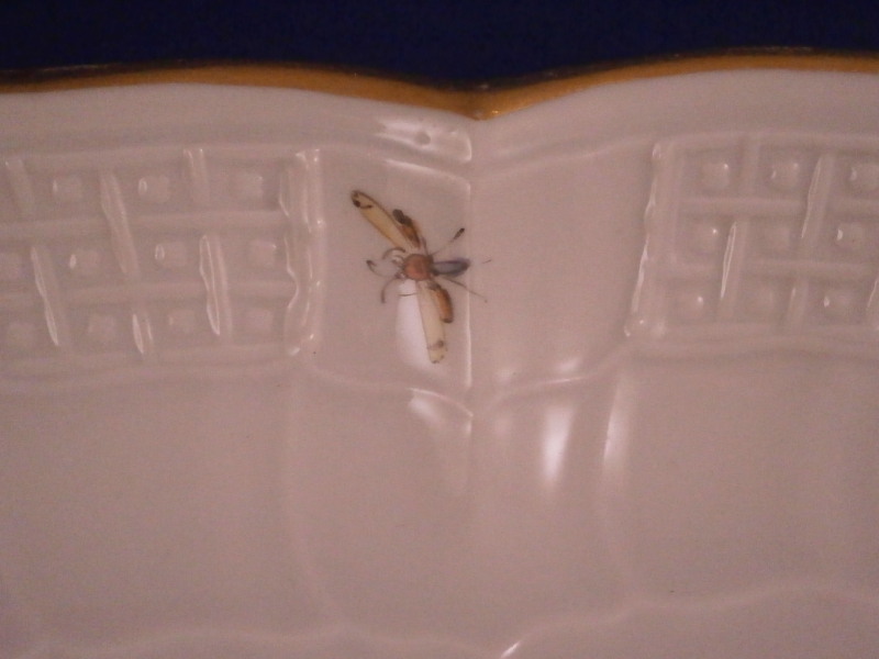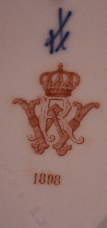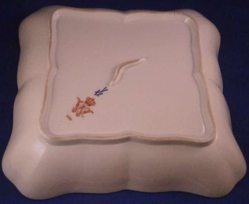 This is a square serving bowl / dish made by Meissen in 1898 for the personal use of Kaiser Wilhelm the Second. Quite rare as he preferred the ones made by KPM of which I own a few (not to say those are common either:) A great dish with a relief design to the rim with four bugs in between, a large central floral arrangement and lots of scattered smaller flowers and more bugs. Gold trim to the edge. What makes this piece special besides being a nicely done piece is the fact that it was made for the Kaiser and has his personal monogram on the back! The piece is in superb condition with a small ground down area along the edge in one corner as shown but this was done at the factory since the gilding is continuous and was not redone and that can only be done by Meissen themselves. One small firing crack to the foot ring on the udnerside as shown. It displays perfectly and is really a very nice dish! The dish is 1.75 inches tall and 9.375 inches wide at the widest point. It is marked underneath with the under glaze blue crossed swords as well as the usual impressed markss common to Meissen pieces of this period and off course the WR under a crown and the year 1898 under that. Please email me for more information or other pictures.