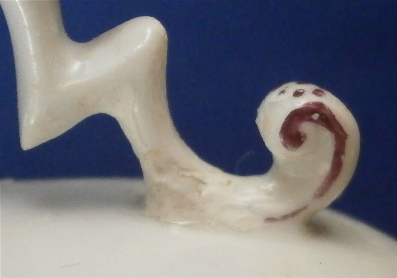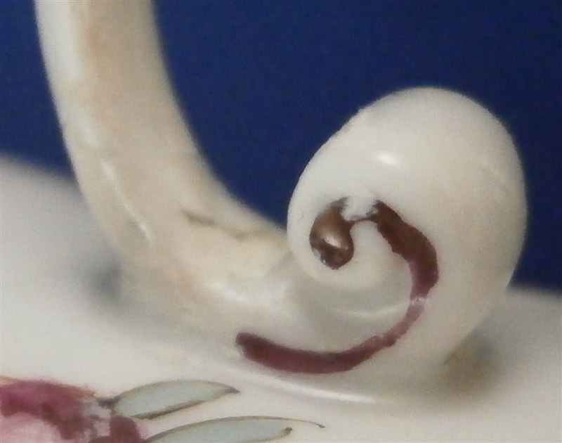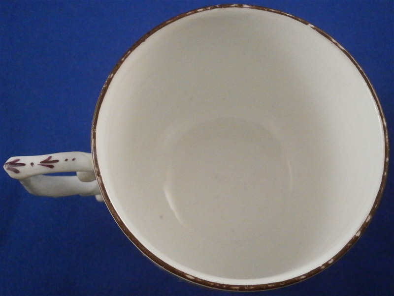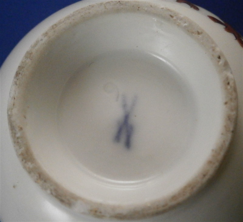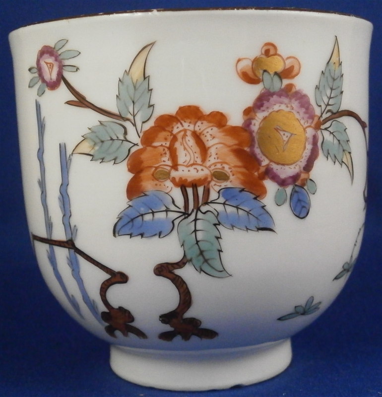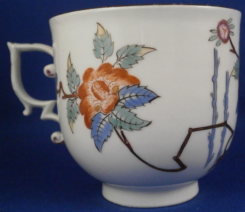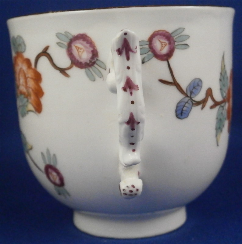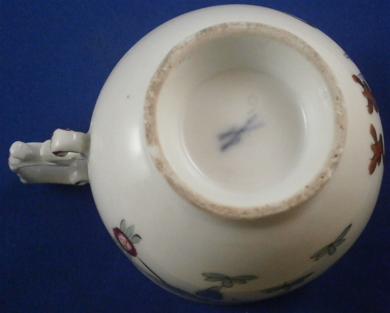 This is superbcup made by Meissen in about 1740. It is hand painted in the Kakiemon style with flowering chrysanthemum branches all around - a pattern I have not seen before that is quite stunning! The handle is in my favorite shape with a bit of puce trim to it and the top edge has a brown trim to it. The Kakiemon colors of this period are some of my favorites and this is one superb design! Sadly the cup has had the handle off and restored back on. It display perfectly so it's not the end of the world :) The piece is marked underneath with the crossed swords mark as shown as well as an impressed number. It is 2.625 inches tall and has a diameter of 2.75 inches. Please email me for more information or other pictures.