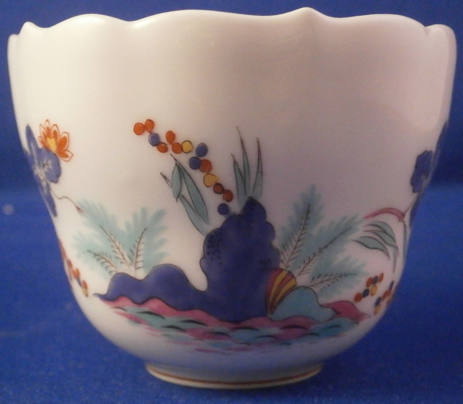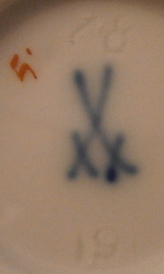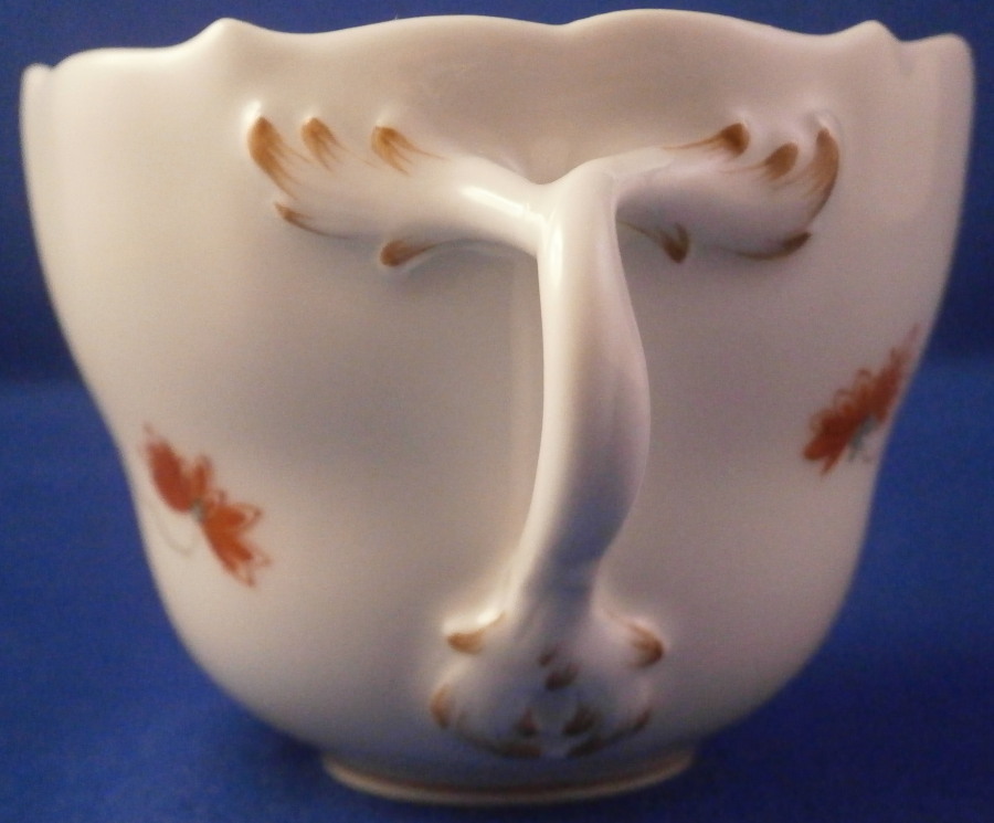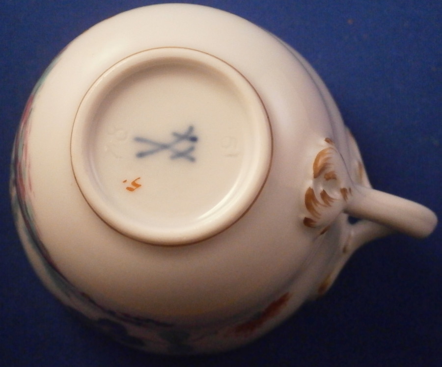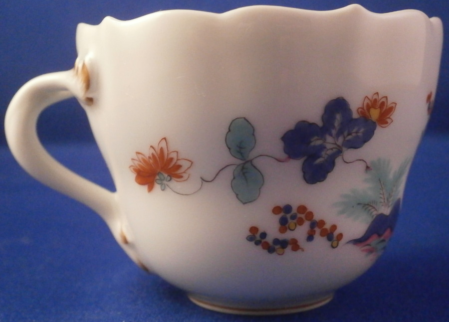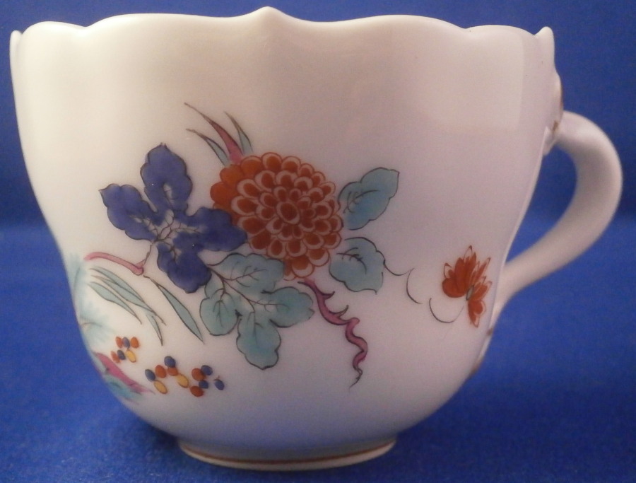 This is a mocha or espresso coffee demitasse cup and saucer made by Meissen in the 20th century. Both pieces are hand painted with a really superb Kakiemon style pattern that has all the typical colors and looks superb! I especially like the two bugs on the saucer! The design fills the surface of both pieces nicely and has a light brown trim just under the nicely shaped edge. Even a small extra flower to the bottom inside of the cup - a sure sign of quality! The handle of the cup is superb as well. Not a design one sees often as well and it really is stunning! This size cup is not easy to find and I like them better than regular sized pieces since they take up less room in the cabinet. The set is in perfect condition which never hurts either :) It is marked with the under glaze blue crossed swords mark underneath (first quality) as well as the usual impressed and painted marks one expects from pieces of this period as shown. The cup is just under 2 inches tall and 2.5 inches in diameter. The saucer is 1 inch tall and has a diameter of 4.25 inches. Please email me for more information or other pictures.