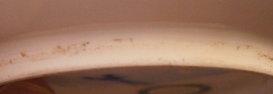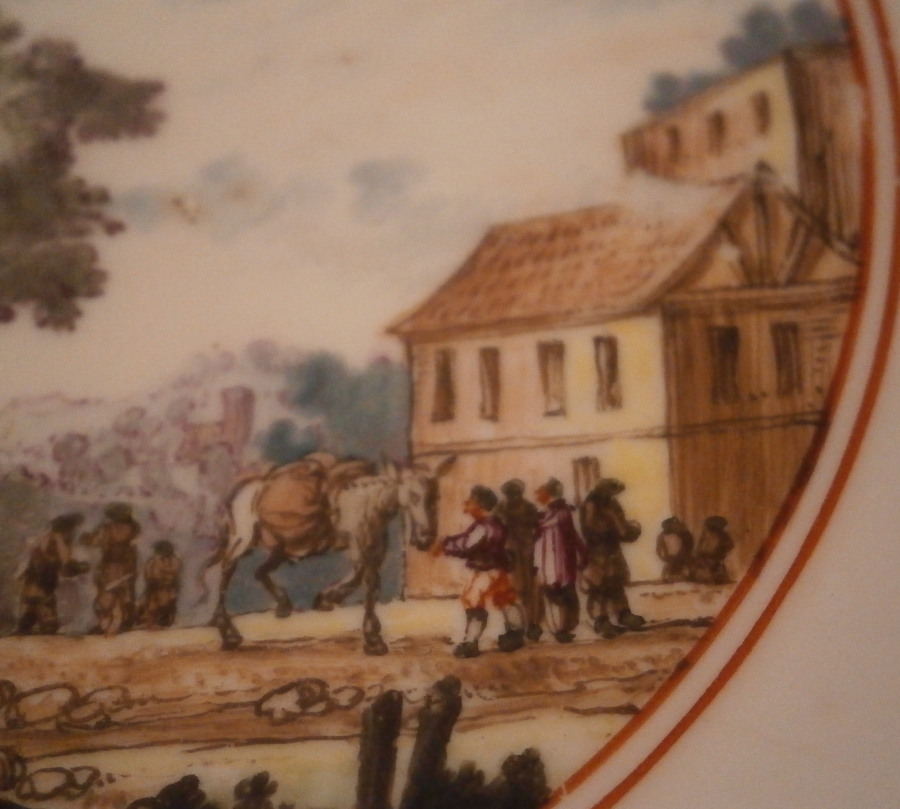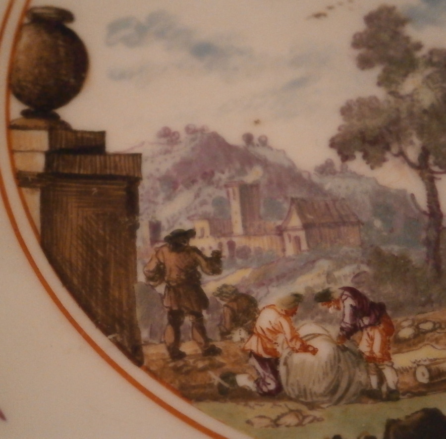 This is a really nice saucer made by Meissen in about 1735. A nice early type of design with the double red trim around a large central scene. The piece is superbly hand painted with the scene likely hand painted by Christian Friedrich Herold . One of the top early painters at the factory. The scene is in the harbor / merchant style and of a very good quality. It includes quite a few figures, buildings, a column with a vase on top to the side and even a horse in a landscape surrounding. The unusual part are the Kakiemon flowers all around the rim and even on the udneside. I cannot find another example that was done on white ground. All others I came across have a ground color of some sort. The edge had a gold trim to it as did the bottom outside foot ring. It all makes this a very nice saucer! The piece is in great condition with just a touch of wear but the gold trim to the edge and foot ring are almost entirely gone. Looks almost like it was done on purpose likely to make it match better with another piece with brown trim which is more common. The dish is 1.125 inches tall and 5.125 inches in diameter. It is marked underneath with a nice early version of the under glaze blue crossed swords mark as well as two impressed star Dreher's marks on the foot ring for Christian Meynert. Please email me for more information or other pictures.