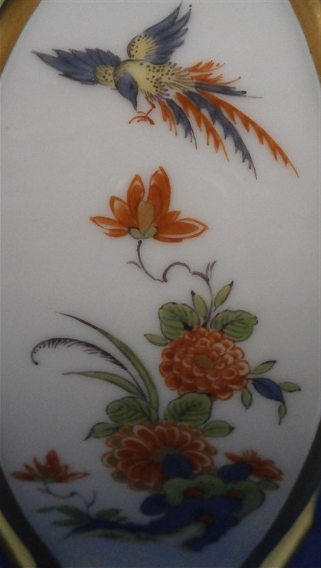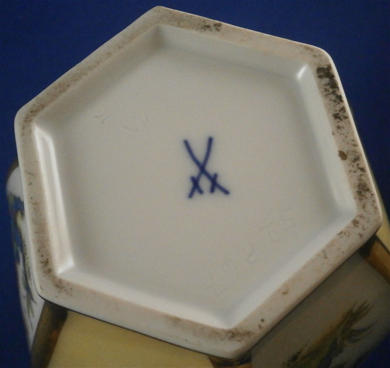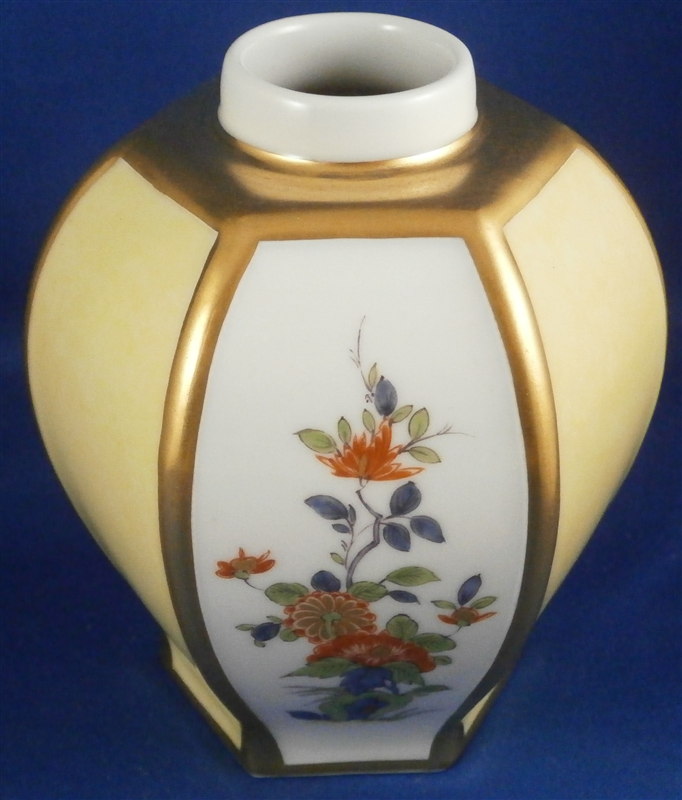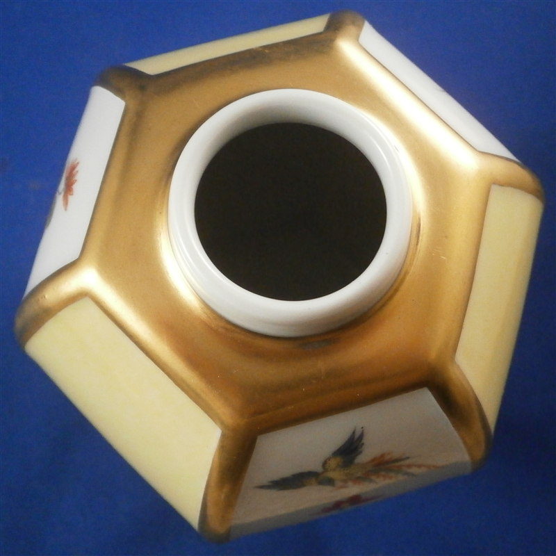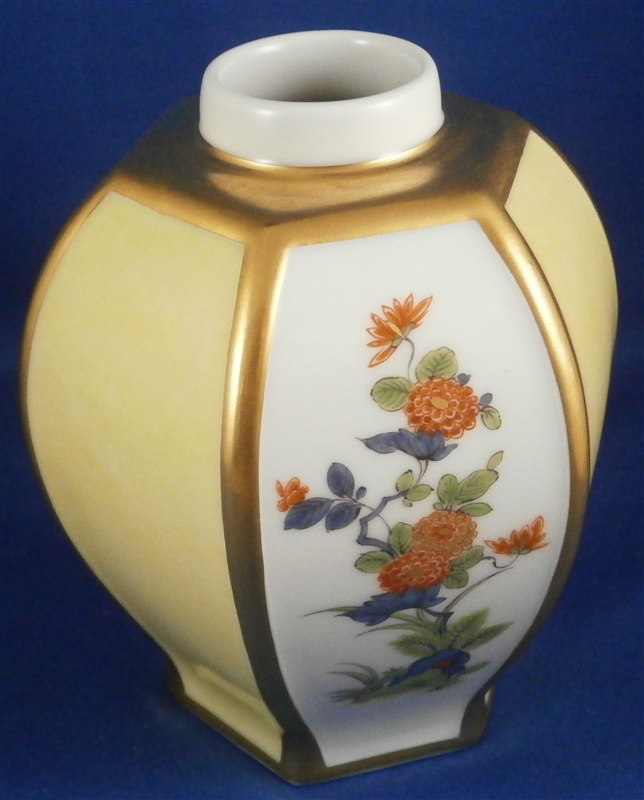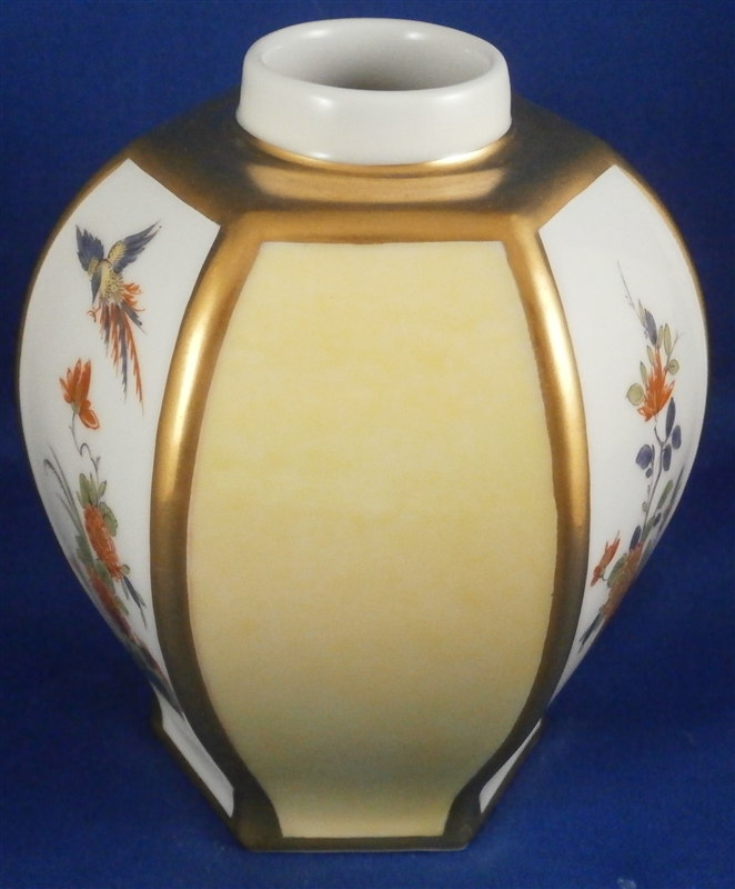 This is a superb octagonal tea caddy with its lid made by Meissen in the 20th century. It has a superb shape to it and is painted in the Kakiemon style with flowers on white ground and one scene includes a phoenix bird with the alternating panels having a nice yellow ground color to them and gold trim to outline all the panels. The lid has the yellow ground on top and the side is white with a relief ring design to it and a gold ring in the center. The piece is based on an 18th century original off course! The teacaddy is in perfect condition which is great! It is about 4.75 inches tall and has a diameter of 3.75 inches. The jar is marked underneath with the underglaze blue crossed swords as well as the usual impressed numbers as shown. Please email me for more information or other pictures.