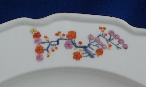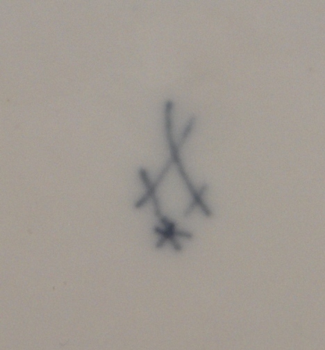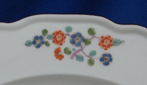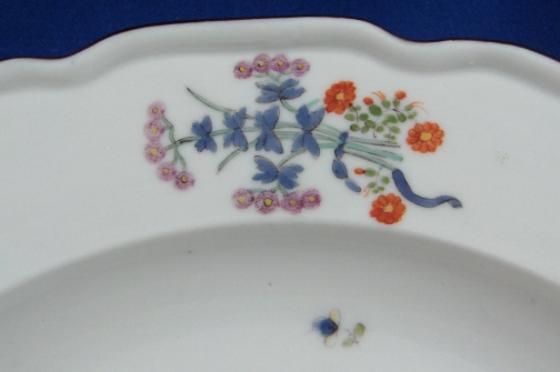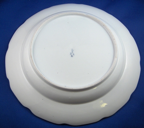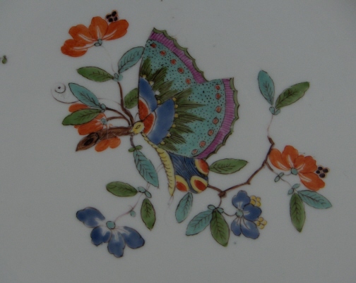 This is a porcelain plate made by Meissen and even though this is the Marcolini mark I suspect it was made much earlier as this mark was occasionally used in the early 18th century as well! The colors and the paste fit that much better. It is handpainted with one of the early Kakiemon designs this being the Chinese Butterfly motif. Also some nice Kakiemon type flowers on the rim and a brown trim to the edge. This plate is in great condition with almost no wear. It does have a small chip to the footring and some manufacturing imperfections in terms of a bumpy paste some of which was ground down before painting. The plate is 1.375 inches tall and 9.375 inches in diameter. Marked underneath with the underglaze blue crossed swords as well as an impressed number 17. Also a small blue line on the footring. Please email me for more information or other pictures.