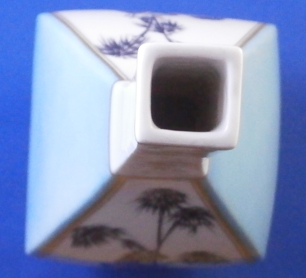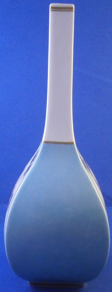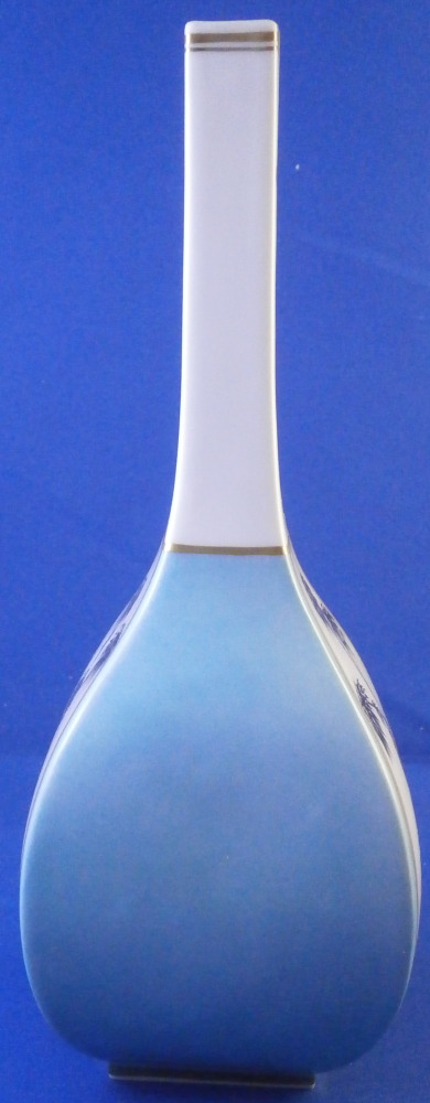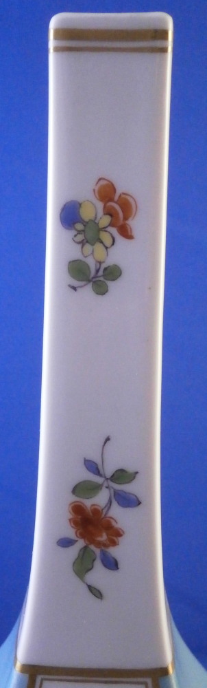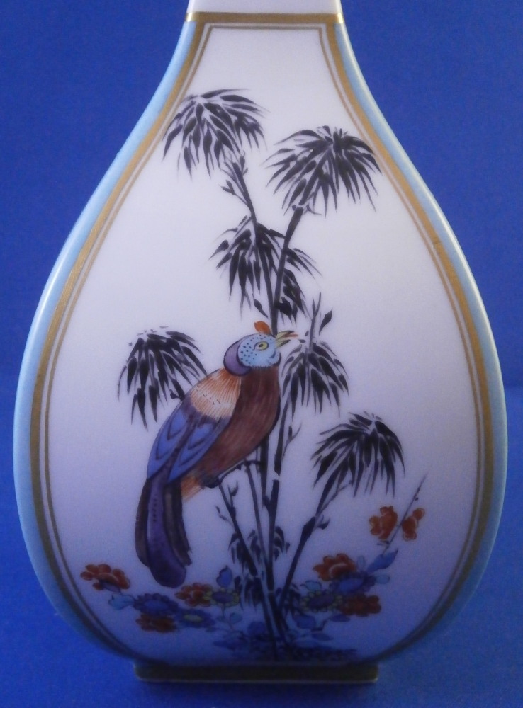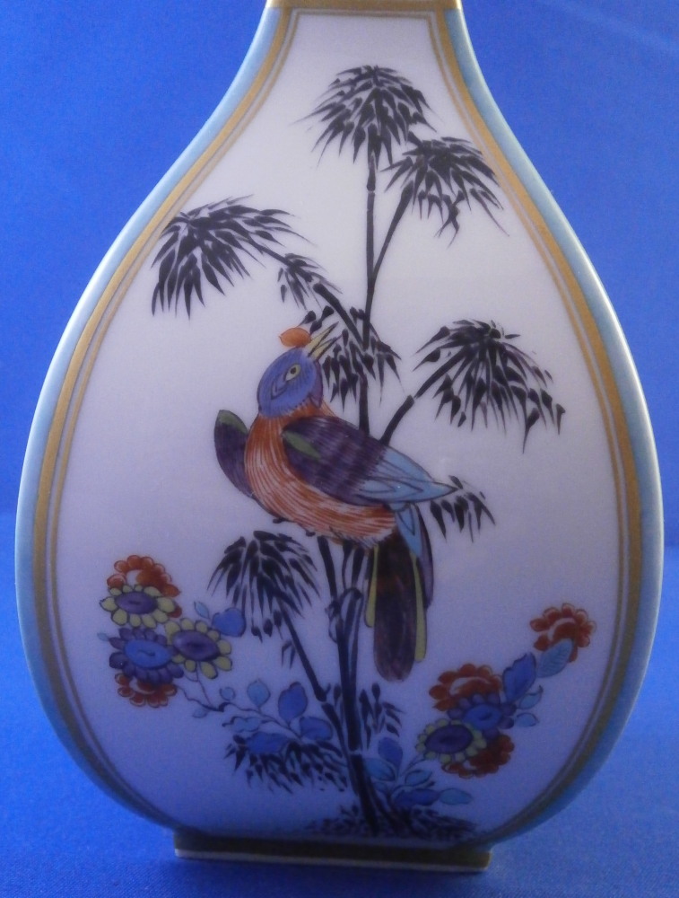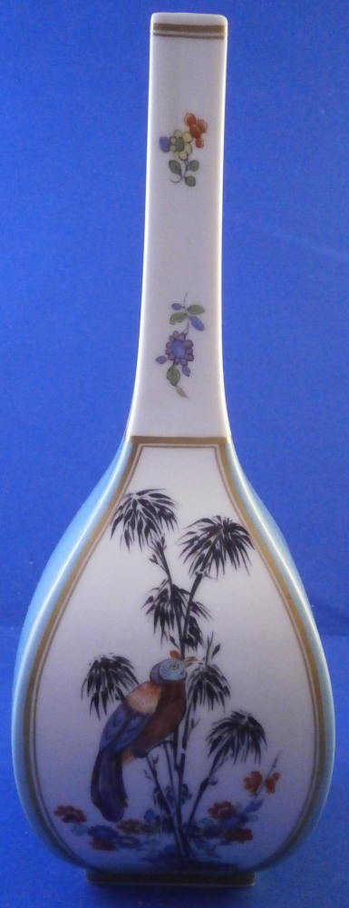 This is a superb flask / bottle / vase made by Meissen in the 20th century. While it could be used perfectly as a vase I believe this was originally a Sake bottle meant for the Japanese market. Sake is an interesting drink that is neither beer nor wine but in a category all by itself and thus unique. I quite enjoy it once in a blue moon :) The piece has a really ncie shape to it and is hand painted with a superb Kakiemon design to the front and back including a bird in what looks to be bamboo with some typical and colorful Kakiemon flowers around the bottom. Two small Kakiemon flowers along the thin neck of the vase and a bit of gold trim. What really makes it look stunning is the the two sides instead of being white have a nice turquoise ground color to it that makes this whole piece look amazing! One does not find these often at all! The bottle is in great condition with a tiny bit of wear and it would ahve had a little lid to it which is missing. It is marked with the under glaze blue crossed swords mark (first choice) underneath as well as a blue line and the usual impressed numbers as shown. The flask is 8.25 inches tall and 3 inches wide and deep. Please email me for more information or other pictures.