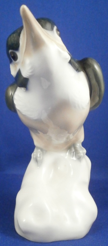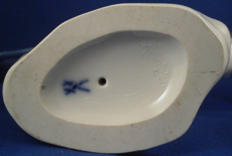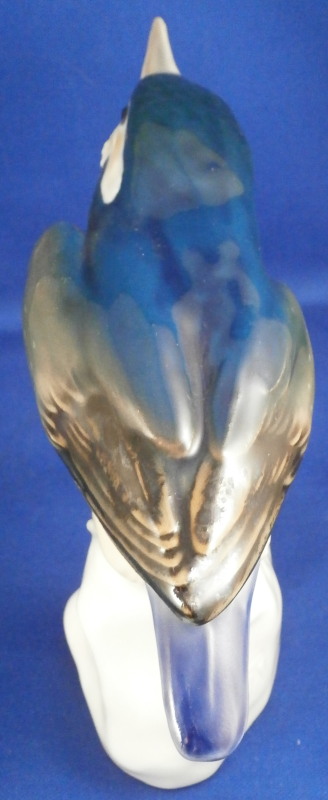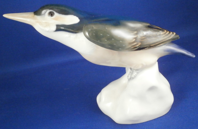 This is a superb figurine of a King Fisher bird made by Meissen during the 20th century. First modeled around 1910 by Paul Walther and hand painted with their famous under glaze colors or Scharffeuerfarben that used higher temperatures than traditional over glaze colors. I love them and they look more natural to me. The colorful bird is sitting on a nice white base which gives it a great contrast. The artist initials are impressed in the back of the base. The figure is in perfect condition with a tiny black firing spot under his butt on the base and some extra porcelain "pimples" at the tip of the beak which is why it is likely denoted as a second choice piece. No restorations and he displays perfectly. The beak is so often repaired on these pieces that it is nice to see one that is in good shape! The piece is marked underneath with the under glaze blue crossed swords mark with two lines cut across it as well as the usual impressed marks as shown. The figurine is 4.375 inches tall, 1.875 inches wide and 5.75 inches long. Please email me for more information or other pictures.
