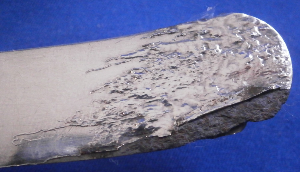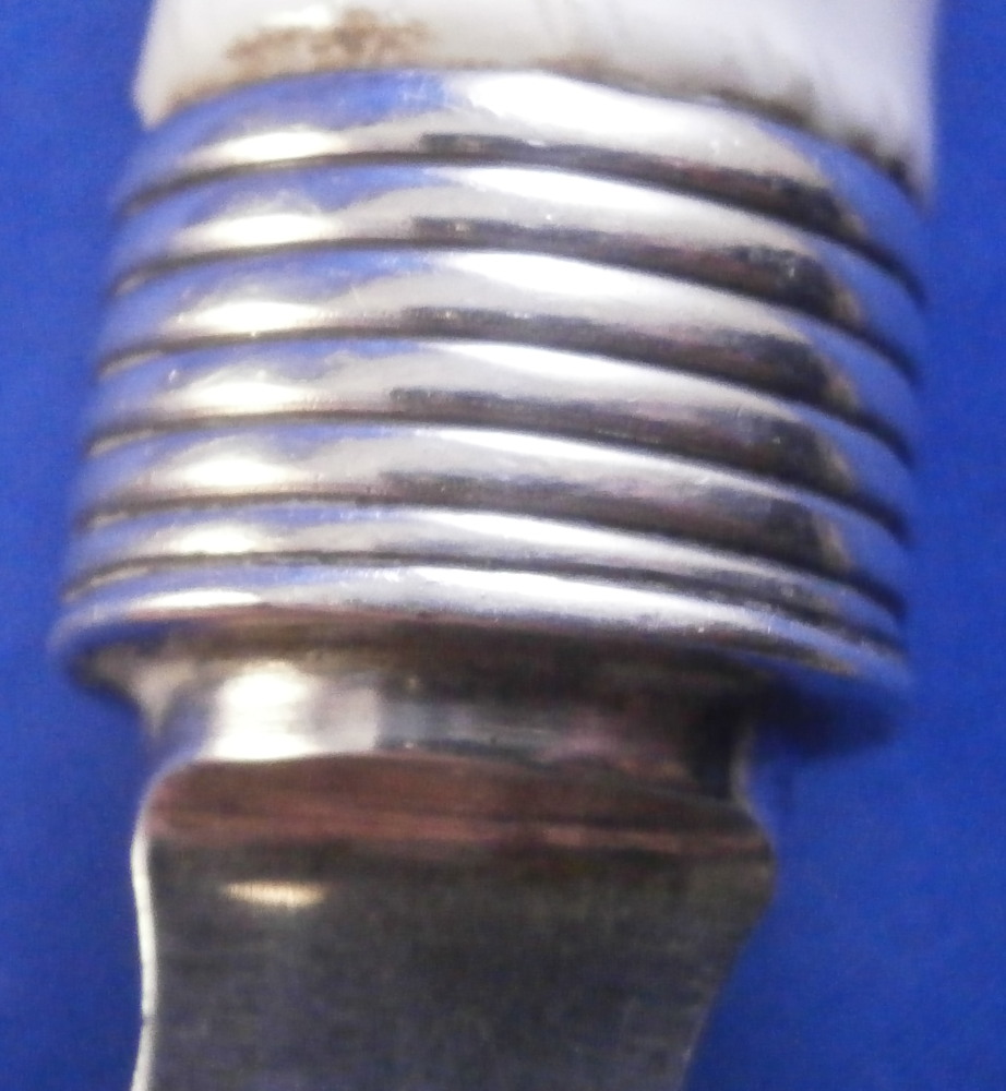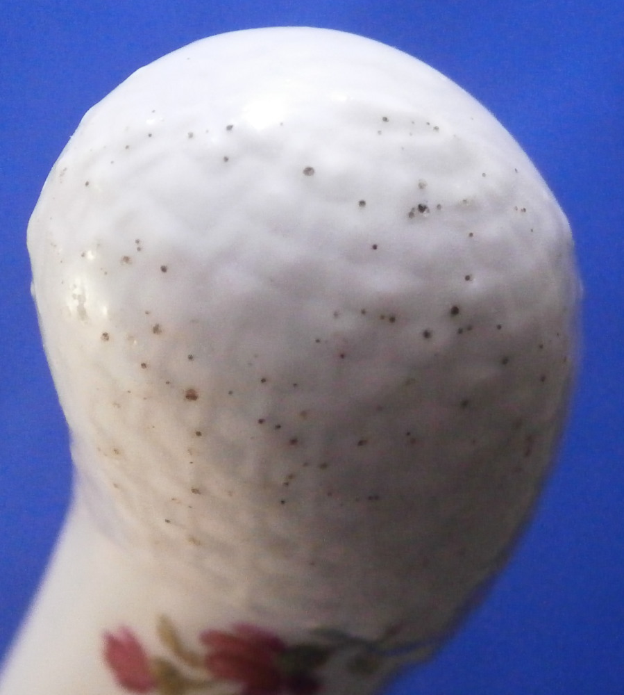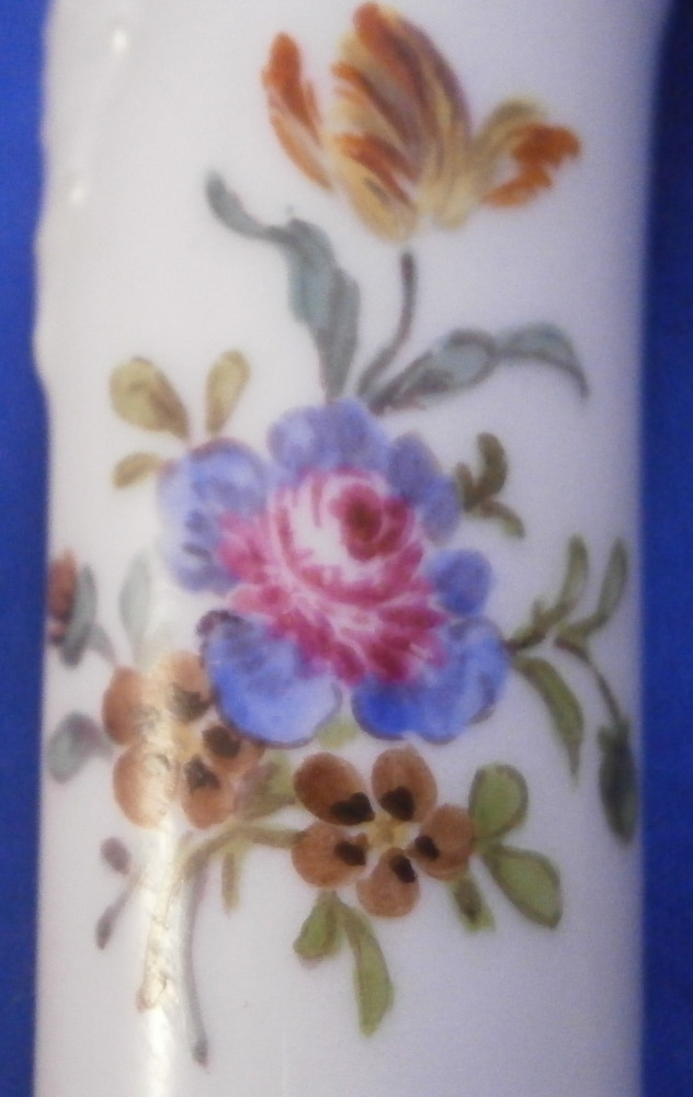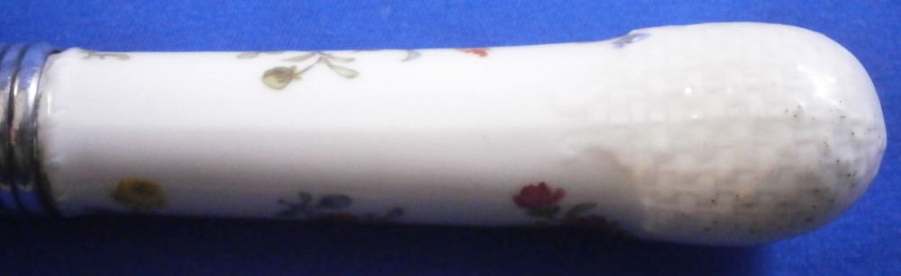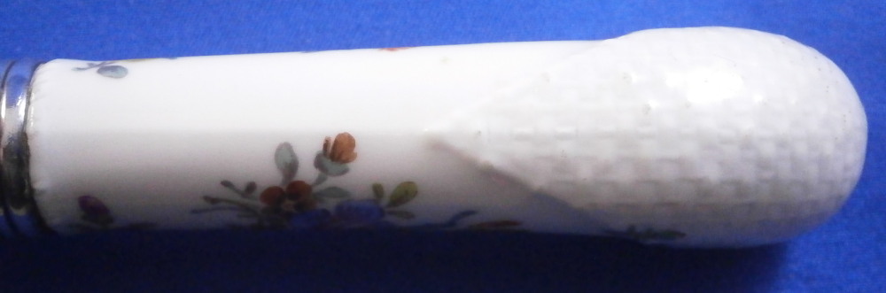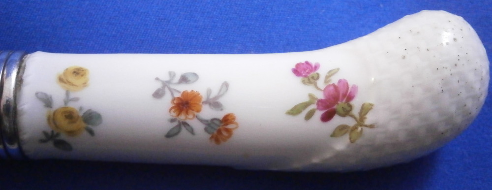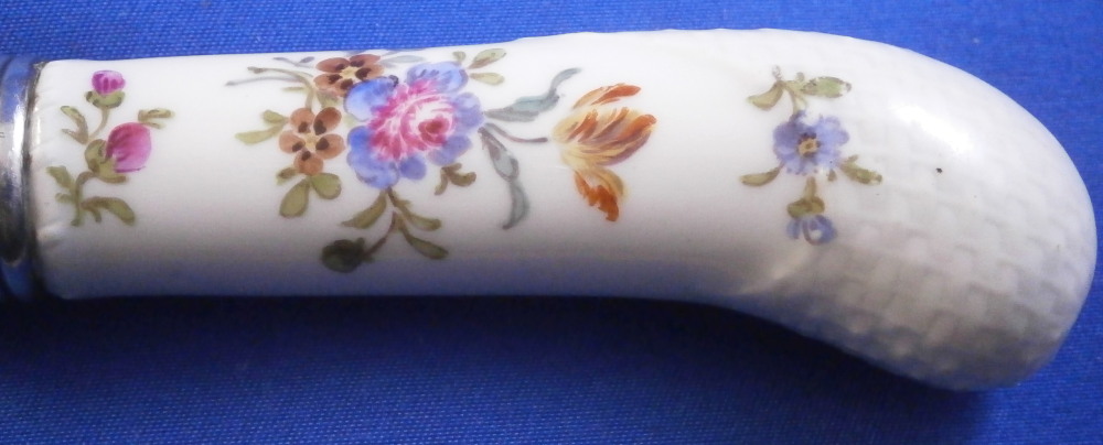 This is a porcelain handled knife made by Meissen in the mid to late 19th century. The porcelain handle is hand painted with a very nice floral arrangement as well as two single flowers to one side, three single flowers to the other side and a basketeave design to the paste on the end part. The piece is not marked but that is normal as the mark would be where the ferrule is placed if there even is a mark. The blade of the knife is all buggered up at the tip - it looks like the inside part was just regular iron which rusted/oxidized and looks rather nasty. Not sure if someone coated the iron after the fact in chrome or whatever this is or if it was a design flaw but it is what it is. Age does that to most things including us. Getting old is not all that fun. The piece is about 7.875 inches long with the visible porcelain being about 2.875 inches long. Please email me for more information or other pictures.