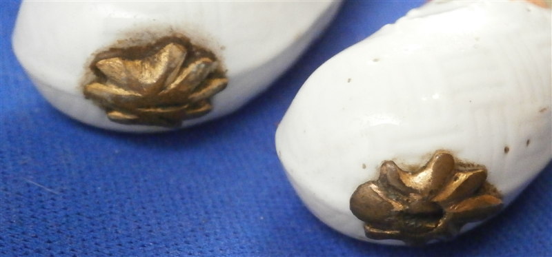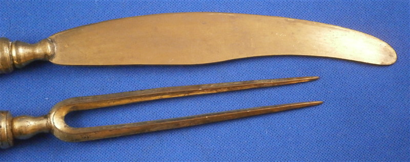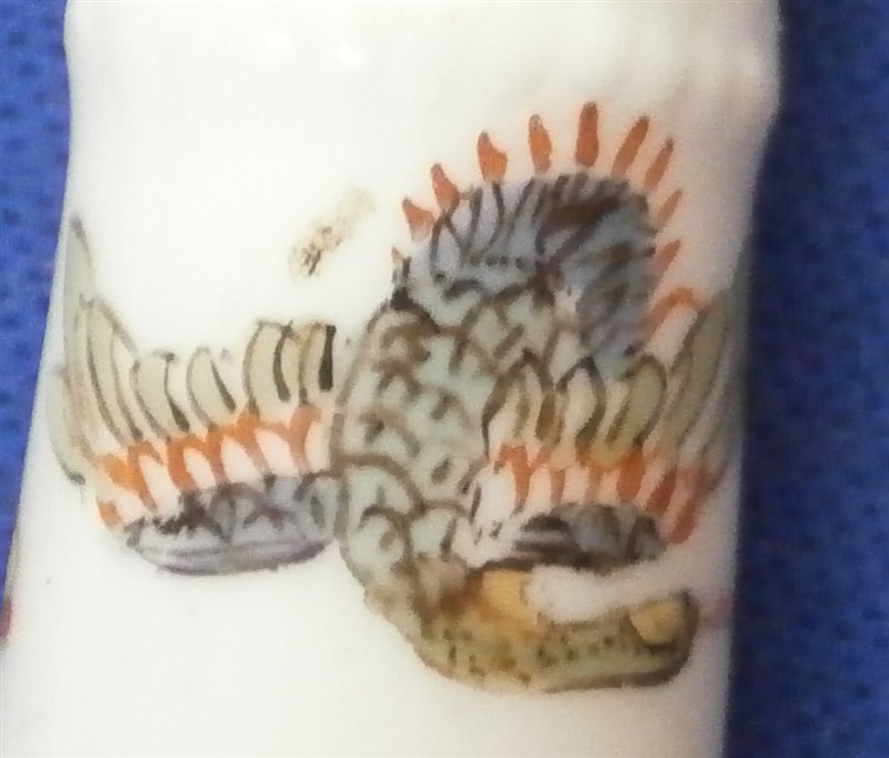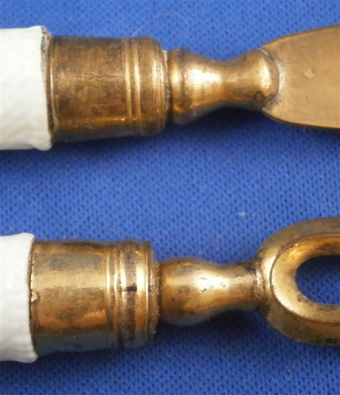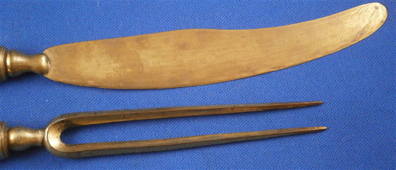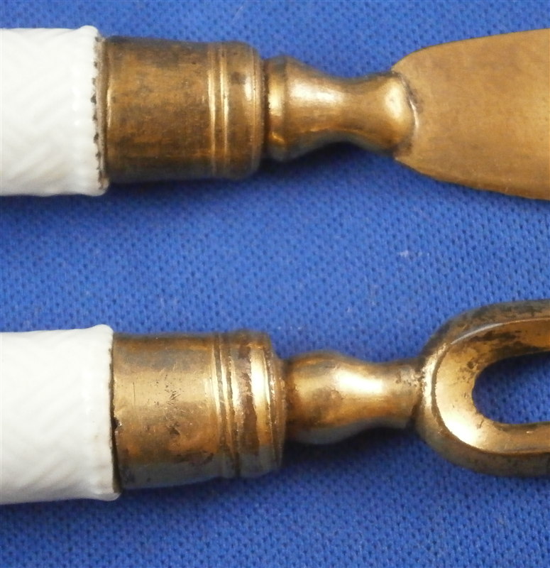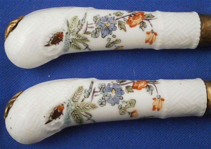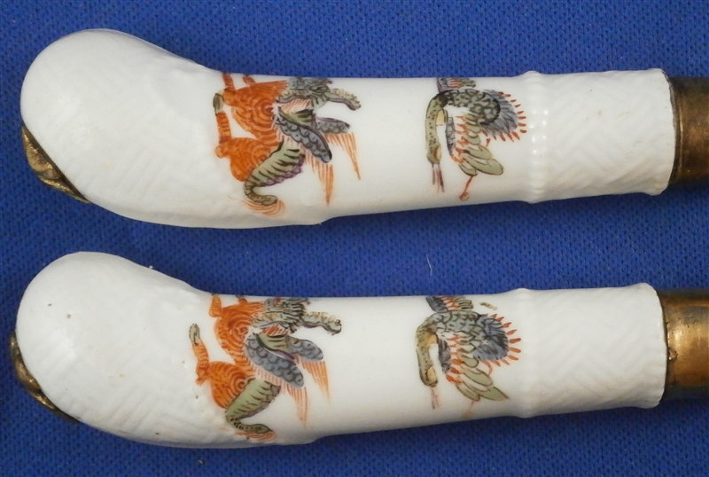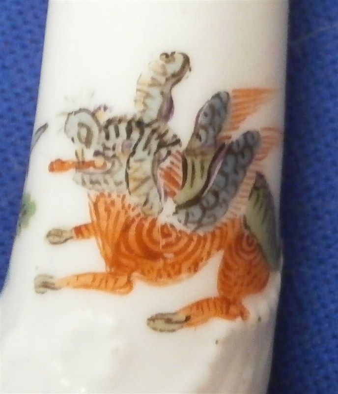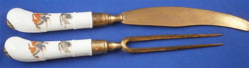 This is a real treat - a rare knife and fork set made by Meissen in about 1735. The handles are nicely shaped in the pistol grip style and are modeled with a relief pattern to both ends but the best part is the hand painted Kakiemon design called the Korean Lion aka Koreanischer Löwe aka Ch'i-lin pattern. This cutlery / flatware is likely from the royal Saxon court since they order a couple of hundred of these handles for their use and with the gilded bronze hardware this would have been the best of the best. It is nice to have a proper set and for both to have their original mounts and in perfect condition (except for some wear to the gilding) is almost unheard of these days. The fork is 7.25 inches long of which 2.75 inches is the length of the visible porcelain handle. The knife is 8.375 inches long of which 2.75 inches is the visible porcelain handle. The porcelain is not marked or shall we say visibly marked since it would be hidden by the ferrule which is normal but it is definitely made by Meissen during this period. Please email me for more information or other pictures.