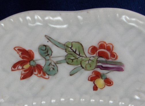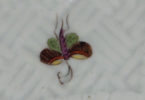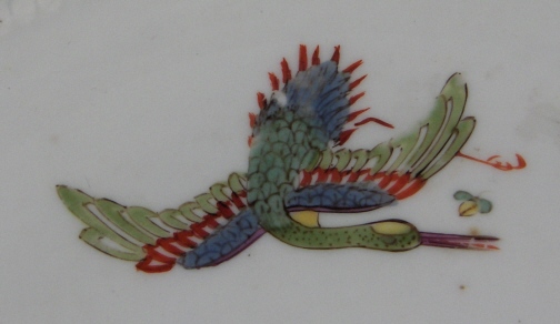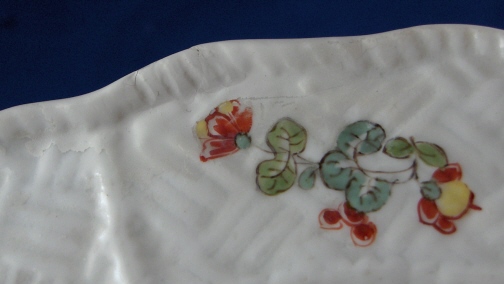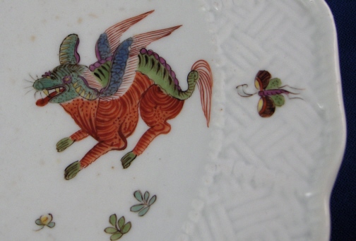 This is an early 18th century Meissen dish dating to about 1735. It is handpainted with one of thenicest of the Kakiemon designs called the Korean Lion pattern based on the Kakiemon designs from Japan. It includes what is called the lion, a crane, a may bug indian flowers and bugs. Nice cross hatch type rim decor called the Sulkowski Ozier design in relief. The plate is 1.125 inches tall and 9.125 inches in diameter. It is marked underneath with the early Meissen blue crossed swords underglaze with the hilts being made up of big dots as well as an impressed E on the footring. The dish is in great condition for the age with very little wear but there is a flat rim chip which was repaired or reglued and badly overpainted (one of those overkill jobs typical of older restorations) some of which is coming off again. It would be an easy as well as cheap fix these days. The Kakiemon colors of these early plates is amazing! Please email me for more information or other pictures.