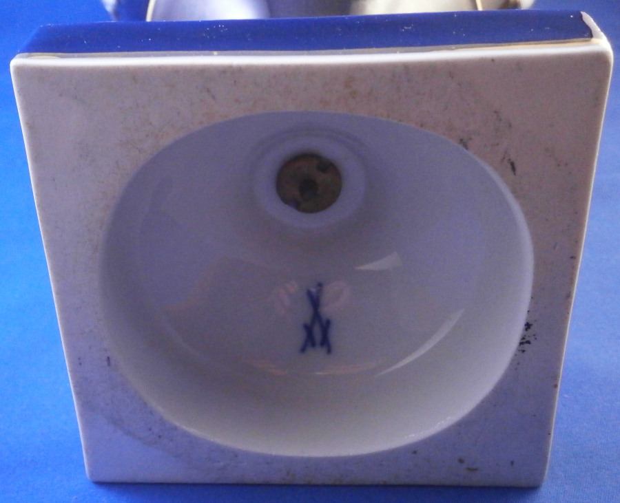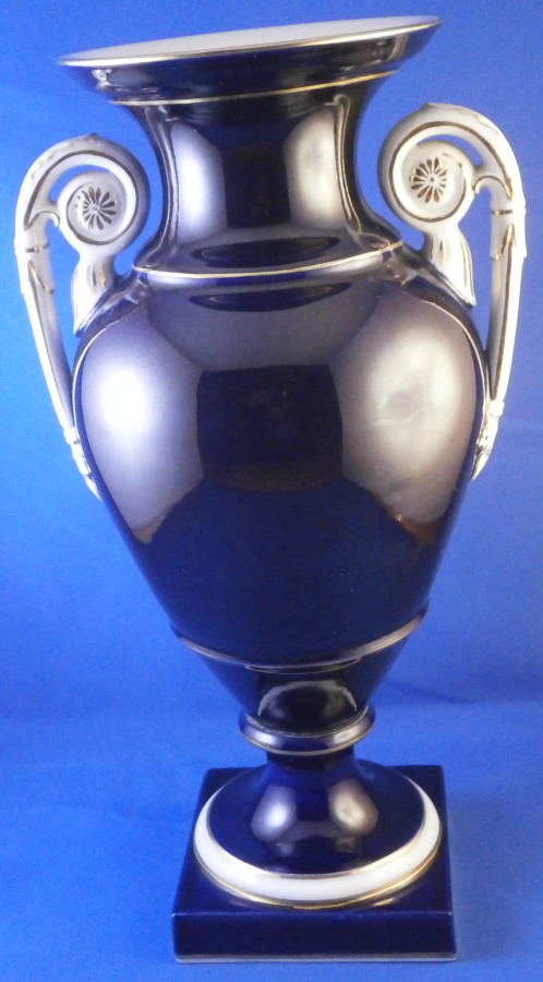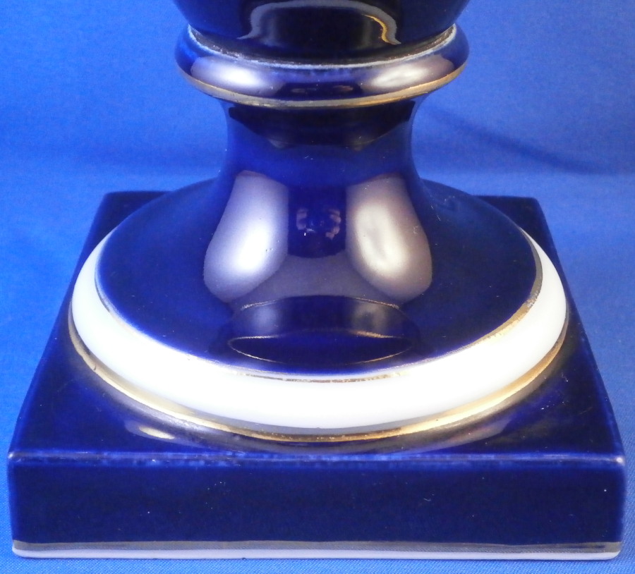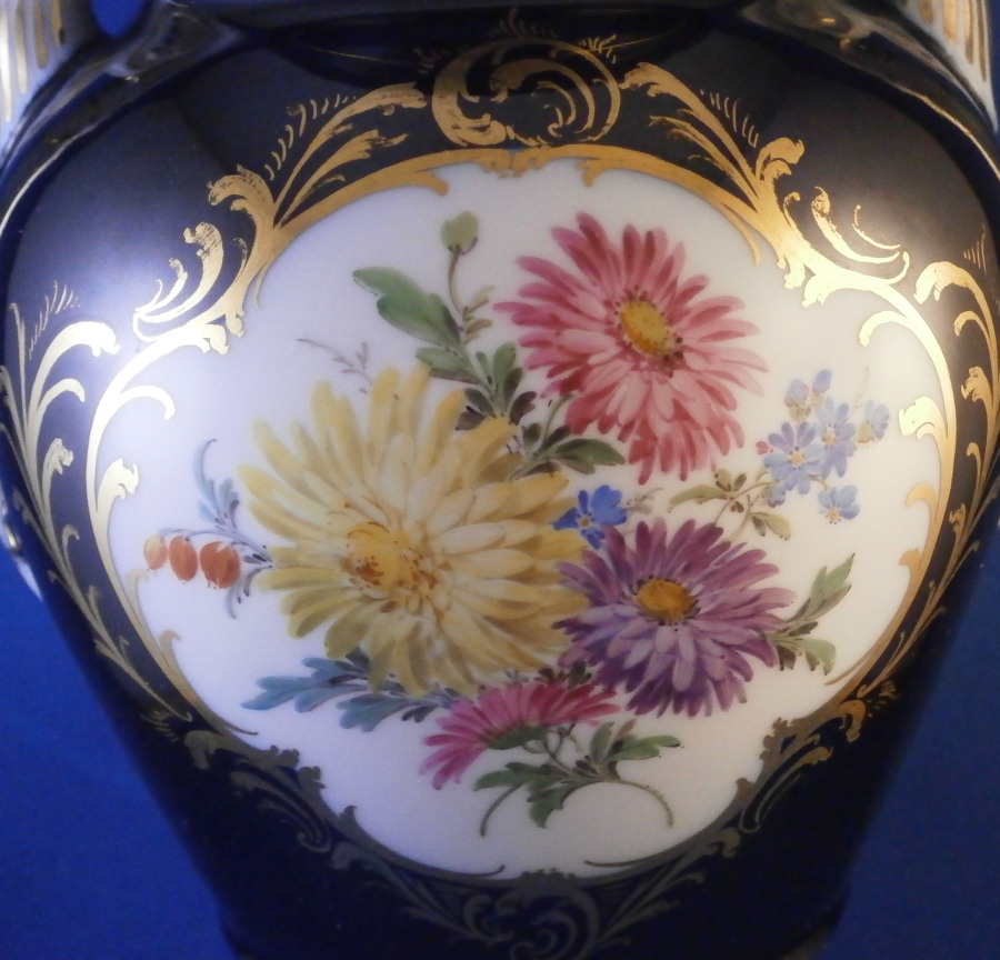 This is a really nice amphora shaped vase made by Meissen in the mid 20th century. A very popular design with the nice handles on either side but what makes it a bit more special is the fact that this piece here is much larger than most one sees. It is hard to find the cobalt blue ground version like this with the gilding in great condition! The vase has a large hand painted floral arrangement on white ground in the front surrounded by fancy gilding with the main areas having that rich dark cobalt blue ground color to it. It has a white lines around the round part of the foot with a gild line to either side, gold trim to the top and bottom edge and some nice gilding to the white handles. The vase is in great condition with just a very minor touch of wear to the gilding. The piece comes in two pieces that are connected with a screw which is normal. The vase is marked underneath with the under glaze blue crossed swords as well as some other marks as shown. First choice off course. It is is 11.625 inches tall, 6.25 inches from handle to handle and 5.25 inches in diameter in the center. Please email me for more information or other pictures.