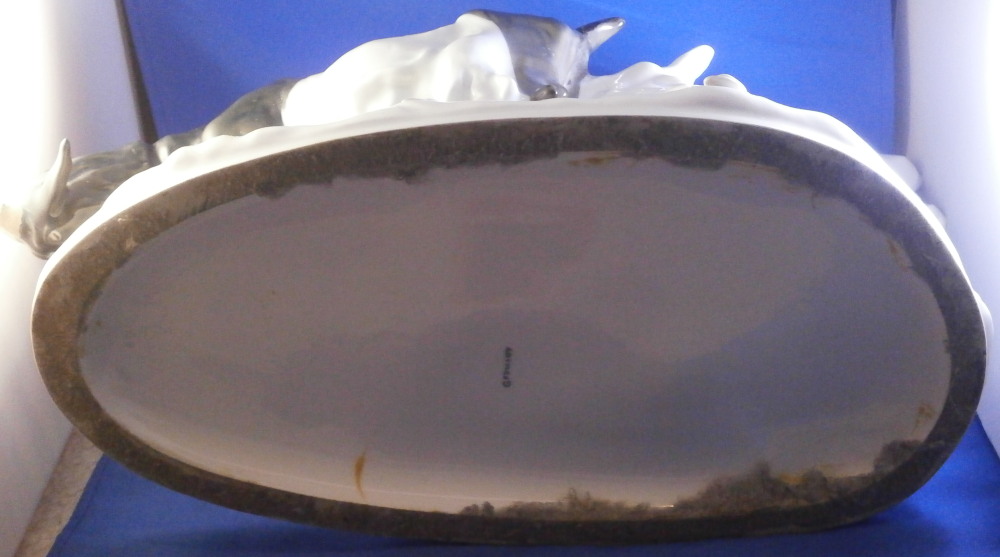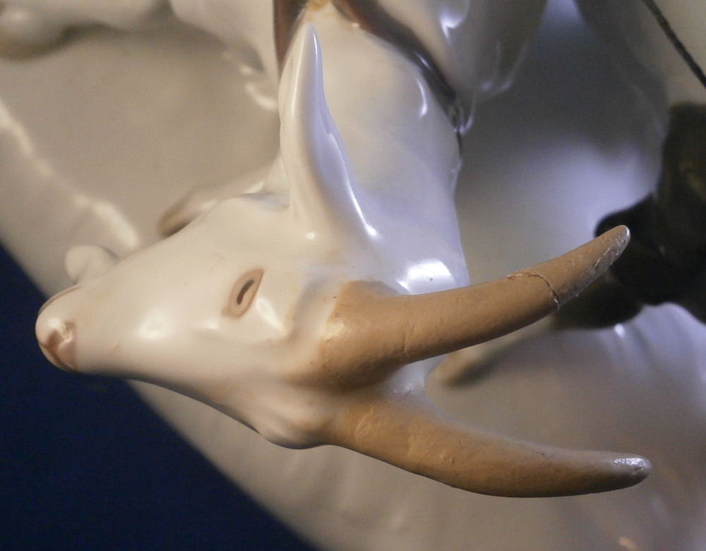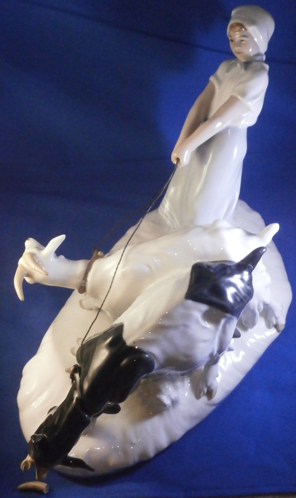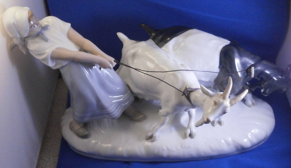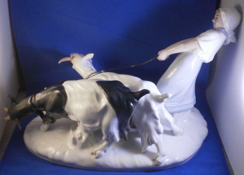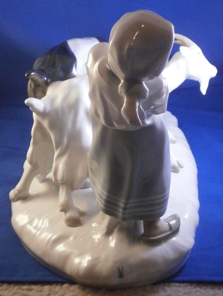 This is very large figurine made by Meissen in the earlier 20th century. First modeled by Otto Pilz in 1906 I believe. A nicely modeled figure in the Art Nouveau / Jugendstil taste hand painted in the under glaze colors of that period. It is of a goat herder lady tending to two of her goats. A white goat and a black and white one. The young lady is wearing a simple blue skirt with a white top, a blue scarf and white head cover. She is holding a metal wir line in her hands - one going to each goat. Oval base with a relief grass design to it. The figurine is in fairly typical condition for this model. All the horns of the goats are eithe gone or have been restored. One has re broken off and I have that. One ear on the white goat is missing and the tail of the black and white goat has been glued back on. A small chip to the bottom base edge as shown. Nothing a good restorer cannot fix and it is a great figurine to bring back to perfection! The piece is 9.625 inches tall, 14 inches long and 7.5 inches deep. It is marked with the under glaze blue crossed swords mark (first choice) on the back of the base where the lady is standing and with the impressed / incised numbers and letters underneath as shown. Germany underneath the base as well showing it to be a nice early example. Please email me for more information or other pictures.
