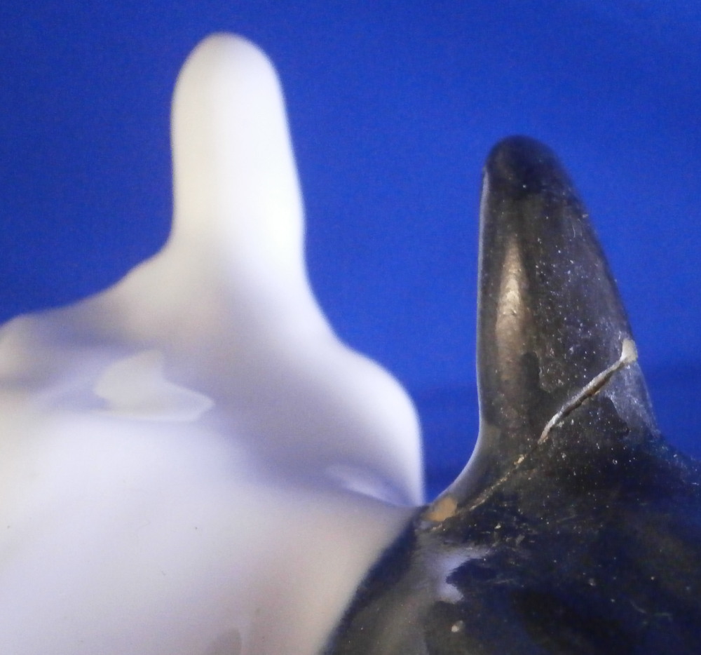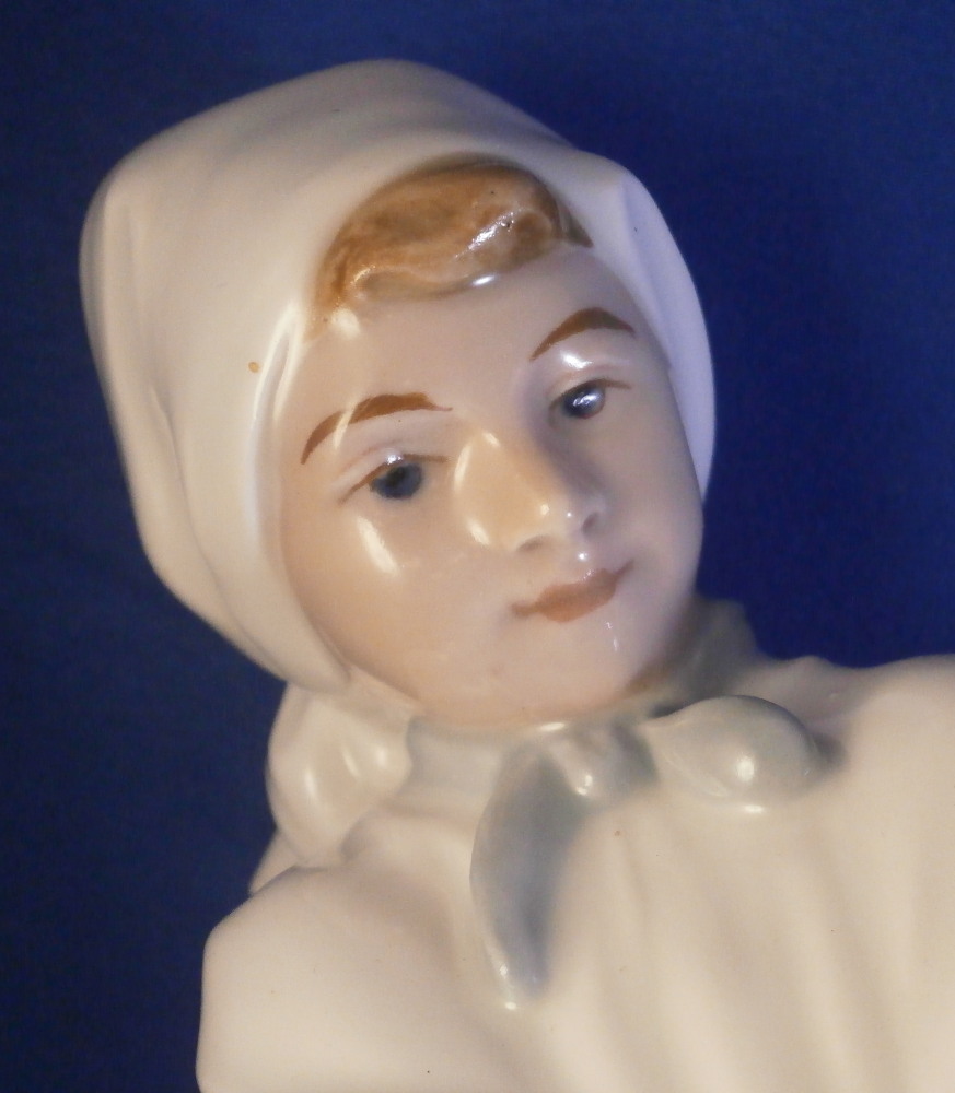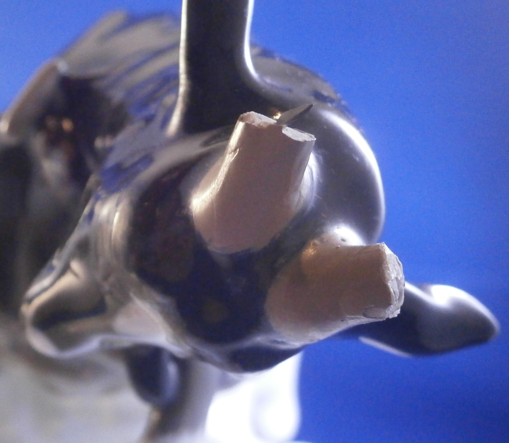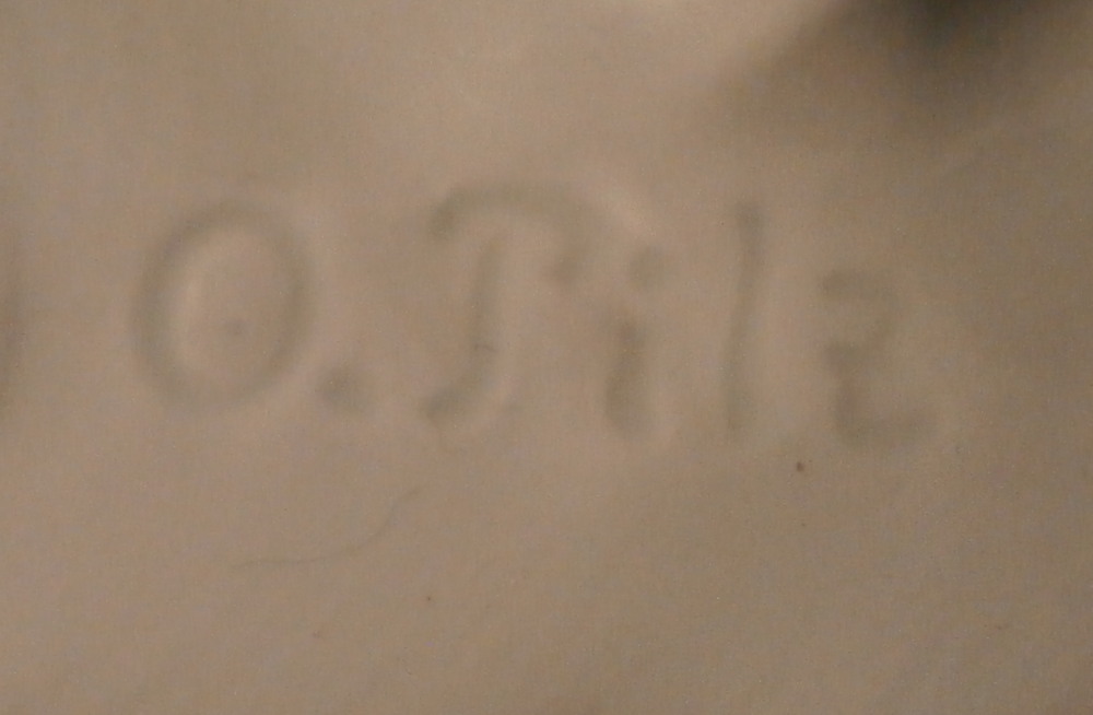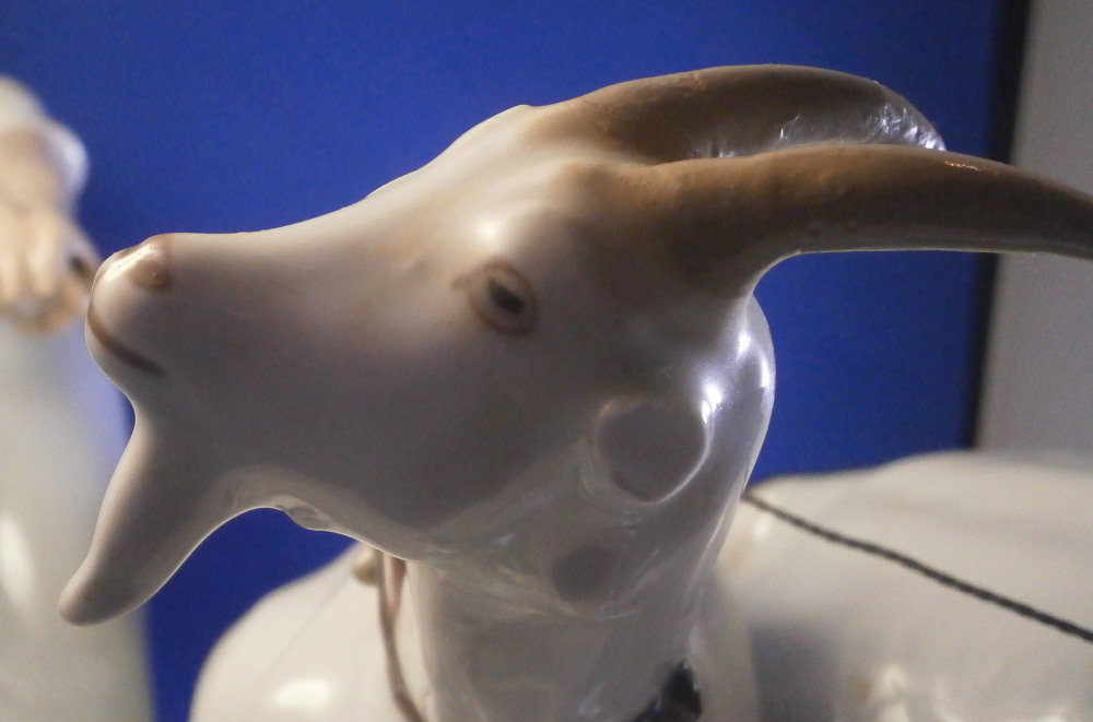 This is very large figurine made by Meissen in the earlier 20th century. First modeled by Otto Pilz in 1906 I believe. A nicely modeled figure in the Art Nouveau / Jugendstil taste hand painted in the under glaze colors of that period. It is of a goat herder lady tending to two of her goats. A white goat and a black and white one. The young lady is wearing a simple blue skirt with a white top, a blue scarf and white head cover. She is holding a metal wir line in her hands - one going to each goat. Oval base with a relief grass design to it. The figurine is in fairly typical condition for this model. All the horns of the goats are eithe gone or have been restored. One has re broken off and I have that. One ear on the white goat is missing and the tail of the black and white goat has been glued back on. A small chip to the bottom base edge as shown. Nothing a good restorer cannot fix and it is a great figurine to bring back to perfection! The piece is 9.625 inches tall, 14 inches long and 7.5 inches deep. It is marked with the under glaze blue crossed swords mark (first choice) on the back of the base where the lady is standing and with the impressed / incised numbers and letters underneath as shown. Germany underneath the base as well showing it to be a nice early example. Please email me for more information or other pictures.