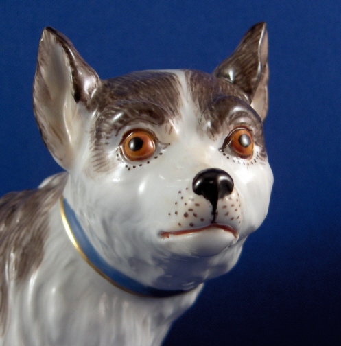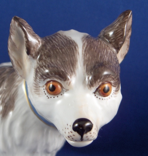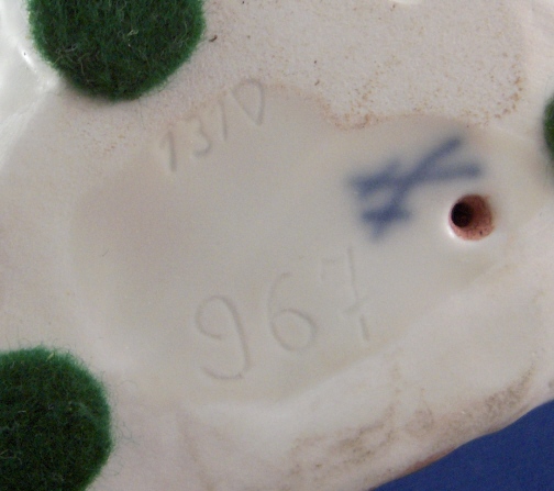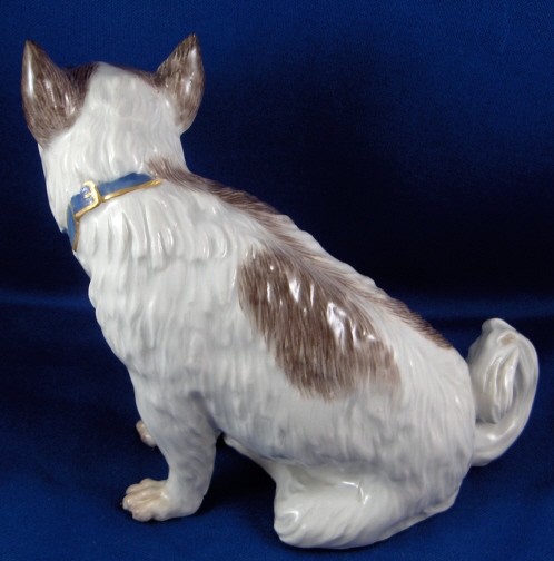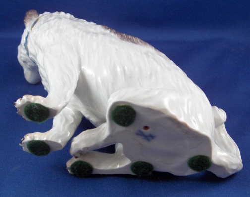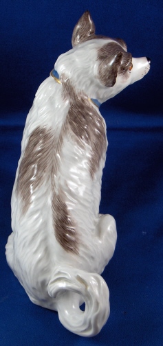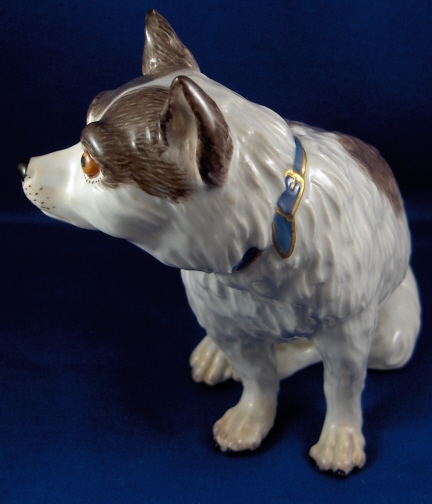 This is a figurine of a dog made by Meissen around 1950. I do believe he is a sheep herding dog but I don't know the exact name of the breed. He is however very well modeled as if ready to go about its duties :) Nicely handpainted and wearing a blue and gold collar. The figurine is in perfect condition. The piece is marked with the blue swords underneath, the impressed number 131 with an upside down tear drop shaped mark behind it and the incised model number 967. The dog is 4.875 inches tall, 6 inches long and 3.5 inches wide. Please email me for more information or other pictures.