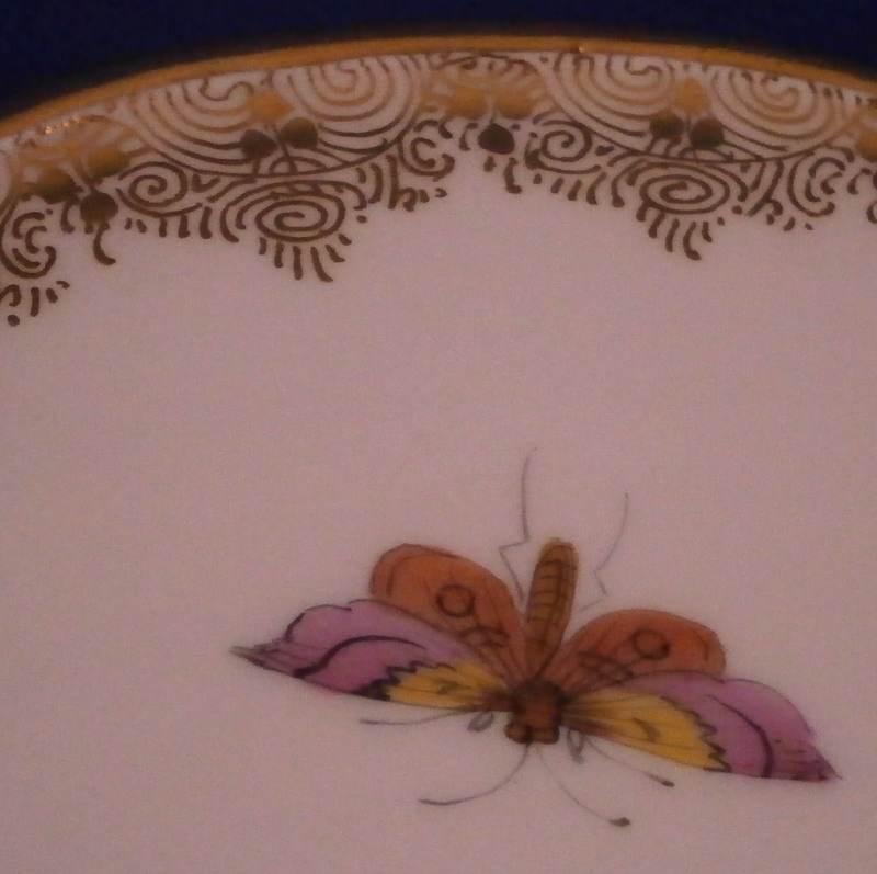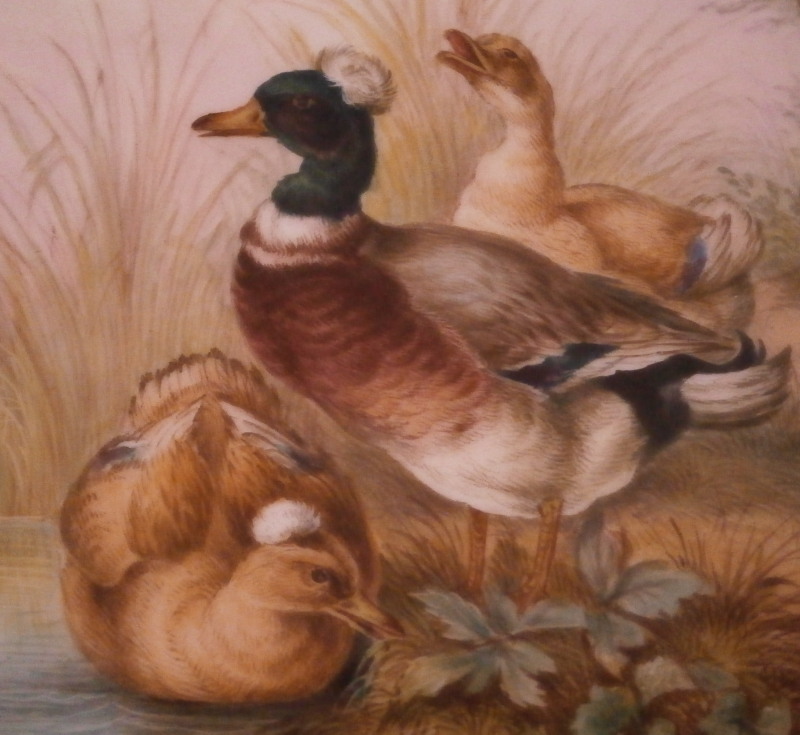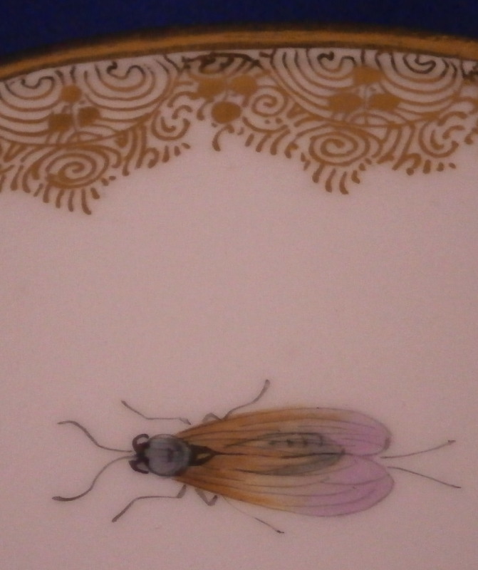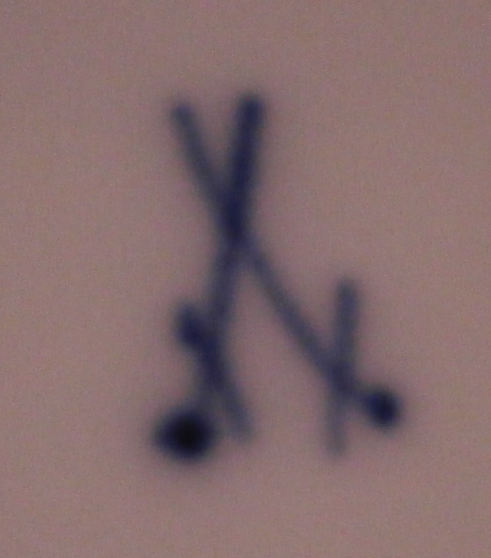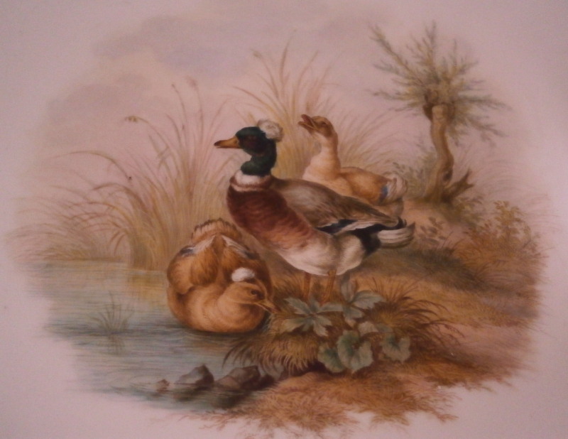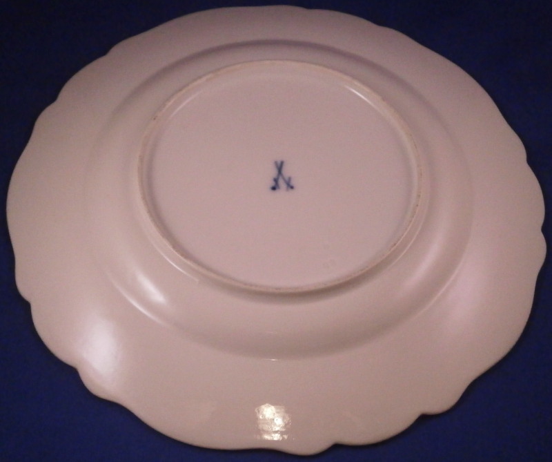 This is a superb dinner plate made by Meissen in the mid to late 19th century. It is hand painted with a fun duck scene in the center including a mallard type duck and two female ducks in a landscape surrounding. The rim has some cute bugs painted on it as well as one of their nicer fancy gold trims. That gold trim is more common on cobalt ground pieces they made. The edge is a bit wavy rather than just plain round which adds some elegance to the piece. The plate is marked with the underglaze blue crossed swords mark underneath as well as the usual impressed numbers as shown. It is about 1.125 inches tall and 10.25 inches in diameter. It is in perfect condition. Please email me for more information or other pictures.
