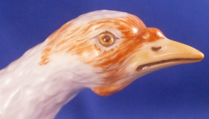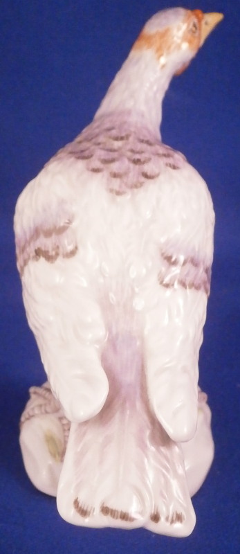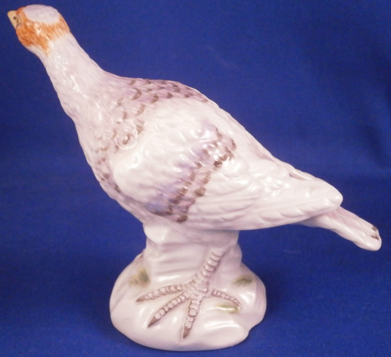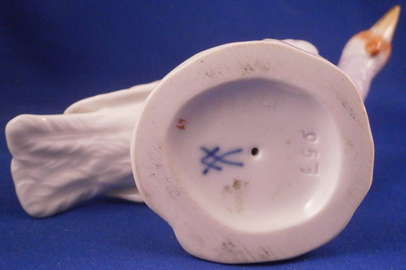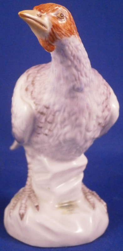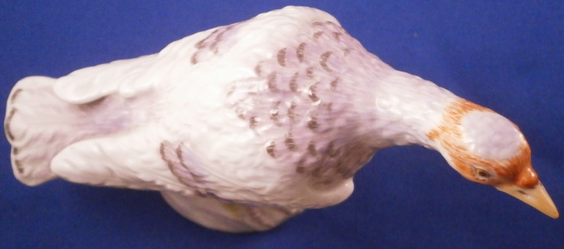 This is the rare larger version of a female turkey (aka hen ) figurine made by Meissen in the 20th century. I ahve the matching male to make a very ahrd to find perfect pair if anyone is interested in that! Nicely modeled and hand painted as one would expect from the top maker! The figure is standing on a little base painted with some grasses. The piece is hand painted painted so it can be sitting in the middle of the Thanksgiving table and look great from all angles! The piece is in perfect condition. The figure is marked underneath with the under glaze blue crossed swords mark as well as the usual impressed numbers and a painter's mark as shown. The bird is 3.375 inches tall, 1.75 inches wide and 4 inches long. Please email me for more information or other pictures.