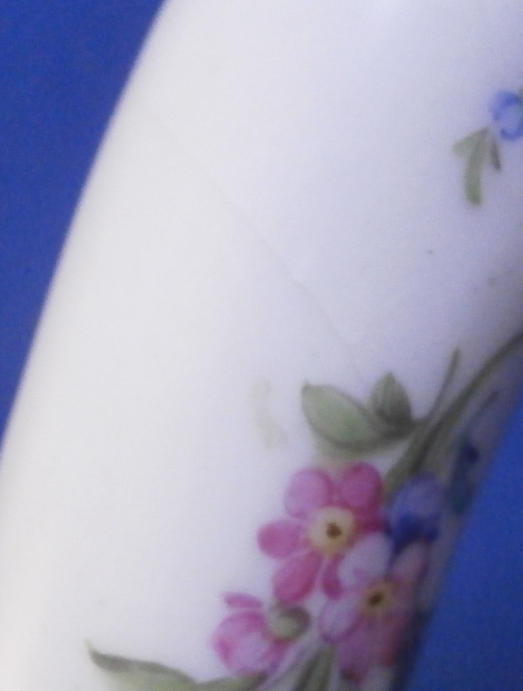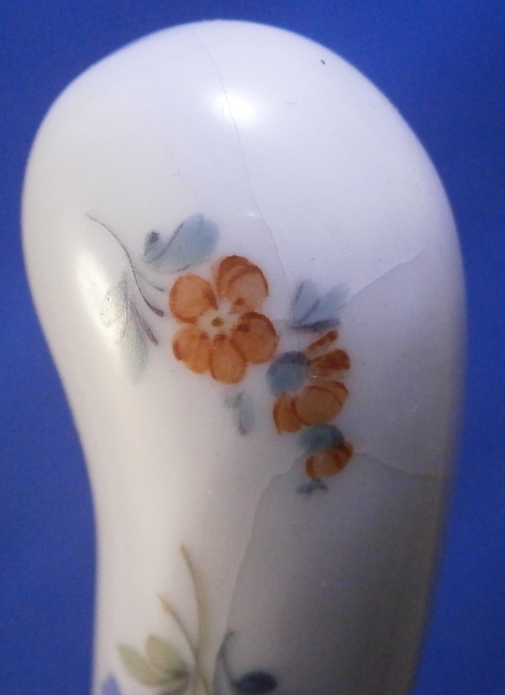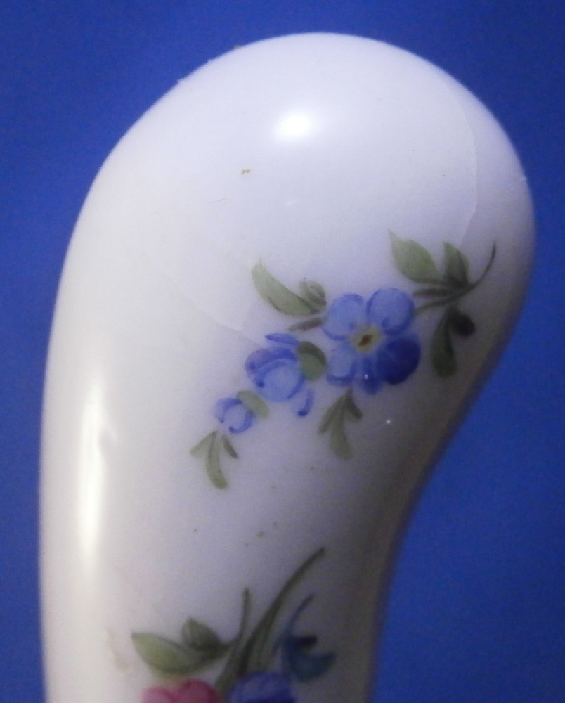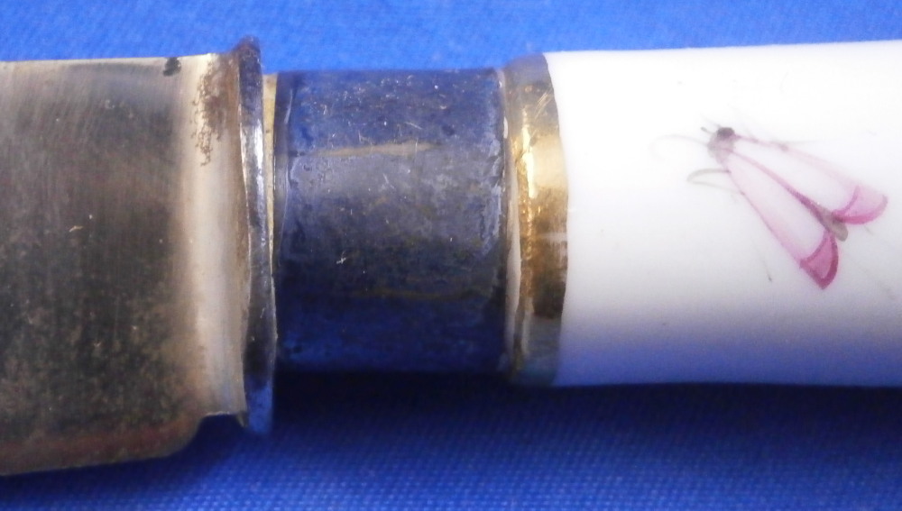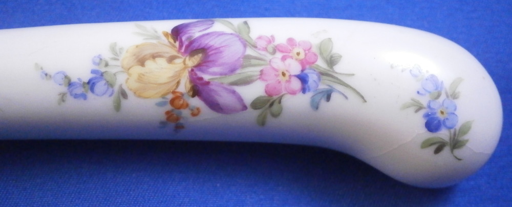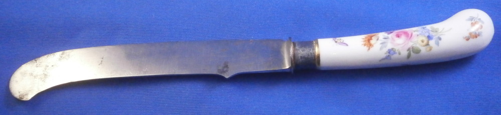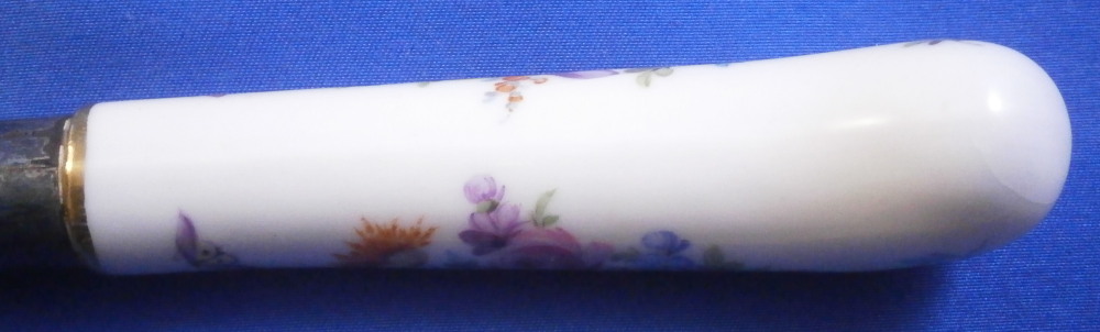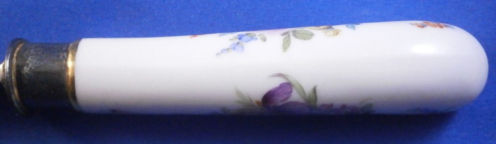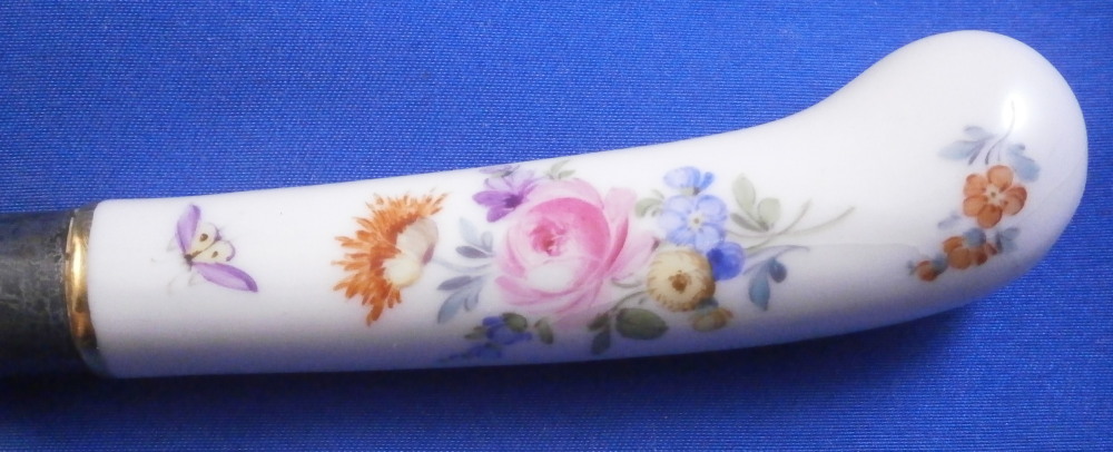 This is a nice porcelain handled knife made by Meissen in the late 19th century. The porcelain handle is hand painted with two very nice floral arrangements as well as a two single flowers, two bugs and the a gold trim near the ferrule part. The ferrule appears to be made of silver and the blade is made from steel. Nice shape to the blade. The piece is not marked but that is normal as the mark would be where the ferrule is placed. The quality of the hand painted flwoers easily gives this away as a Meissen example! The knife displays nicely but there are some use marks and oxidation to the metal parts and the porcelain handle has some tight hairlines to it as shown. It displays nicely but it's sadly damaged even if its hard to spot. It still is solid and still a nice example and a beautiful design to find on a knife! The piece is about 9.75 inches long with the visible porcelain being about 3.5 inches long. Please email me for more information or other pictures.