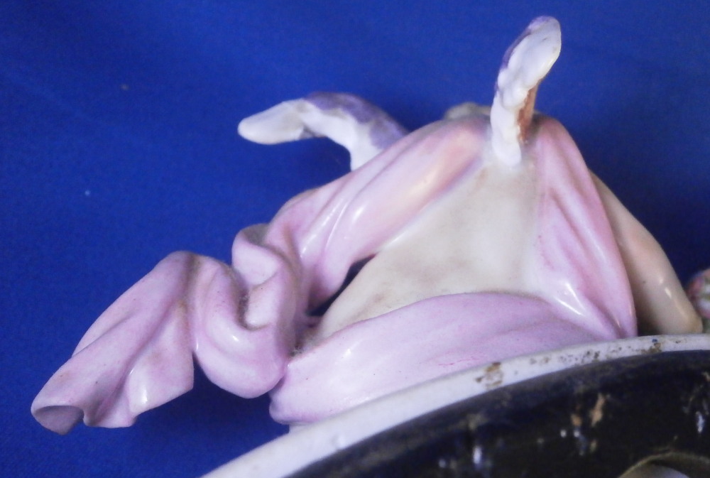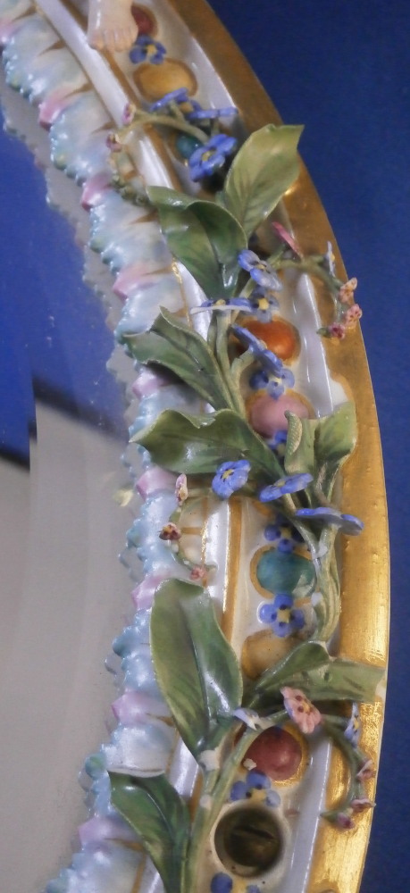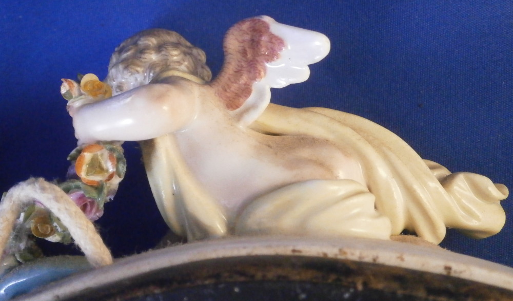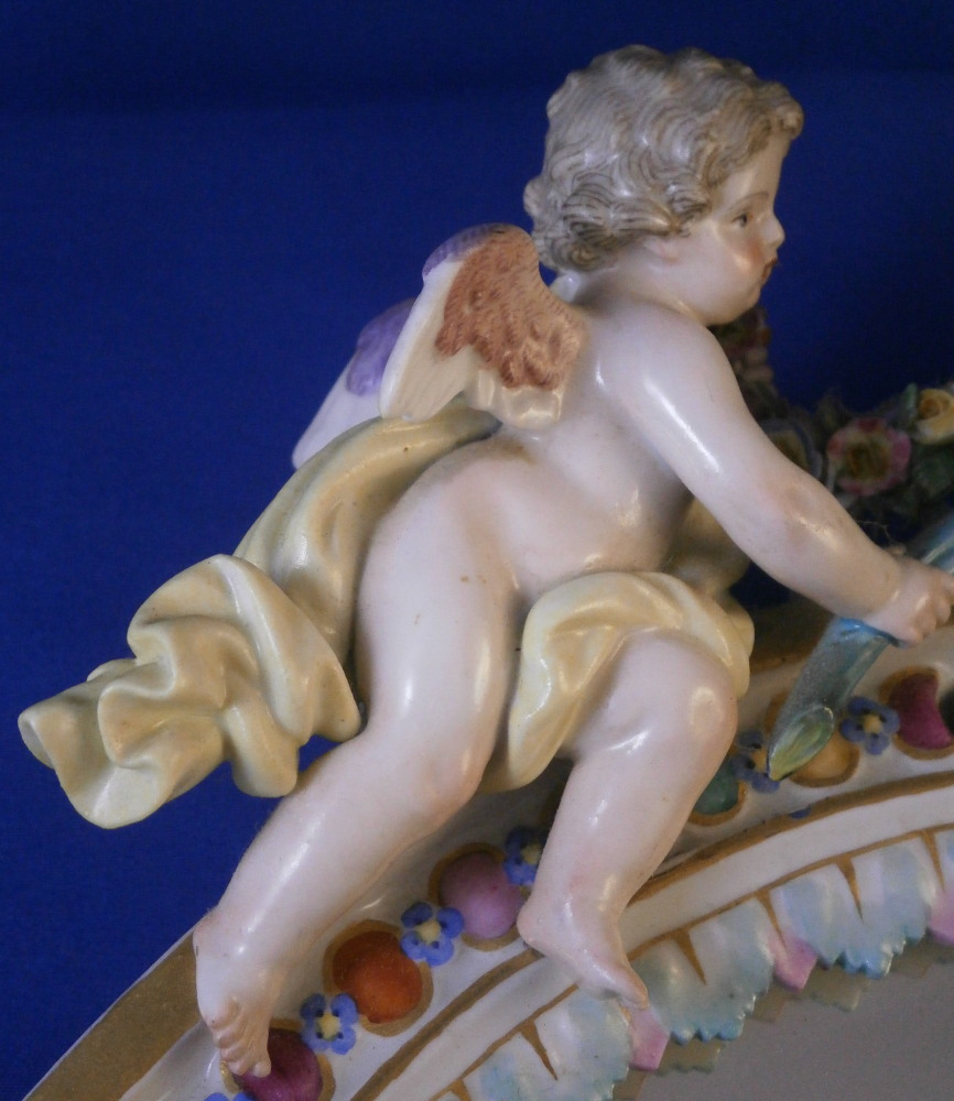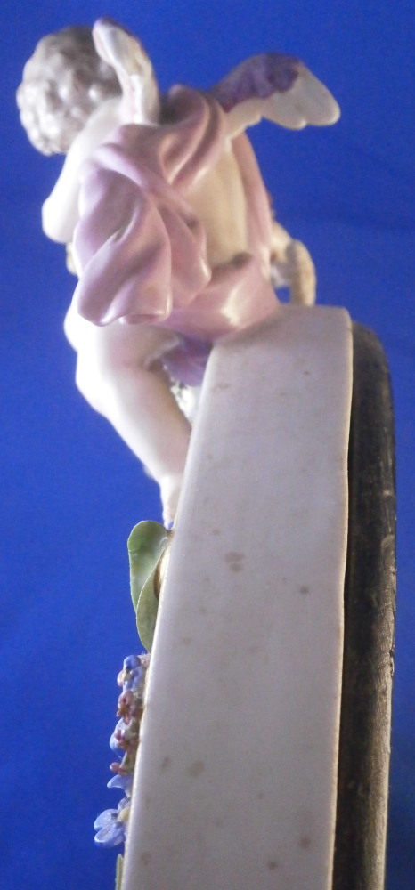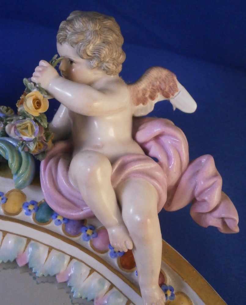 This is a really frame made by Meissen in the mid to late 19th century. This is one of the larger sizes and comes with a mirror but I hae also seen them used for clocks, etc. This is a nice version with the attached forget me not flowers applied to the main frame part. The oval frame part is nicely modeled and hand painted. It has little oval colorful spots to it with tiny forgetmenots in between them, a pink and turquoise pointy trim to the inner edge facing the mirror and some gold trim. The sides and bottom have the applied blossoms and leaves to it and there is a pink bow on the bottom. There are two cherubs sitting on top of the frame that are holding a floral garland between them. One has a pink cloth draped over it and the other a light yellow one. It's a nice piece and in decent condition but has been damaged, one of the wings of the pink cherub is reglued and the other has the tip reglued and the forget me not flowers and leaves have damage thoughout as I am showing in the pictures. The garland has a chip or two but is in nice condition. All in all not terrible and still looks nice on displays. Would be a fun project for a good restorer! The entire piece is about 13 inches tall, 9.75 inches wide and 2.625 inches deep. The visible opening where the mirror is, is about 8.75 inches tall and 7.25 inches wide but there is about a quarter inch of extra room all around in the back for whatever you want to show off. The piece is marked to the top between the cherubs with the under glaze blue crossed swords mark (first choice). The frame has four screw holes (one screw is missing) that attach a wooden backing that is lackered in black. Used to have a kick stand but that is gone. The mirror is in good shape with a couple of smaller scratches to it. Please email me for more information or other pictures.