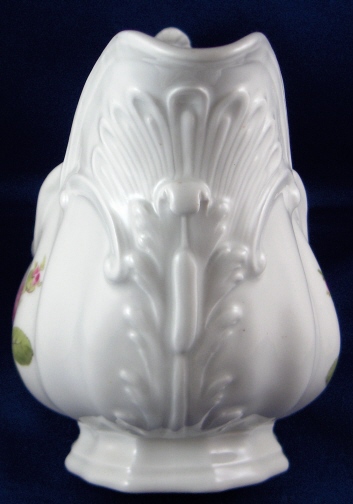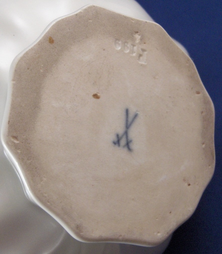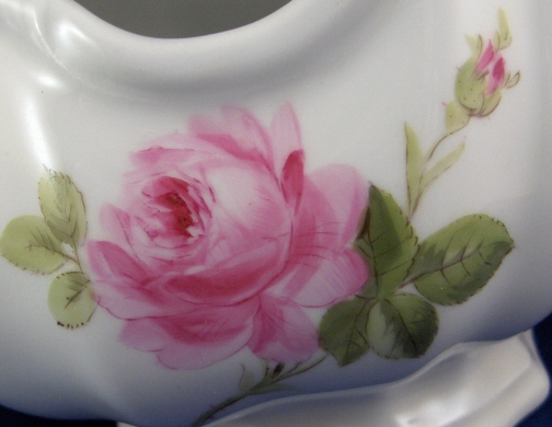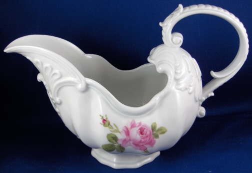 This is a fancy large sauce boat made by Meissen around 1900. It is handpainted with a large Rose with its leaves and a flower bud on either side and has lots of relief work to the porcelain itself plus a really nice shape one does not see very often! The dish is marked to the bottom with the underglaze blue crossed swords mark as well as the usual impressed marks. The sauce boat is in perfect condition. It is 6.125 inches tall, 9.5 inches long and 4.5 inches wide. Please email me for more information or other pictures.