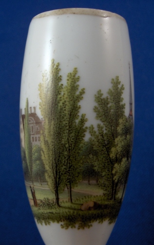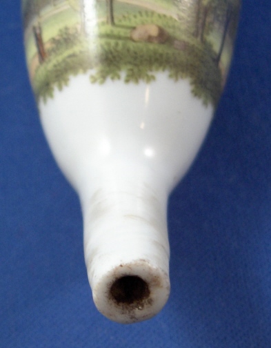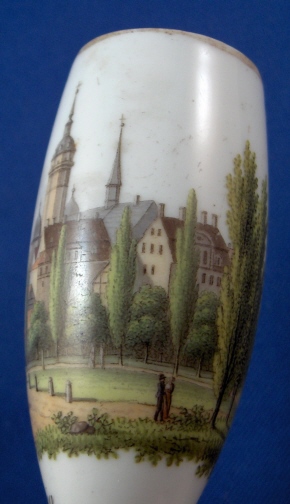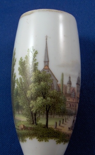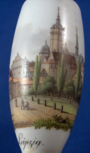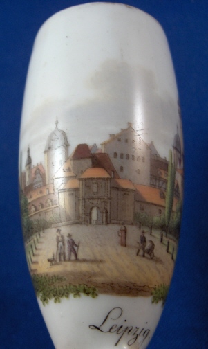 This is a porcelain pipe bowl made by Meissen in the 19th century. It is handpainted with a very detailed scene of the city of Leipzig including buldings, people and trees. Quite an amazing little scene! It is rare to find Meissen pipes with city scenes on it. This one is marked on the inside with the crossed swords in underglaze blue, the name of the city underneath the scene and an impressed number 33 on the little part that sticks out the front. The pipe is in superb condition with a small brown spot in the front underneath the part that sticks out - looks like the glaze didn't take there and it stained over the years. No big deal. Also a tiny bit of wear from use but like I said very minor. It was smoked quite a bit and is thus dirty on the inside. The bowl is 3.75 inches long and has a top diameter 1.125 inches. Please email me for more information or other pictures.