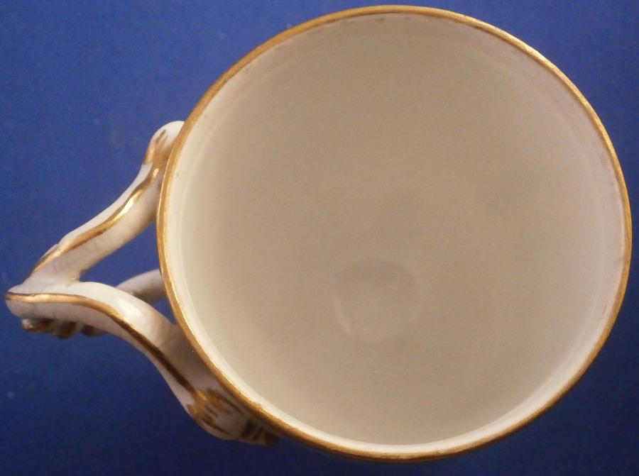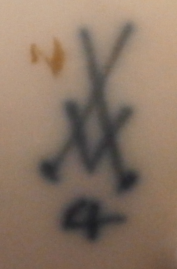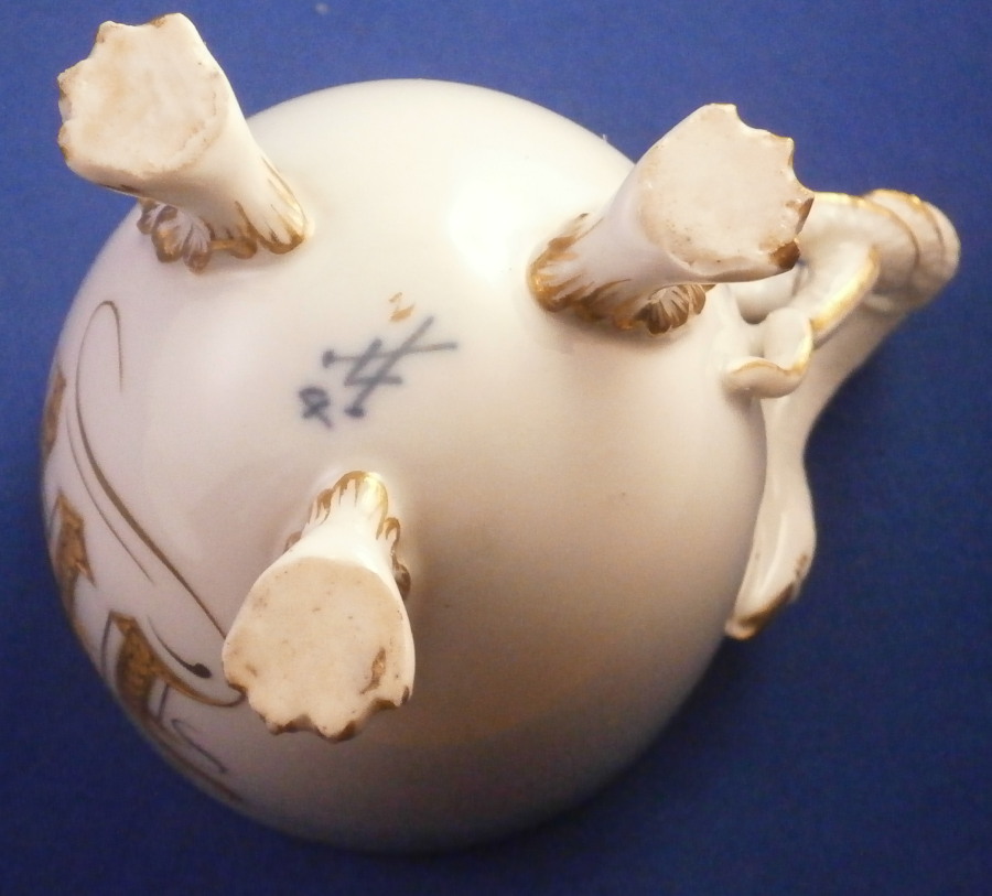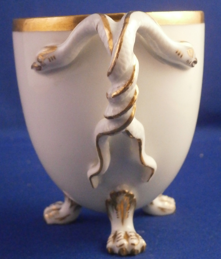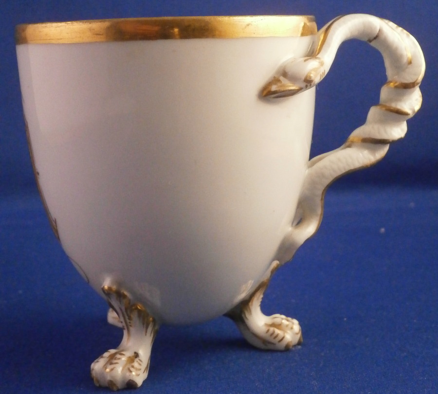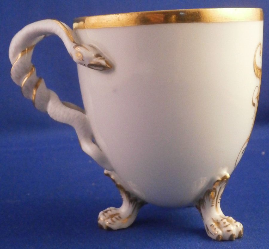 This is a nice cup and saucer made by Meissen in the earlier part of the 19th century. The saucer has the mark of the so called Schmierzeit around 1820 while the cup is just a touch leter so probably from the in between period when they switched marks. The sauce has a simple gold trim design to it as does the cup but the cup has a really nice shape to it sitting on three claw feet / paws and having an intertwined snake handle both with a touch of gilding to it. The cup also has the letter M on it which was perfect for me :) Both pieces are marked with the under glaze blue crossed swords mark underneath as shown, a blue 4 under the cup and gilder's marks to both pieces. The saucer is about 1 inch tall and 4.875 inches in diameter and the cup is just a touch over 3 inches tall with a diameter of about 2.625 inches. The saucer is in perfect condition while the cup has a small firing crack in one of the snakes as shown. The inside edge of the cup is a touch rough which indicates that it probably had a lid at some point. Please email me for more information or other pictures.